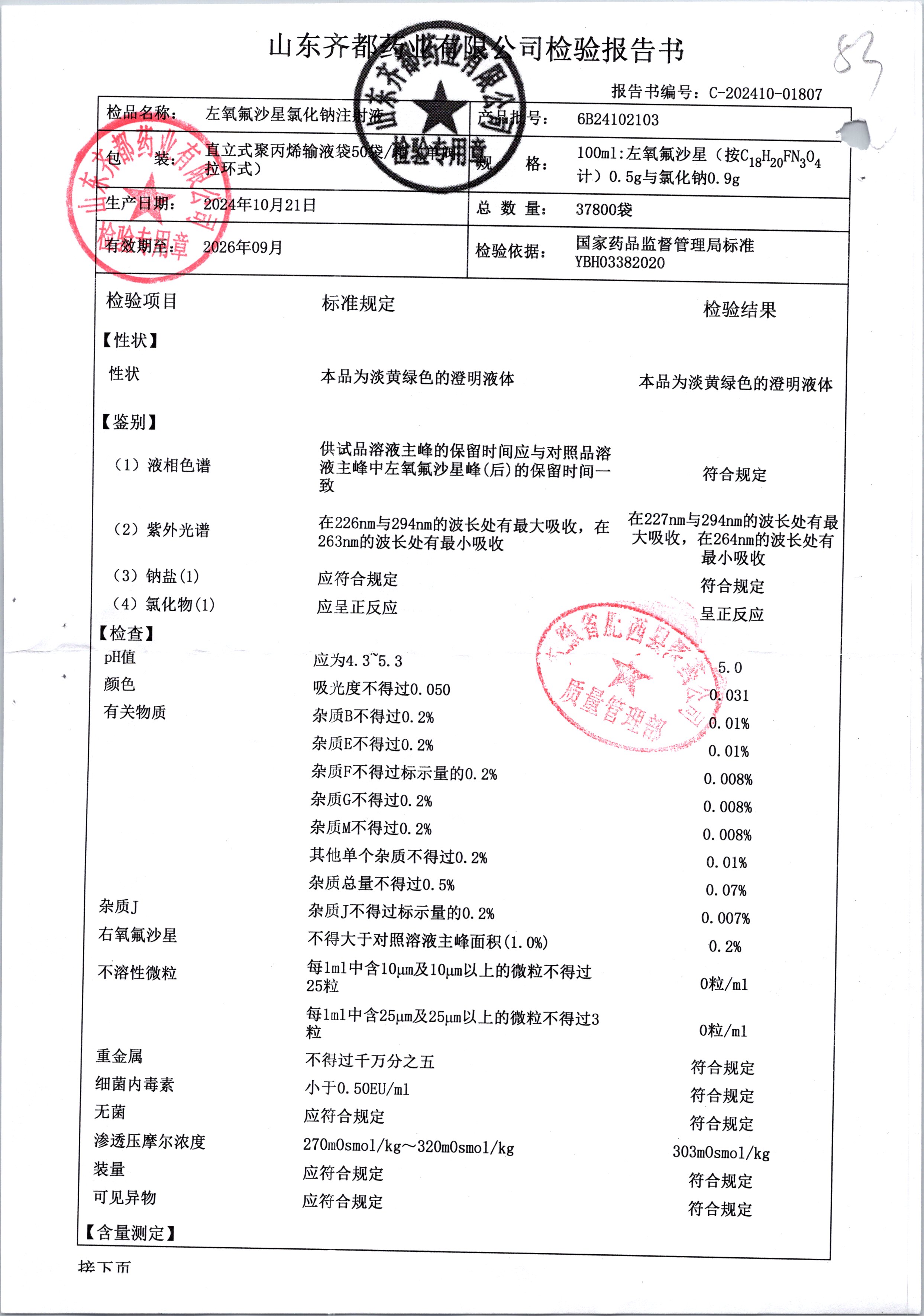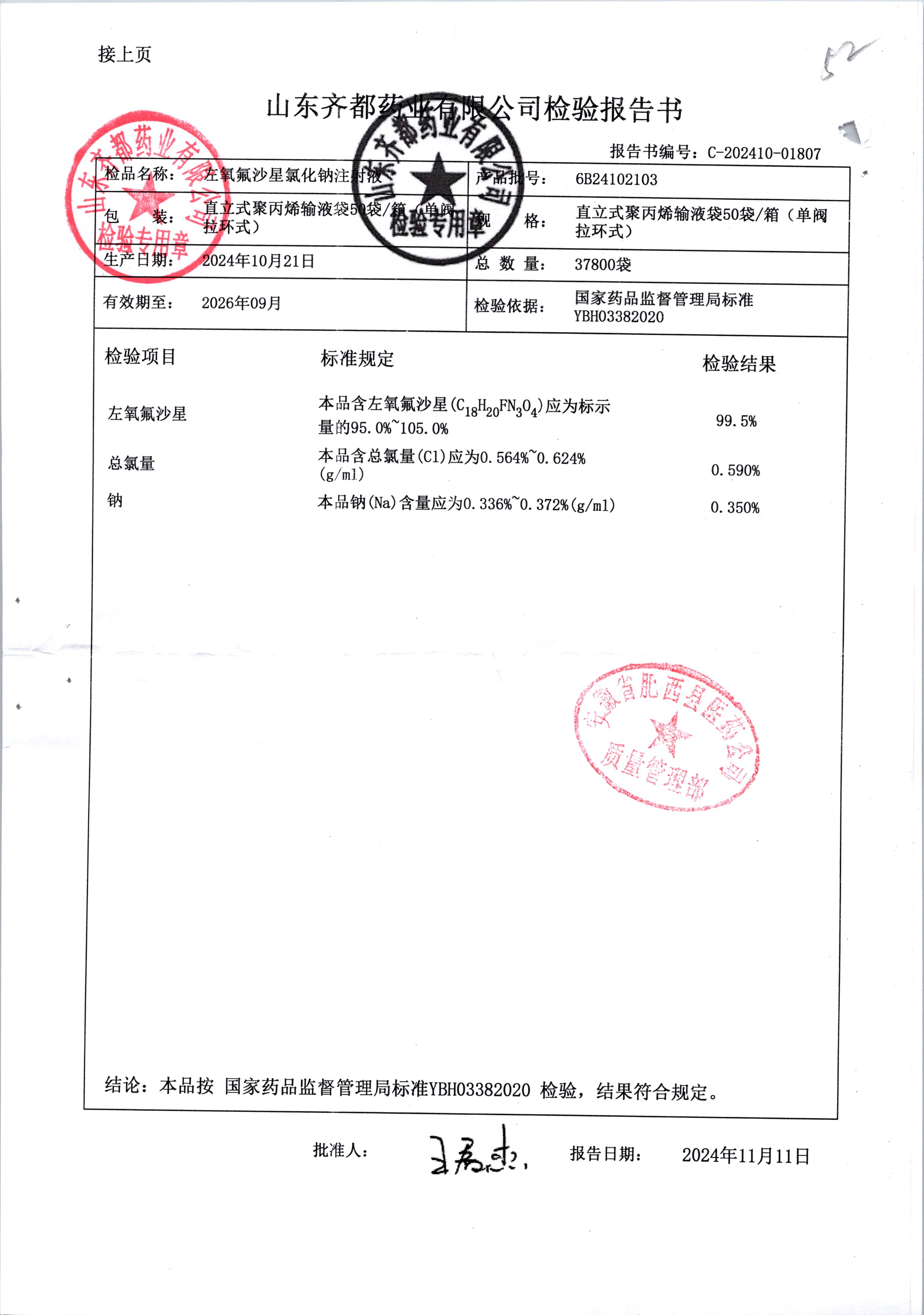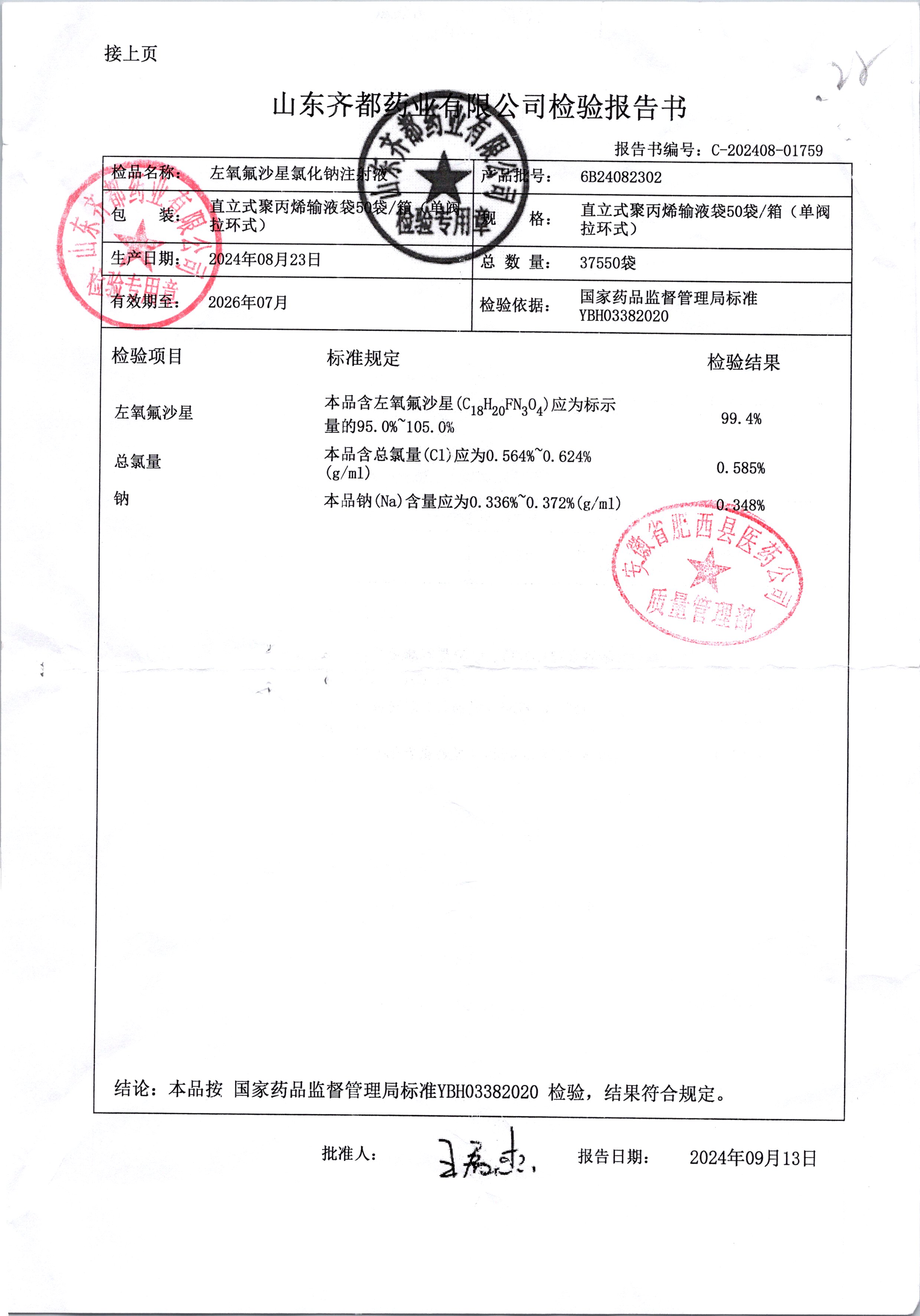 鹽酸左氧氟沙星氯化鈉注射液 50袋 6B24082302 查看詳情