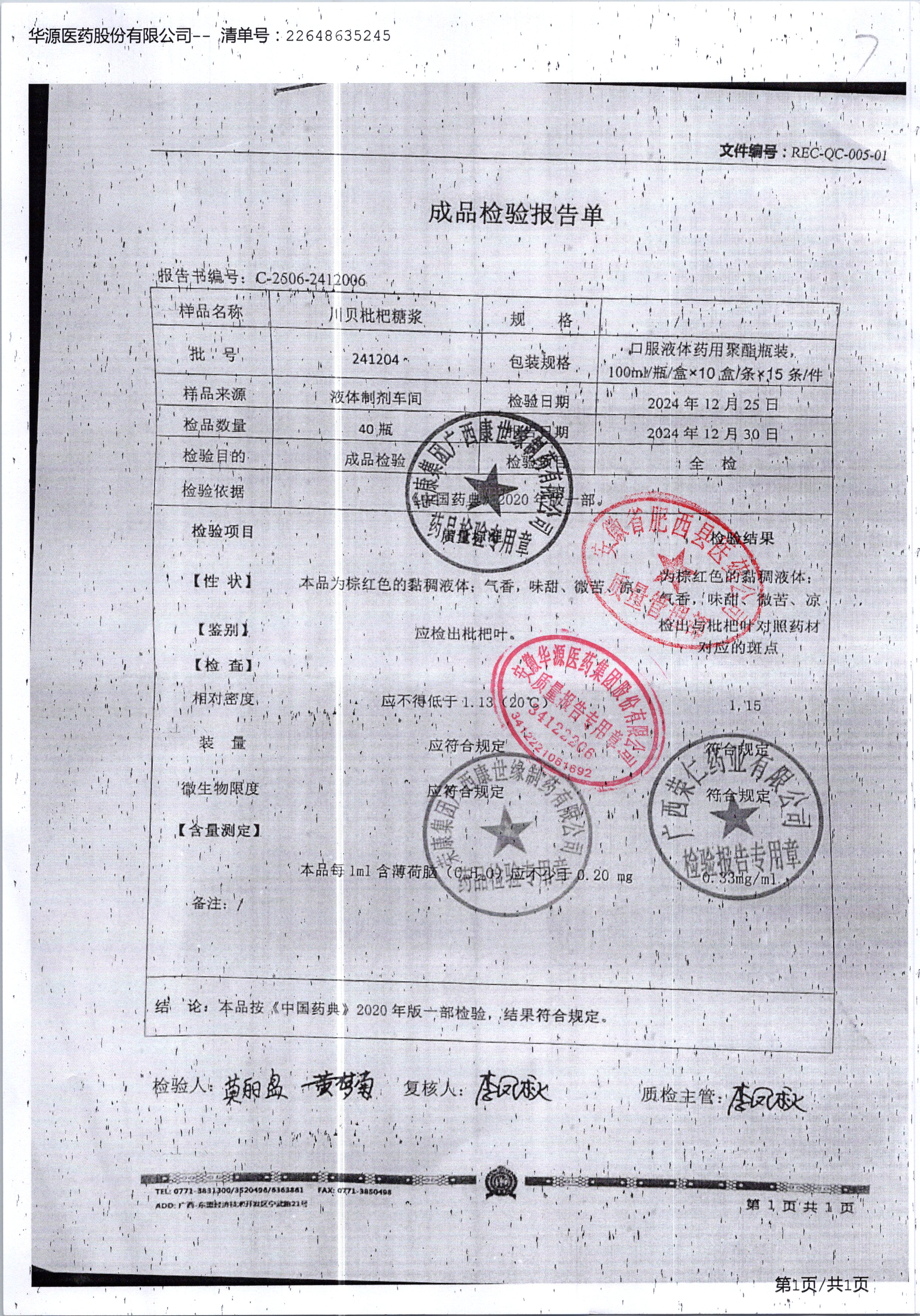 名稱 規(guī)格 批號(hào) 藥檢報(bào)告