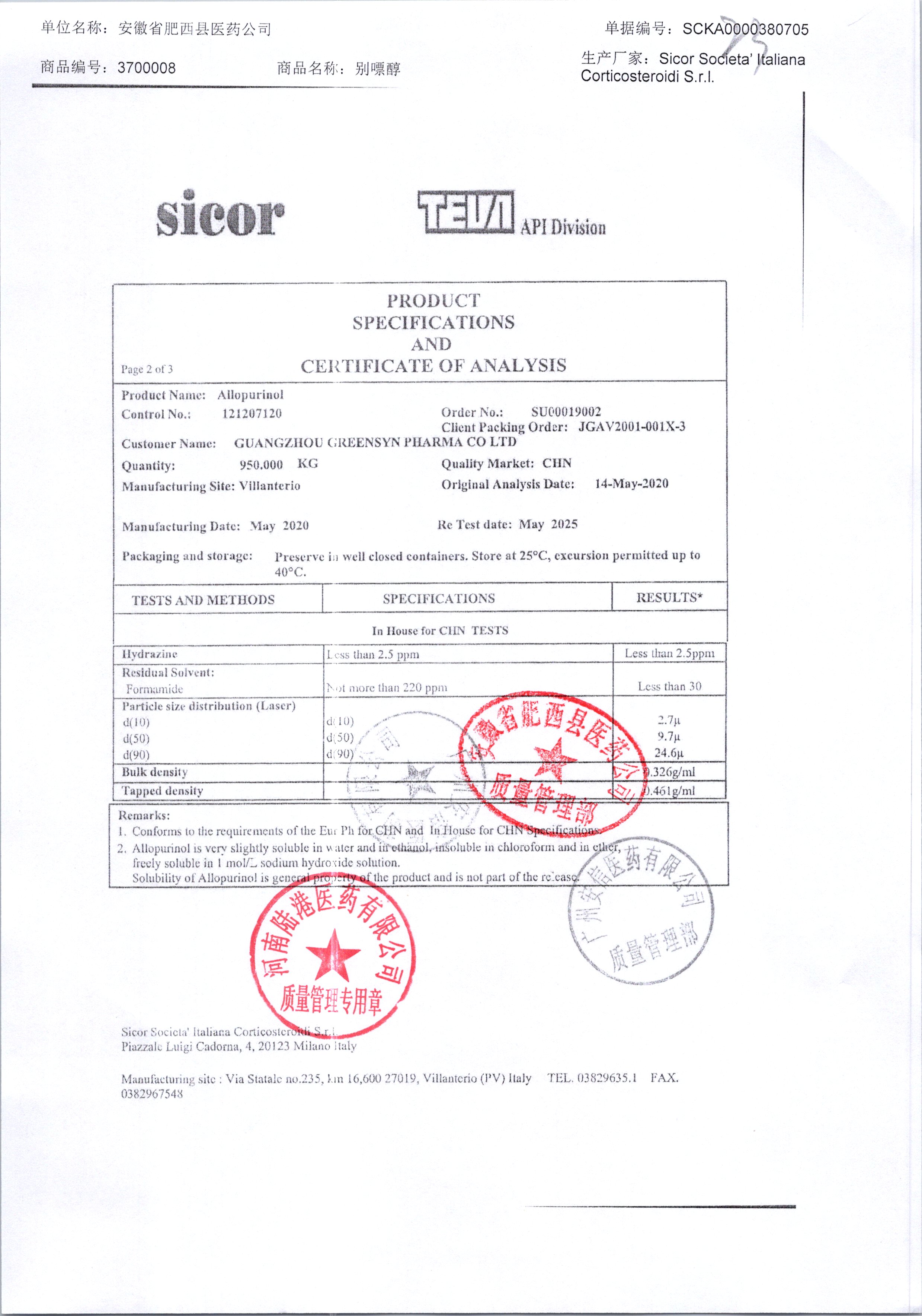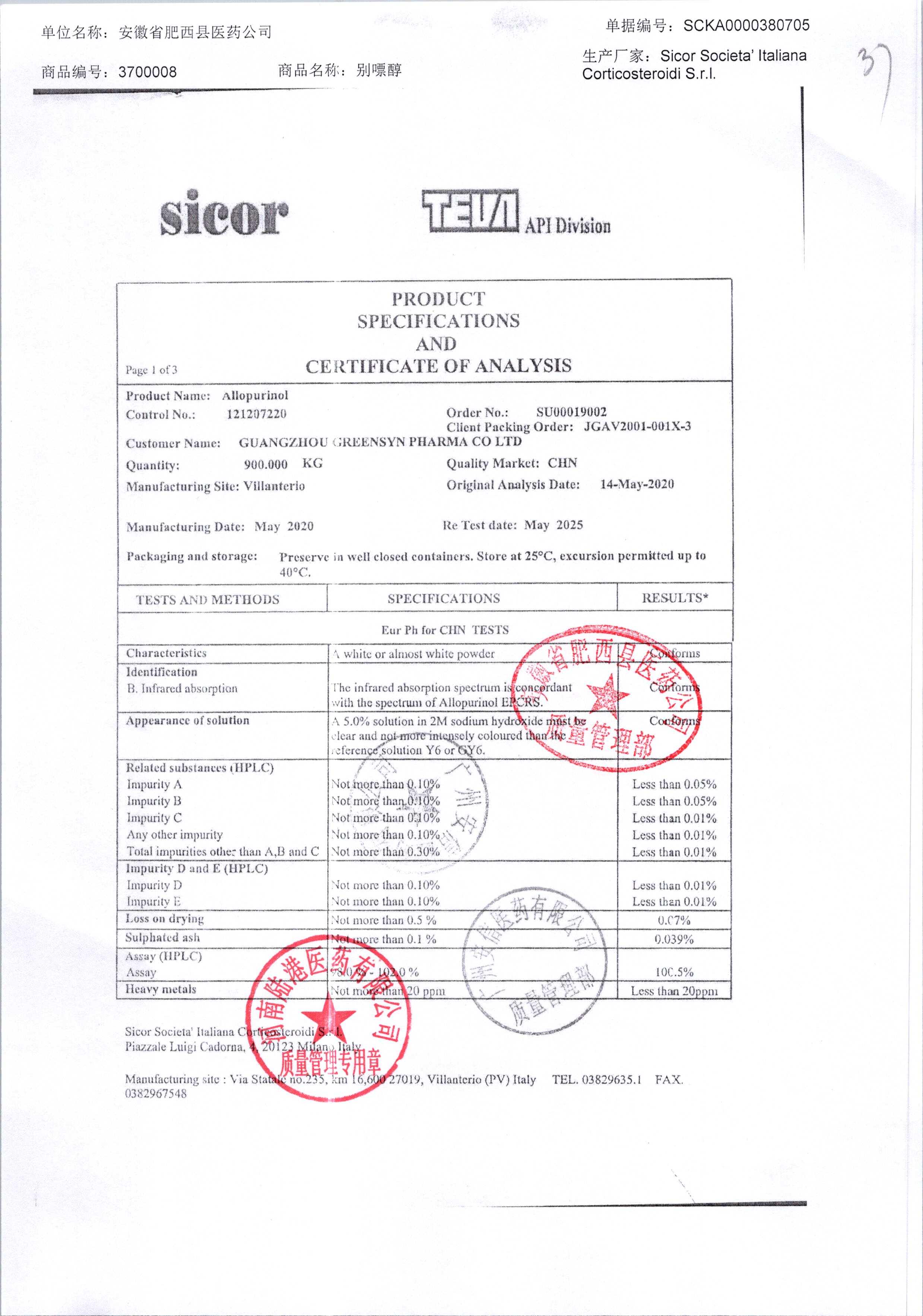 | 別嘌醇 | 25kg | 121207320/6 | 查看詳情 |