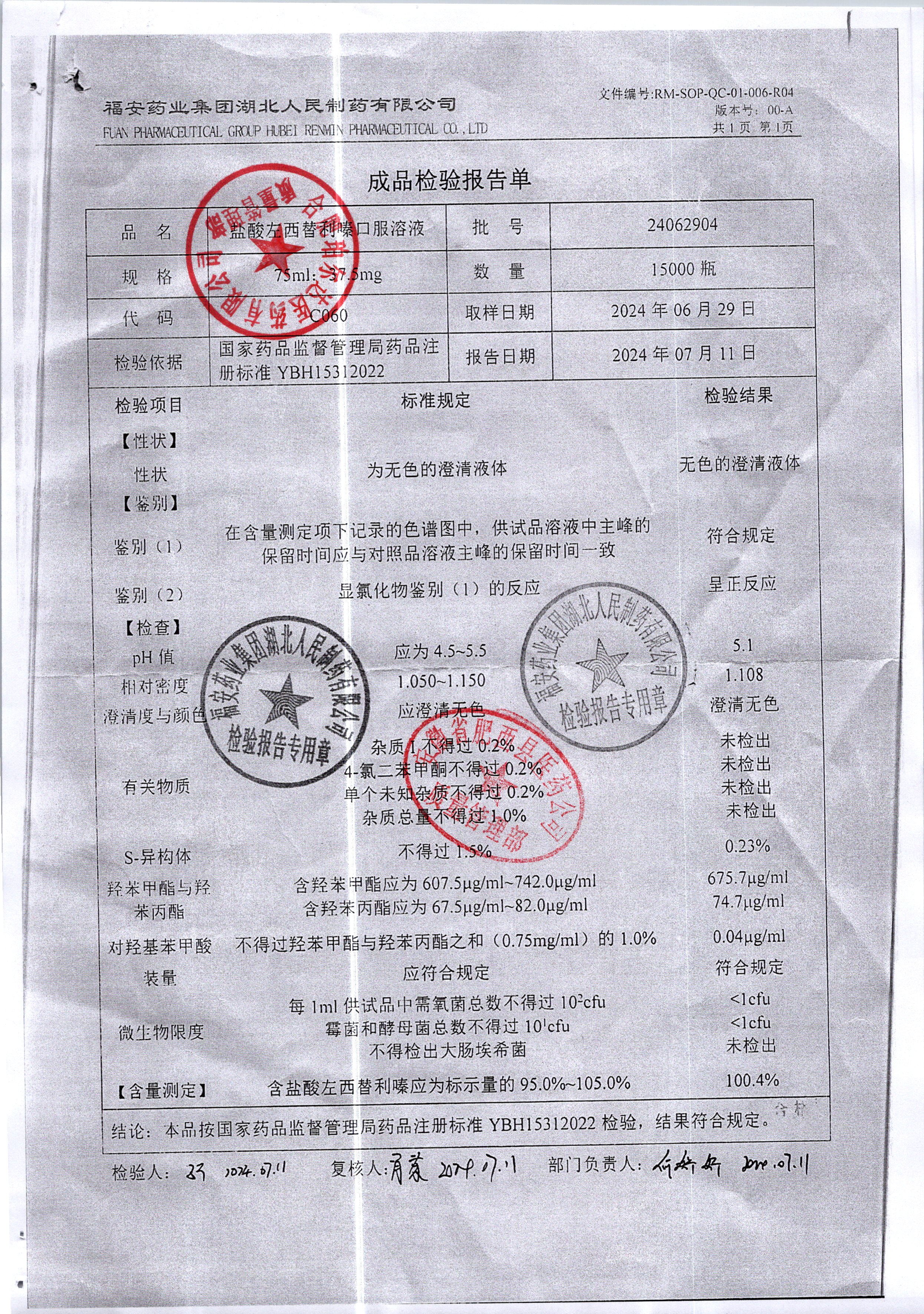 鹽酸左西替利嗪口服溶液 75mg*37.5mg 24062904 查看詳情