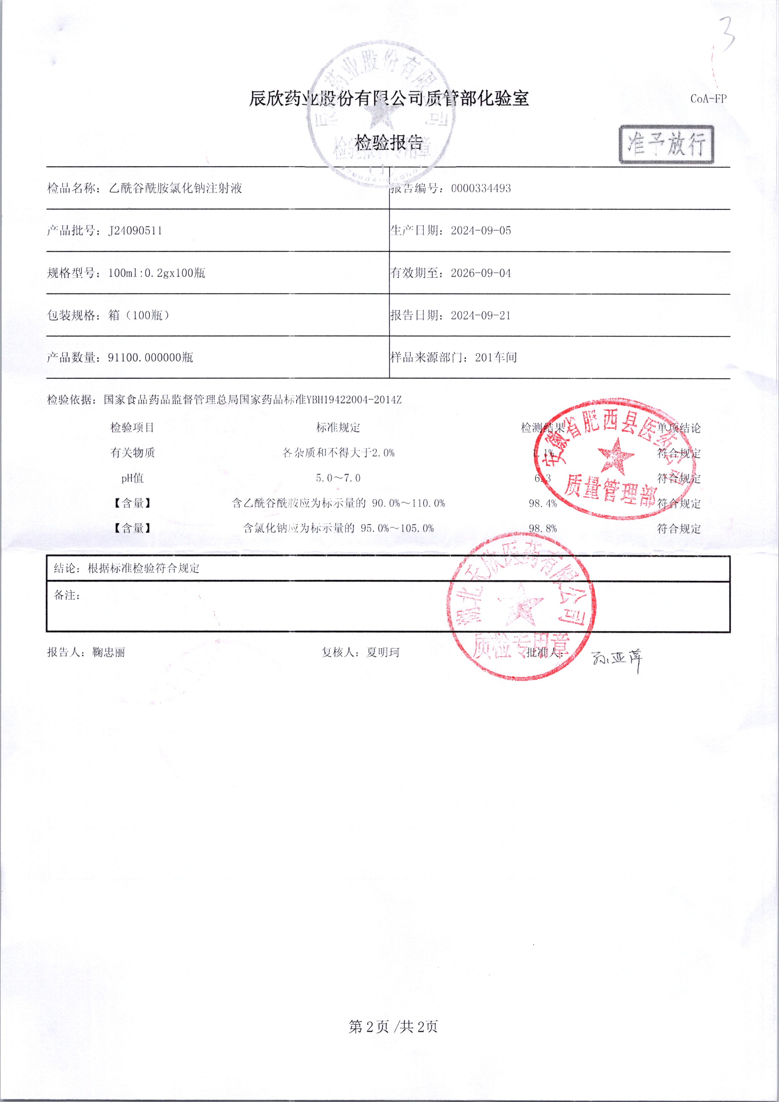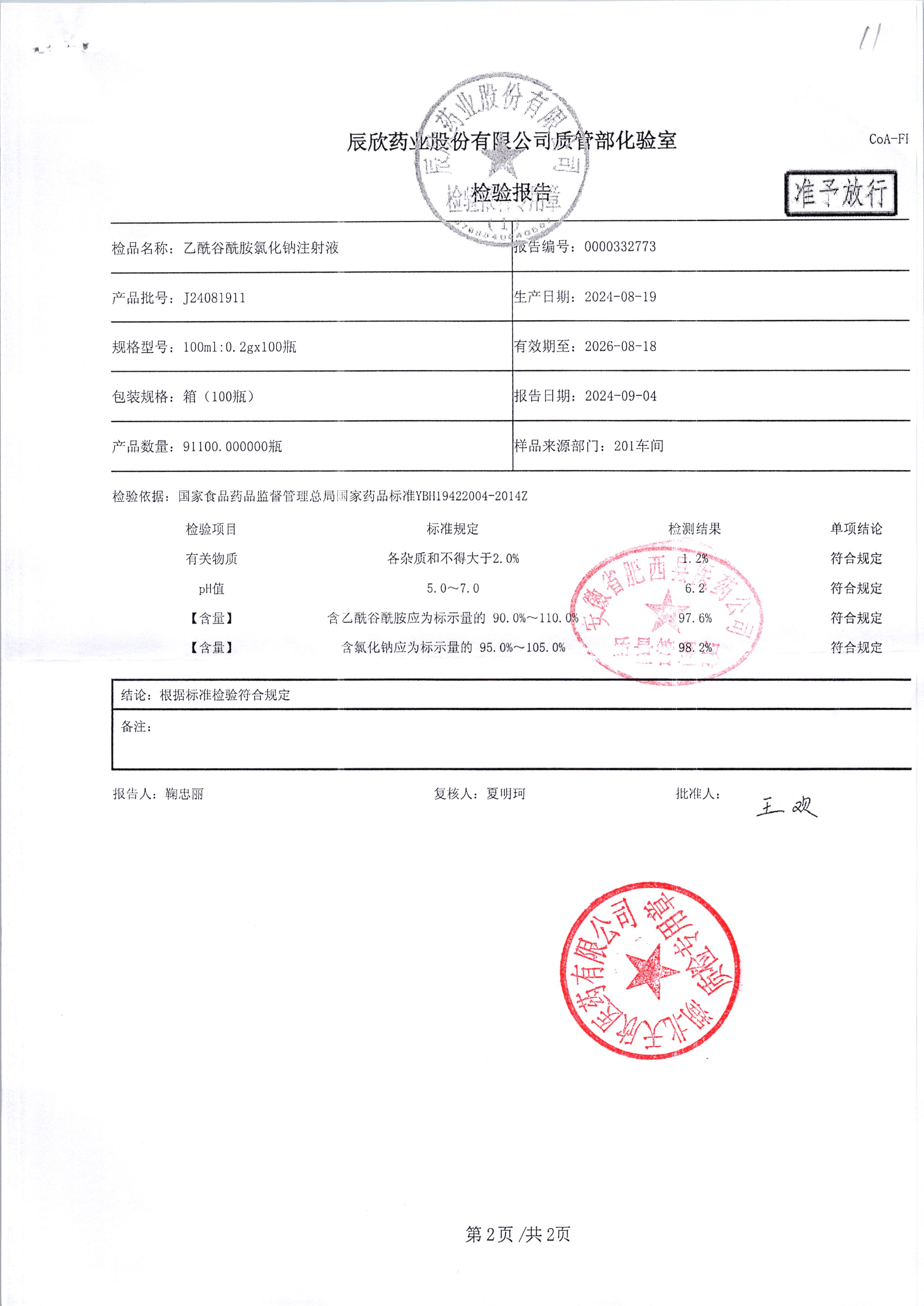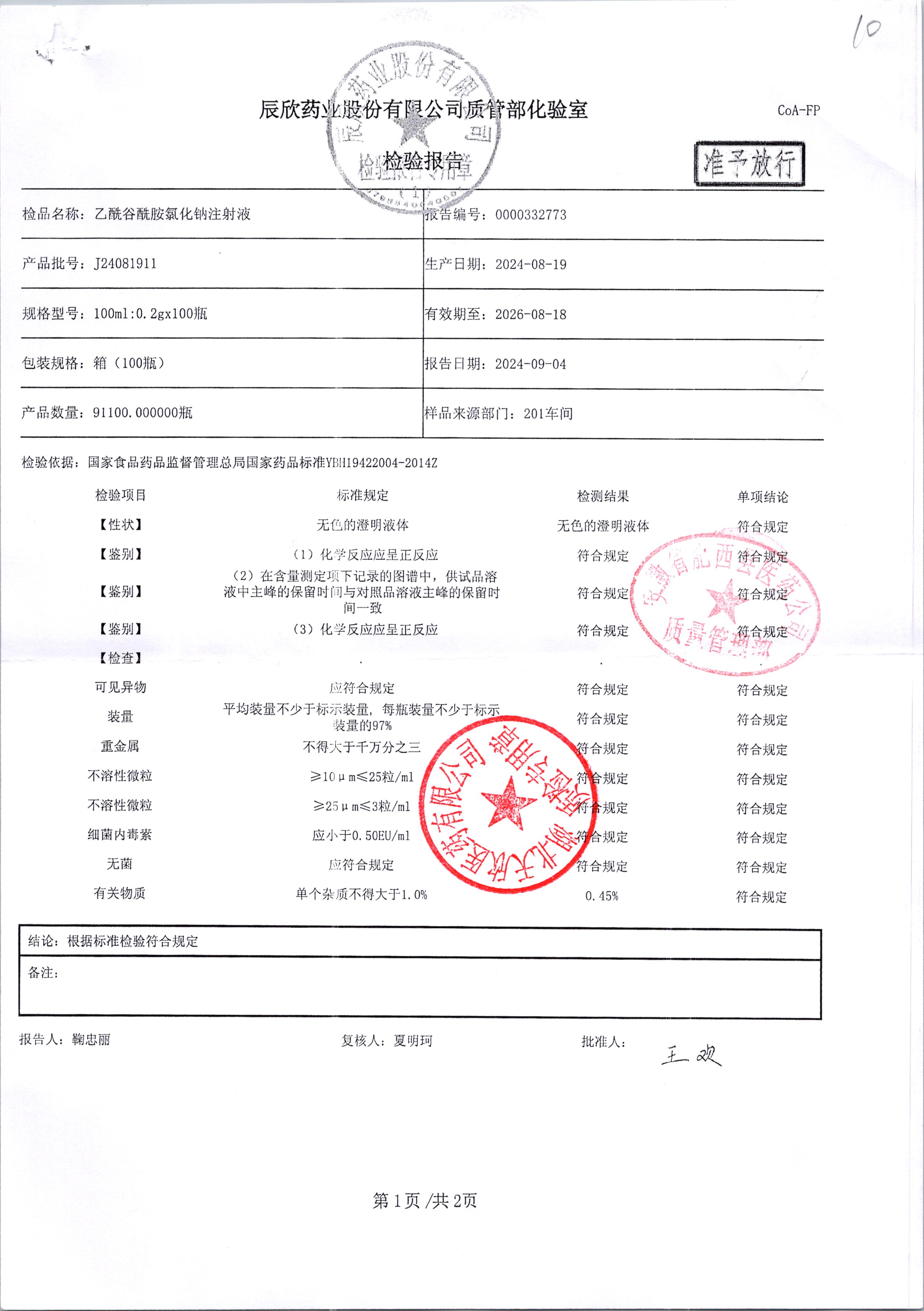 | 乙酰谷酰胺氯化鈉注射液 | 100ml:2g | J24090511/2 | 查看詳情 |