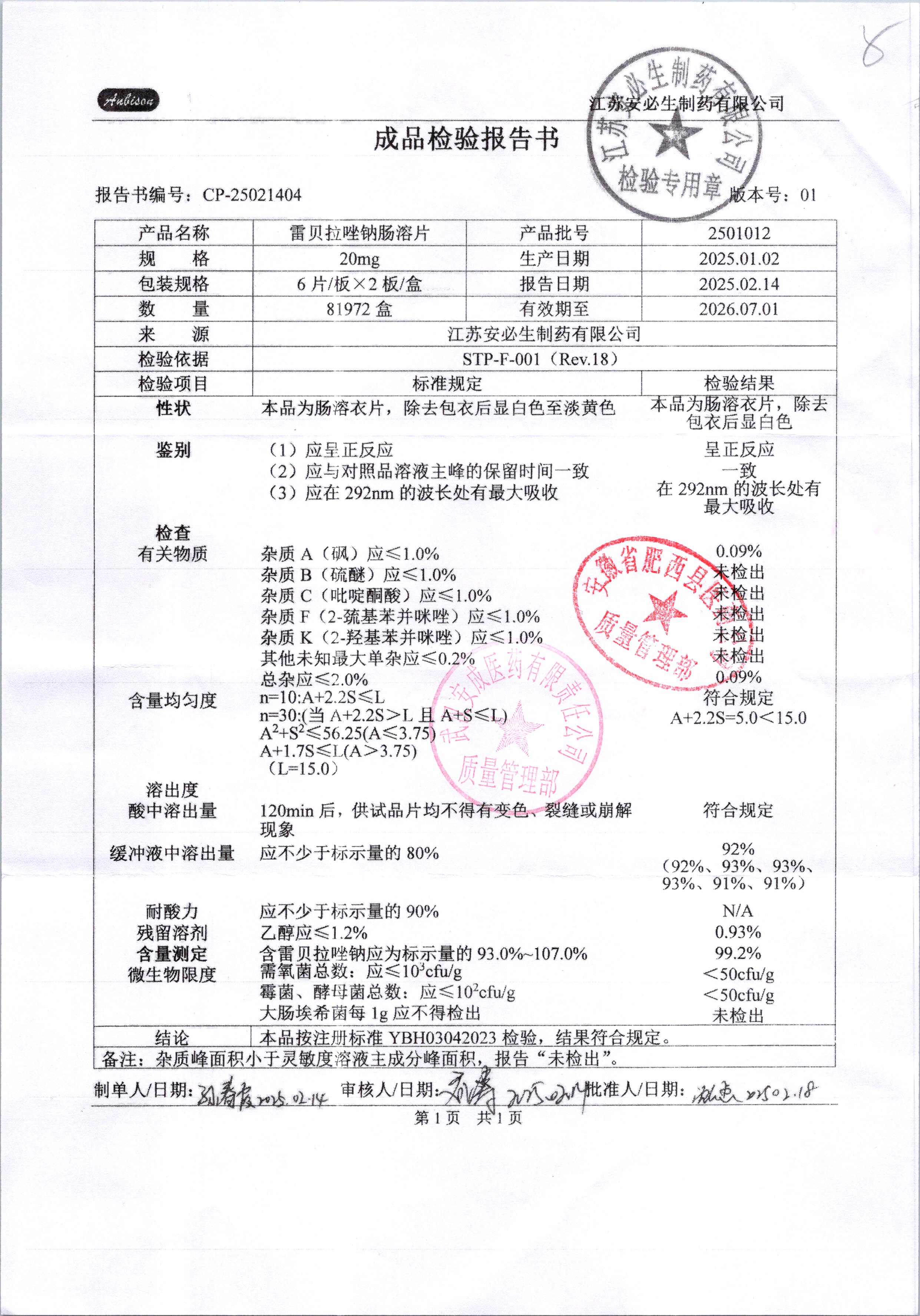 雷貝拉唑鈉腸溶片 20mg*12片 2501012 查看詳情