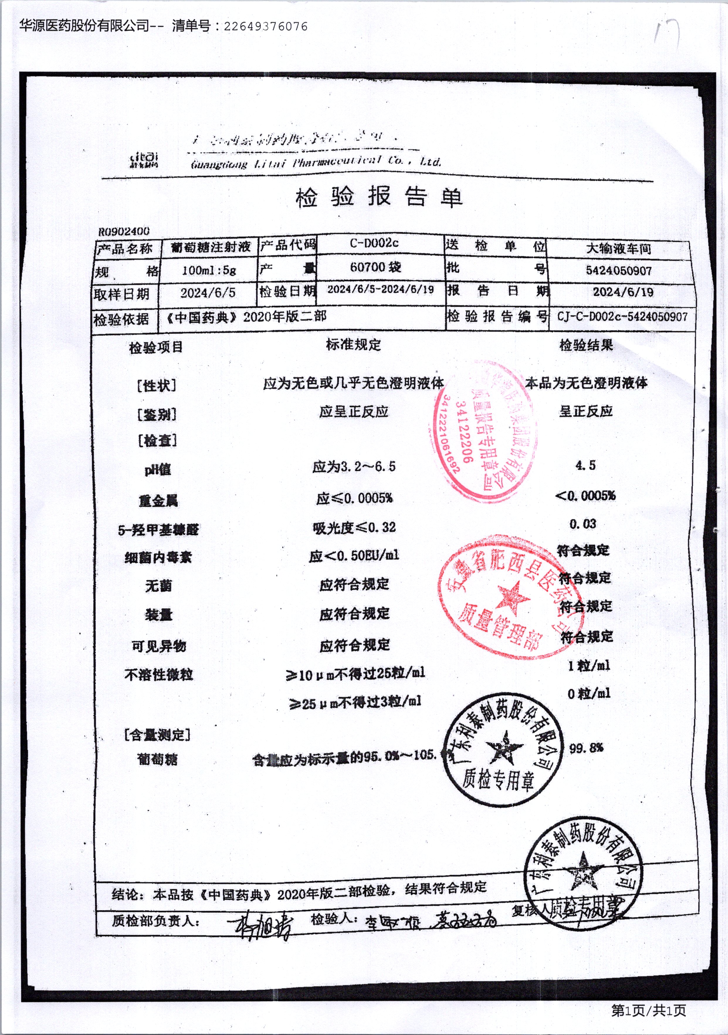 葡萄糖注射液 100ml 5424050907 查看詳情