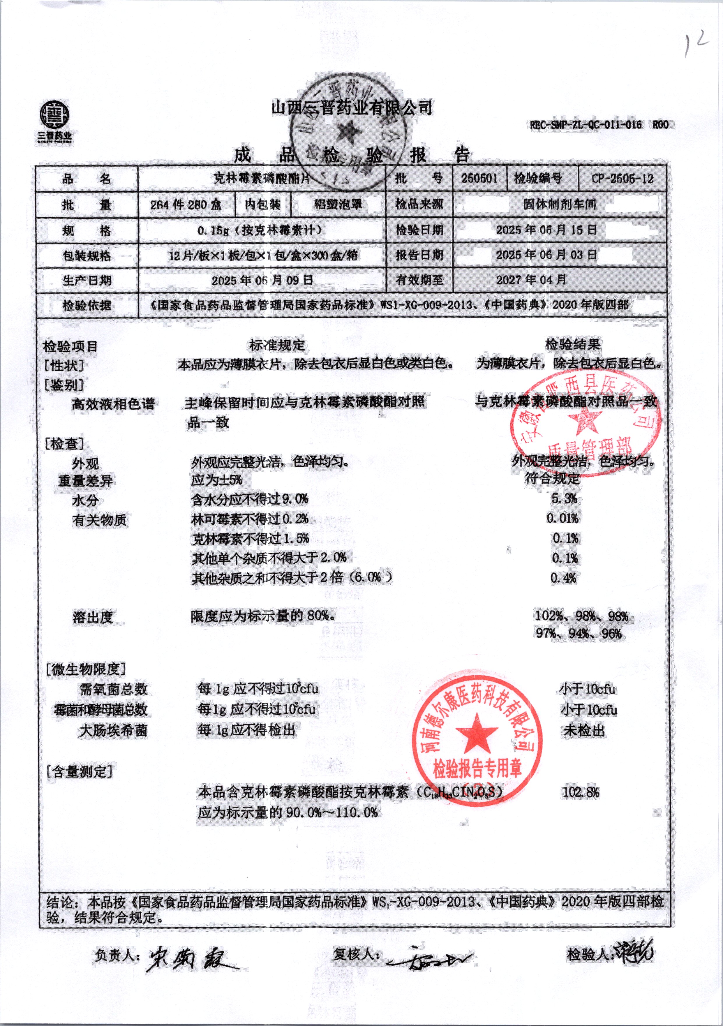 | 克林霉素磷酸酯片 | 0.15g*12片 | 250501 | 查看詳情 |