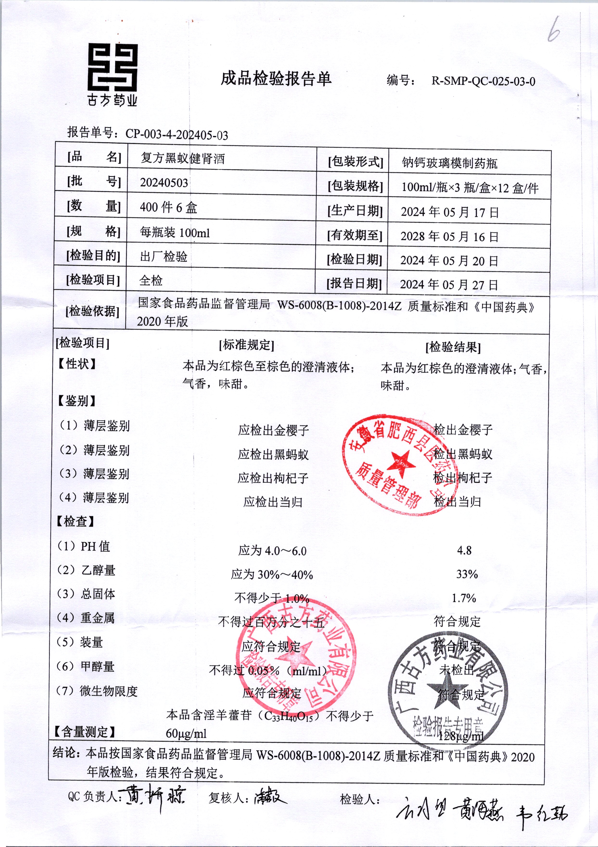 復(fù)方黑蟻健腎酒 100ml*3瓶 20240503 查看詳情