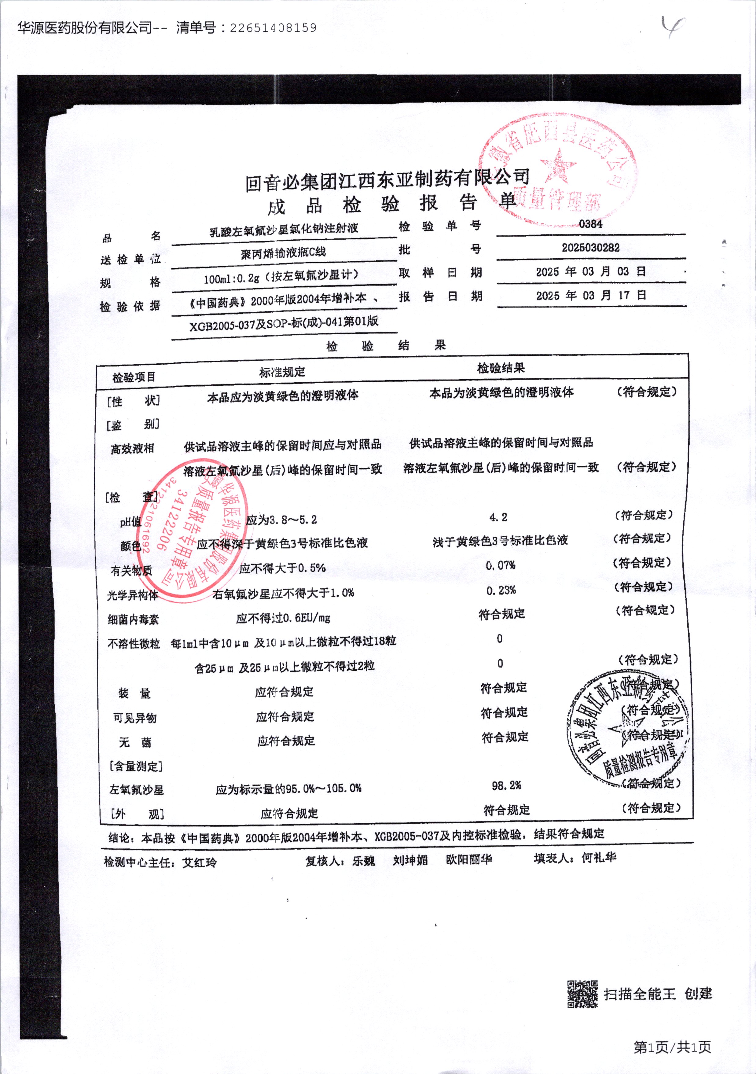 乳酸左氧氟沙星氯化鈉注射液 100ml:0.2g 2025030282 查看詳情