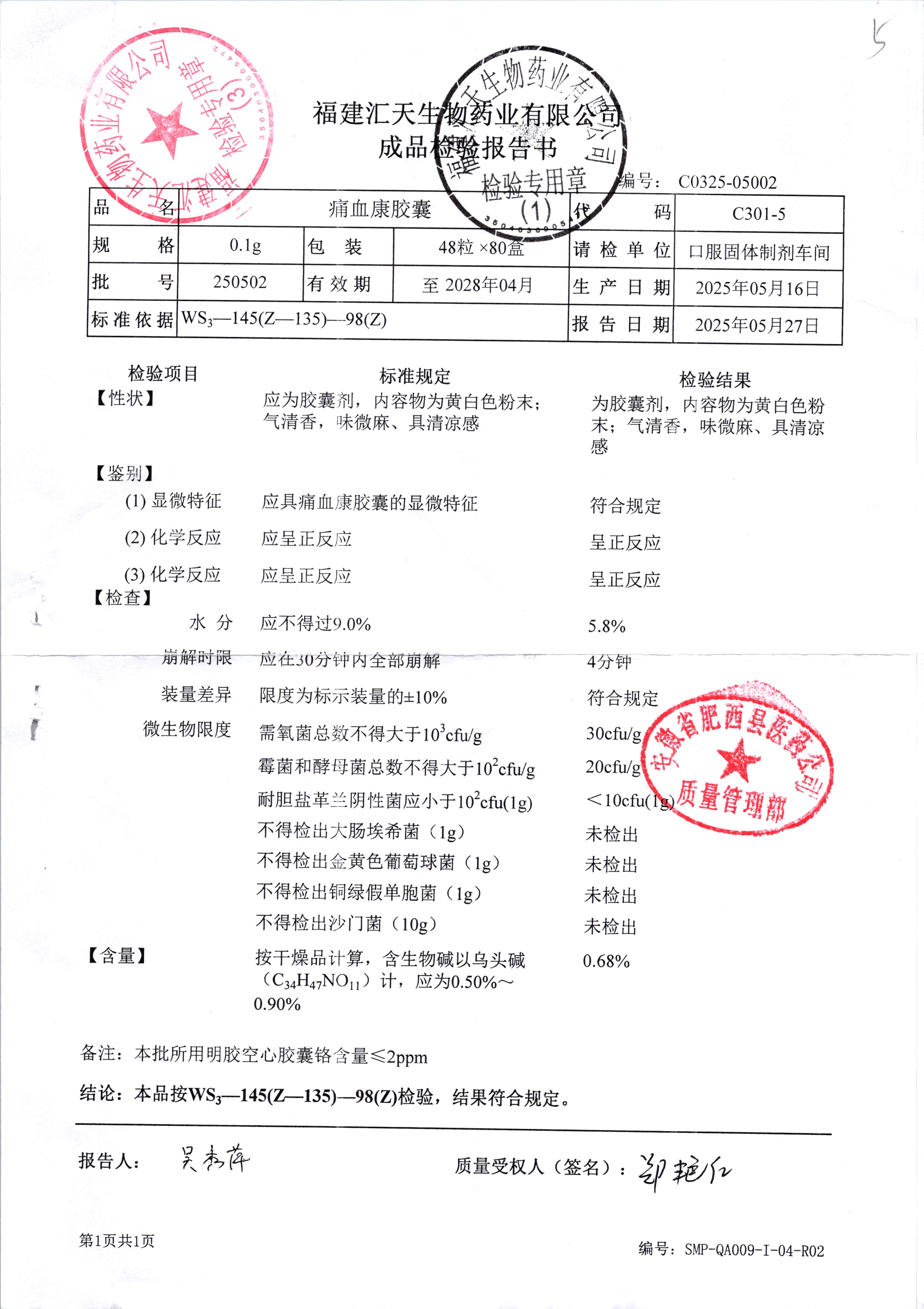 | 痛血康膠囊 | 0.1g*48粒 | 250501 | 查看詳情 |