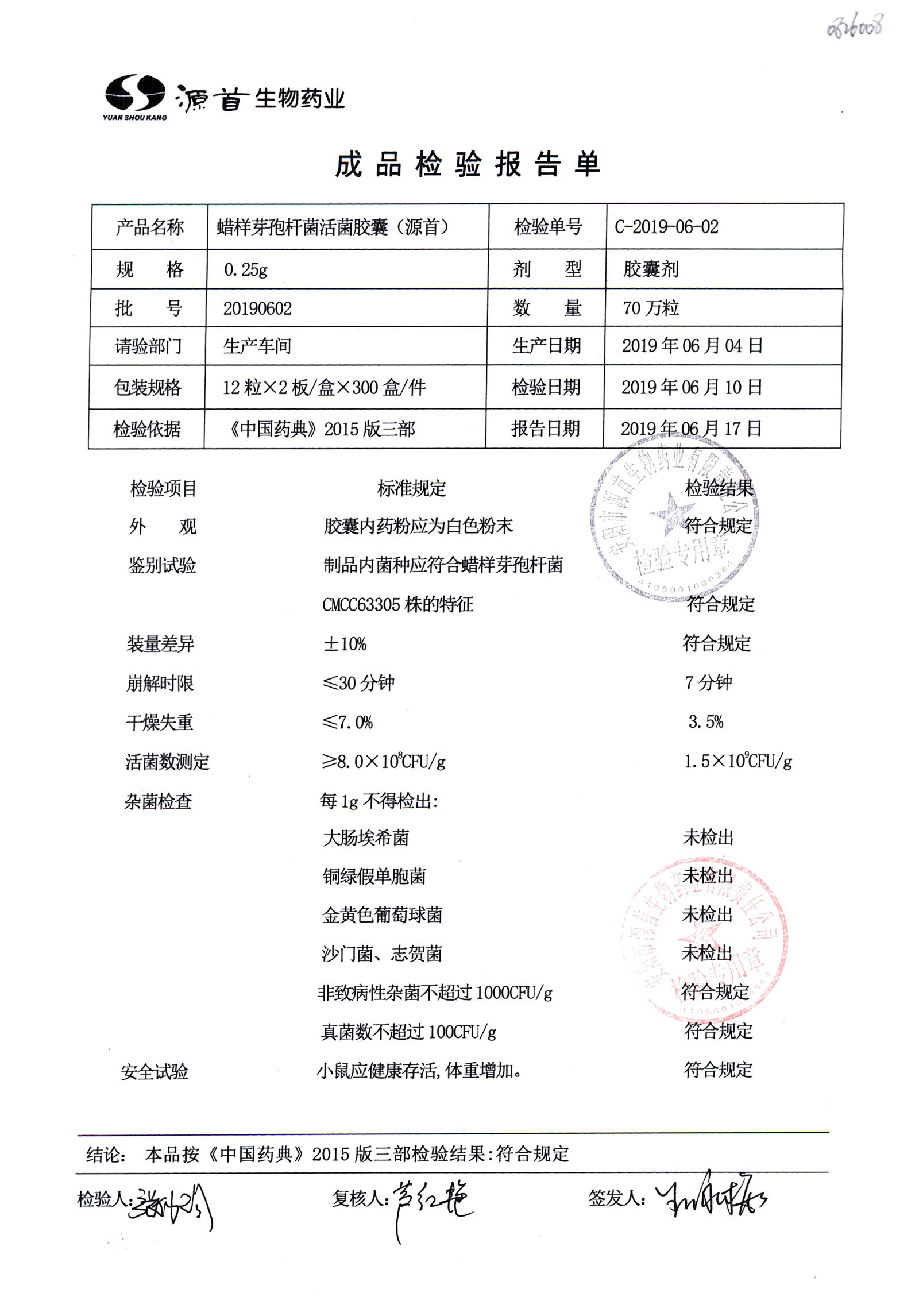 蠟樣芽孢桿菌活菌膠囊(源首) | 0.25g | 20190602(2/3) | 查看詳情 |
