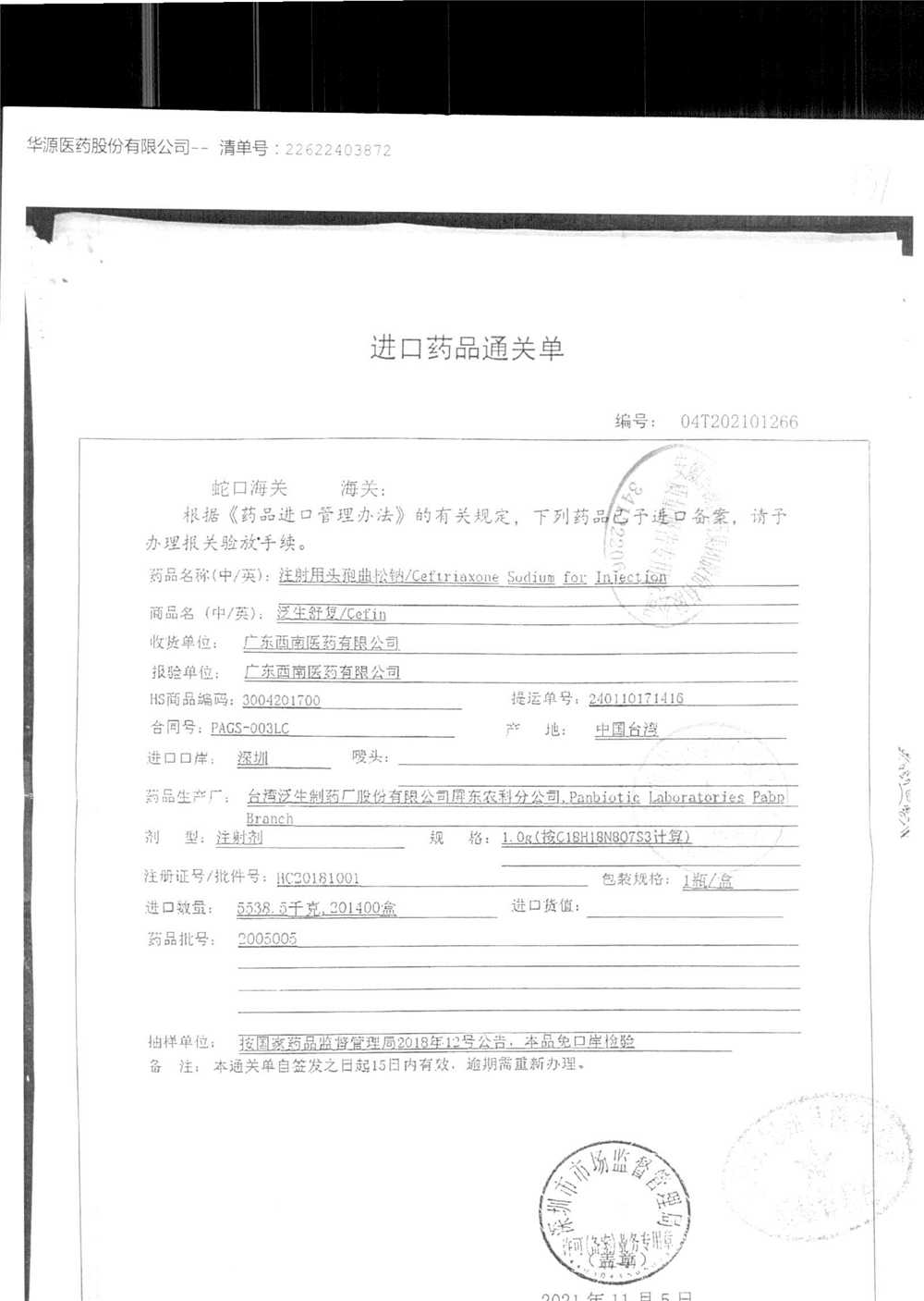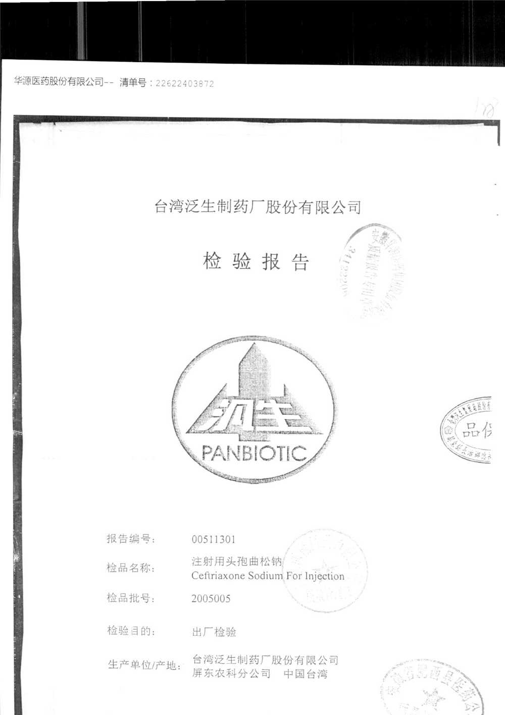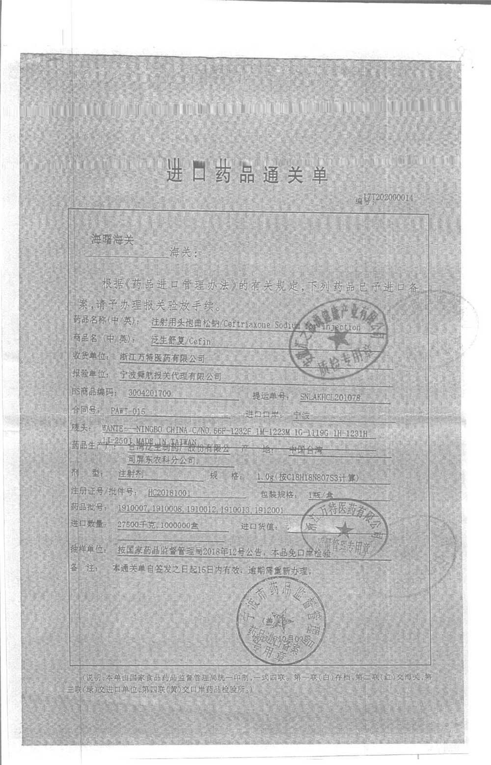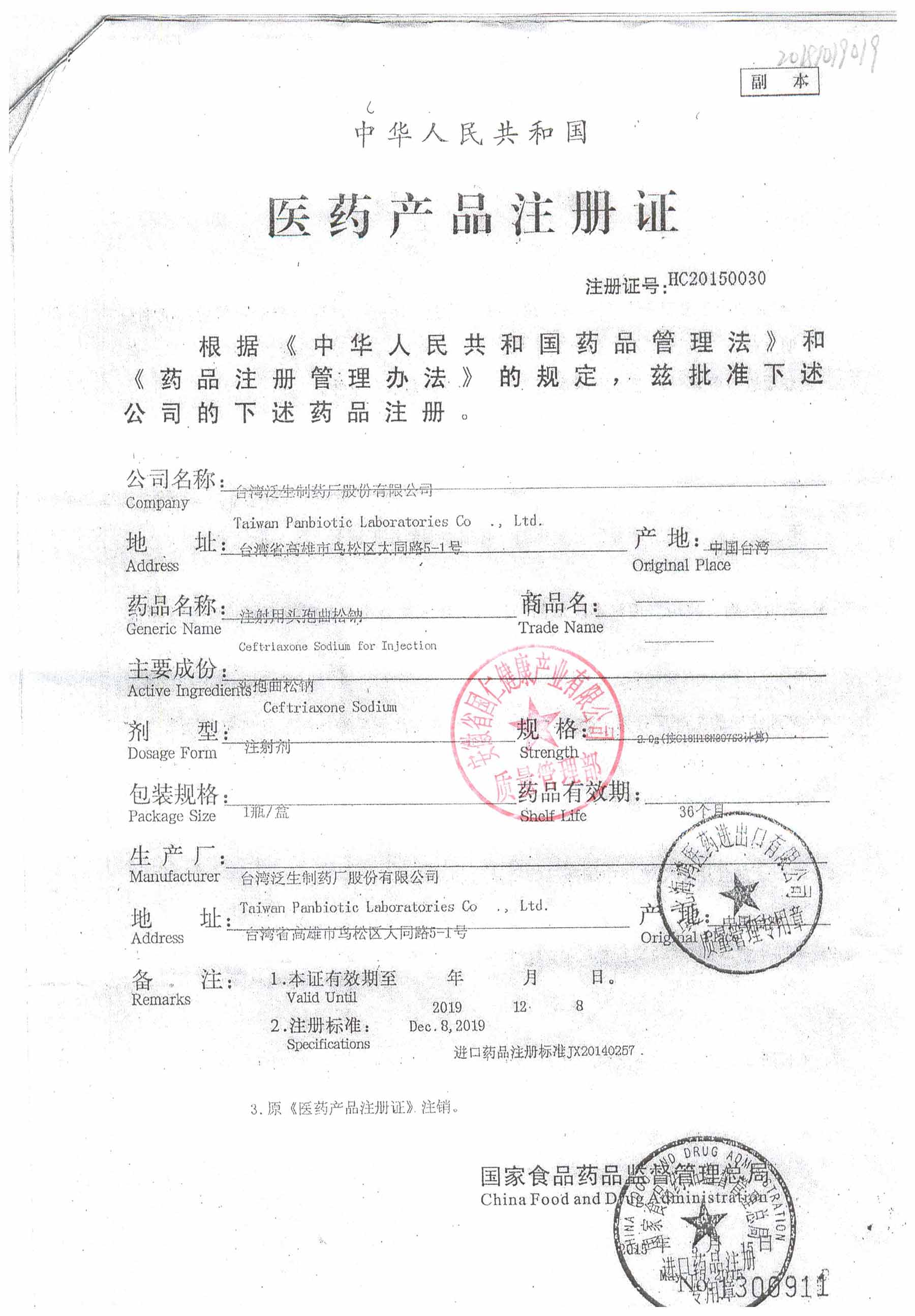 注射用頭孢曲松鈉 | 2.0g | 1903007(4/5) | 查看詳情 |
