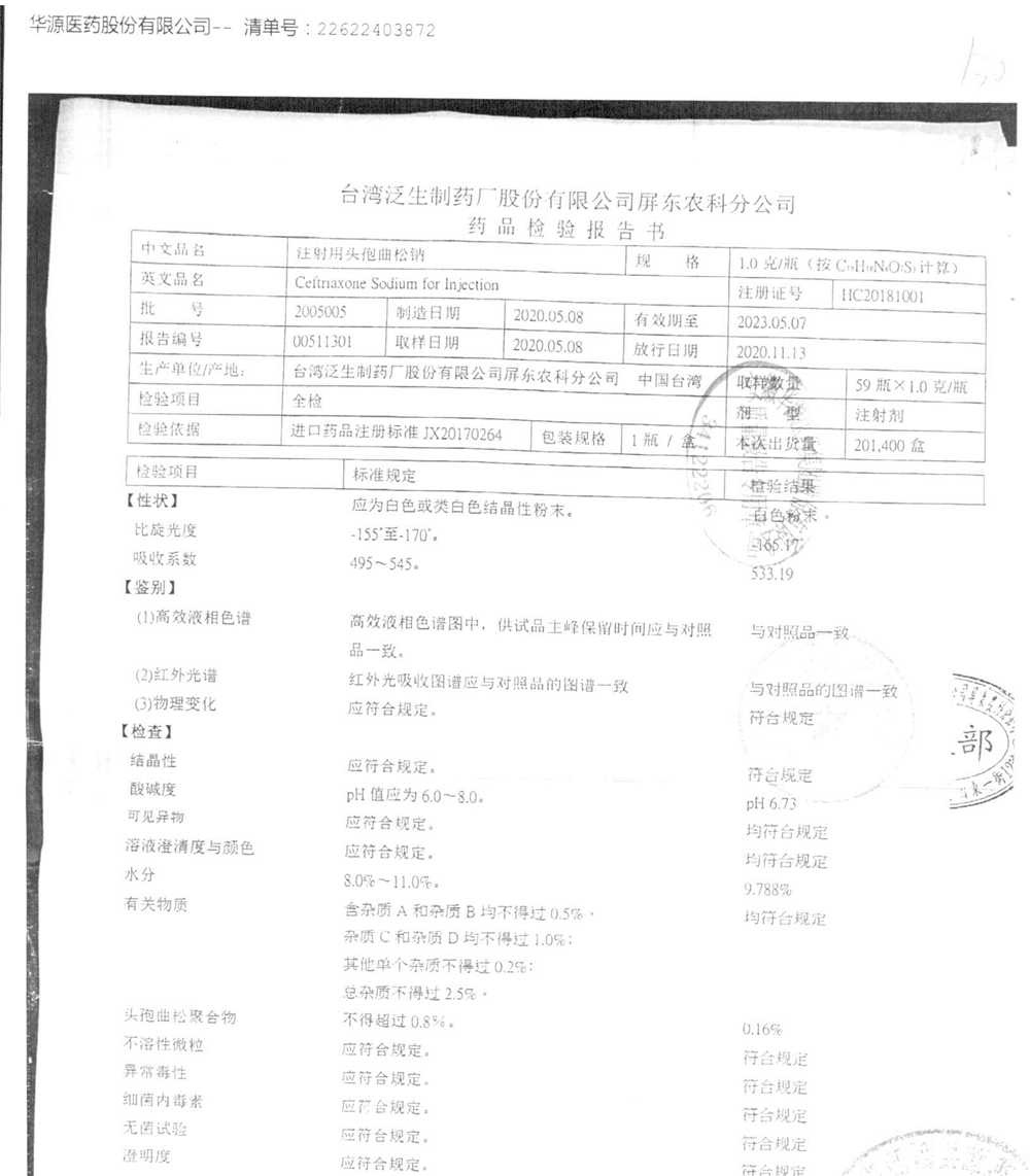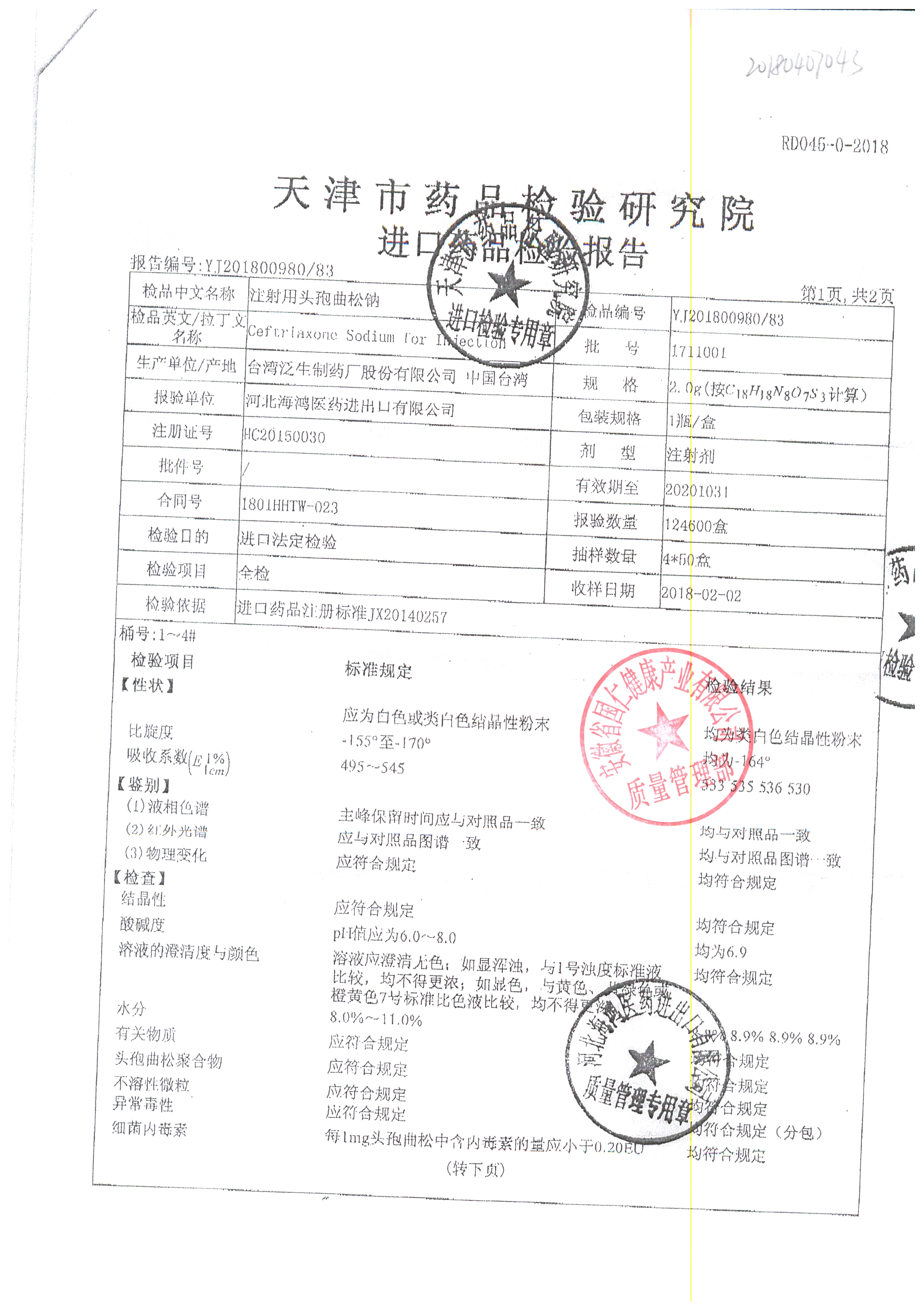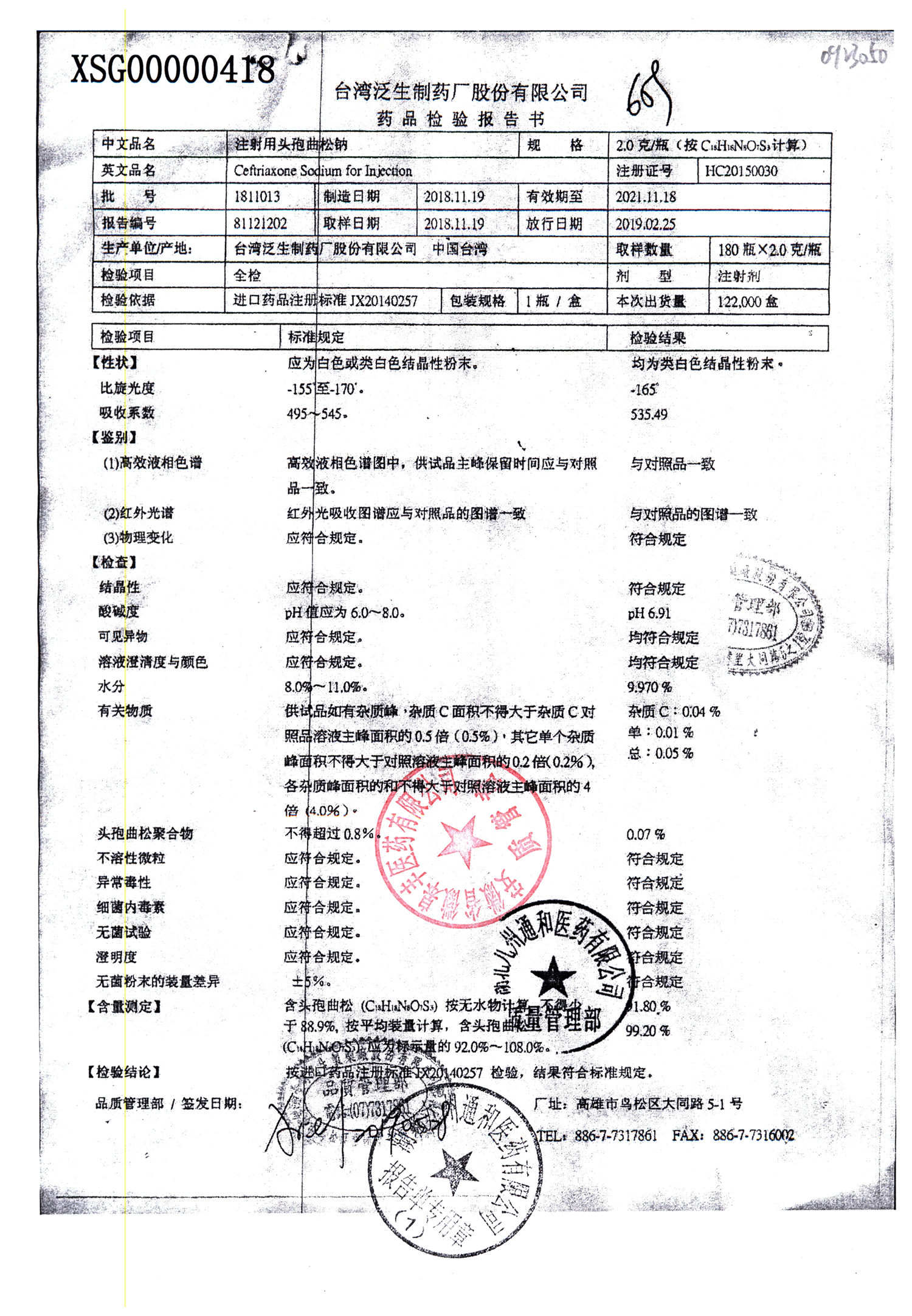 注射用頭孢曲松鈉 | 2.0g | 1712006(2/4) | 查看詳情 |