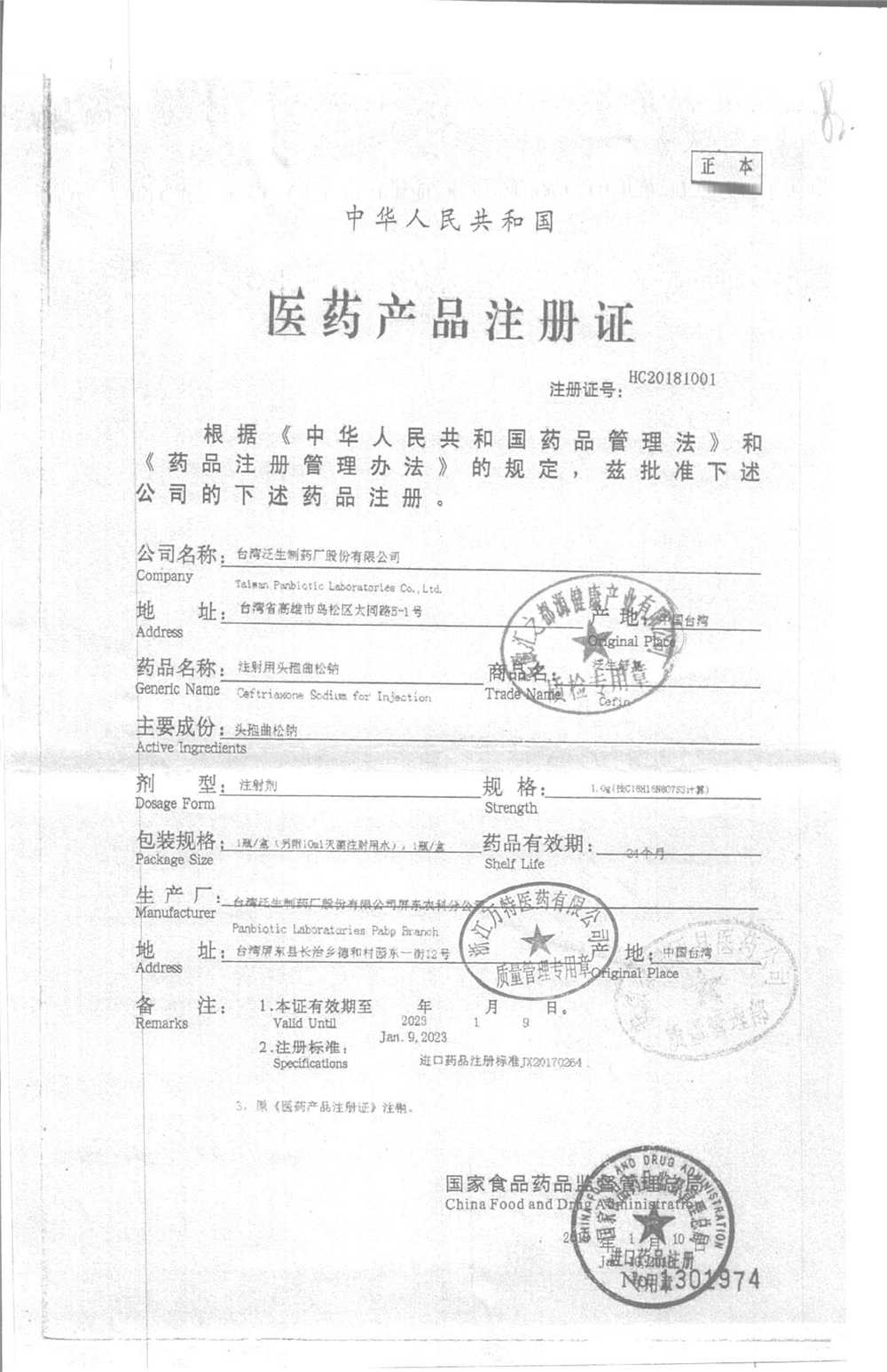 注射用頭孢曲松鈉 | 2.0g | 1801013(1/3) | 查看詳情 |