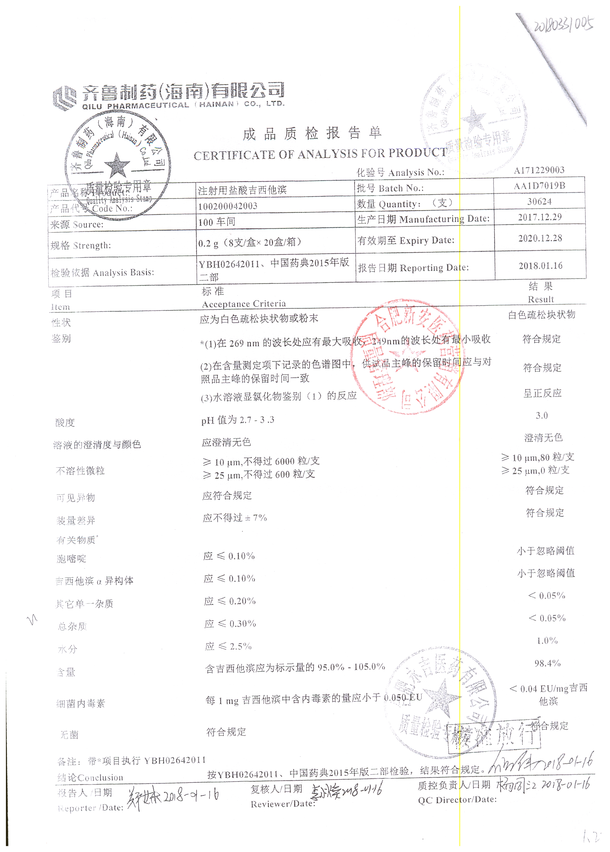 注射用鹽酸吉西他濱 0.2g*8支 AA1D7020A 查看詳情