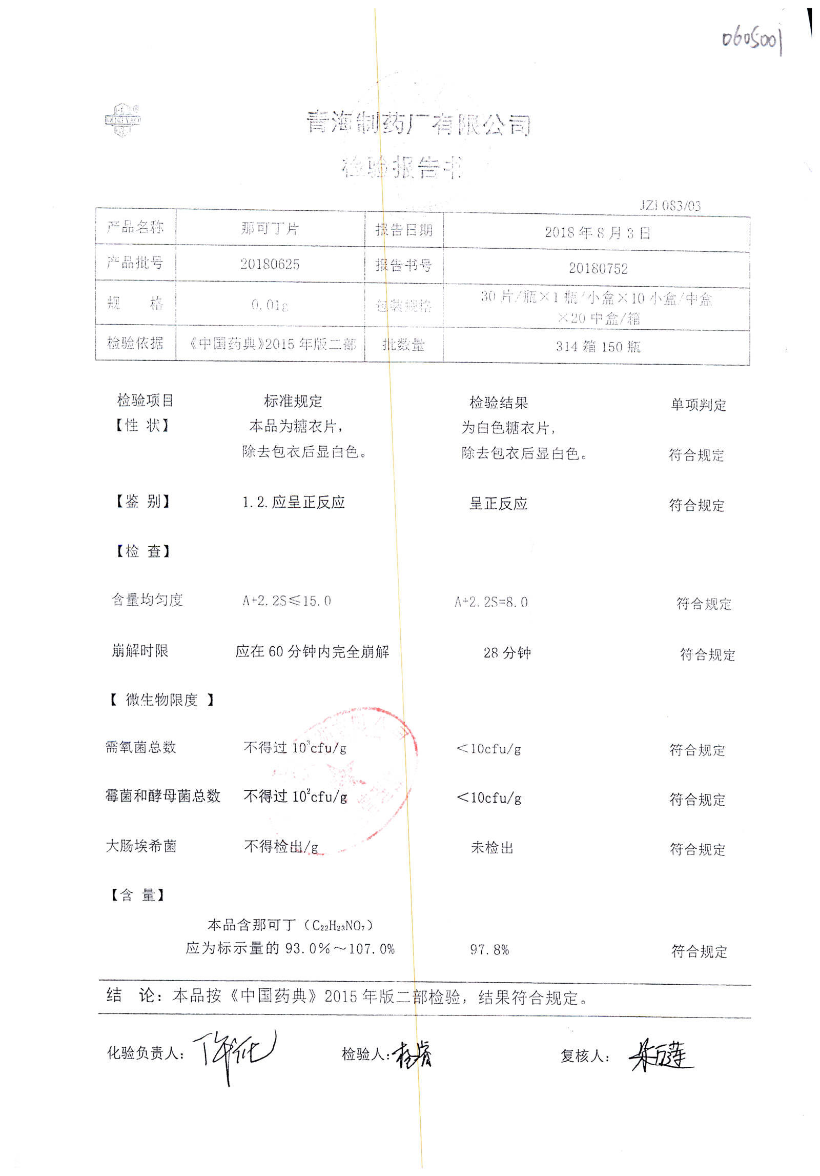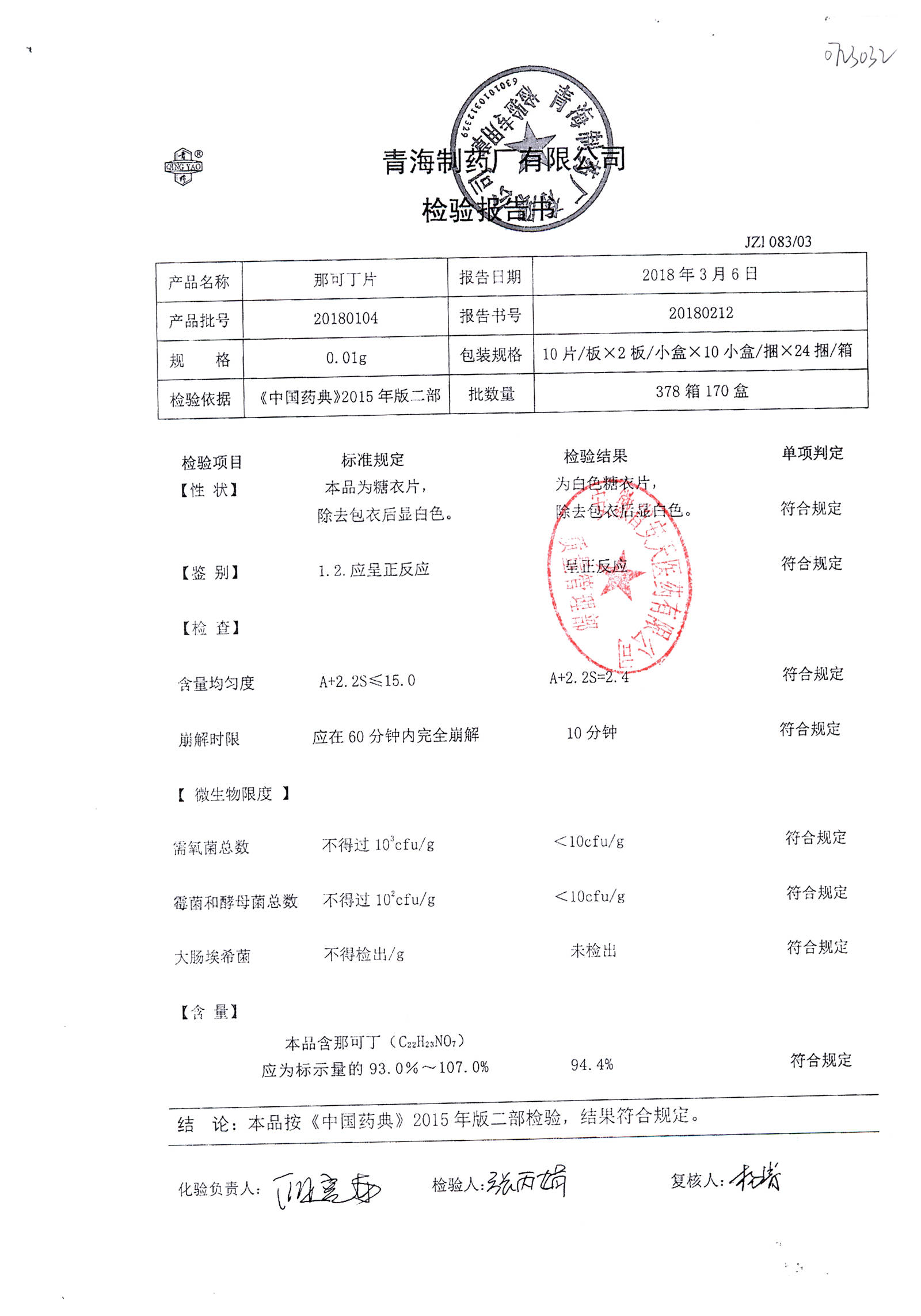 那可丁片 | 0.01g | 20180104 | 查看詳情 |