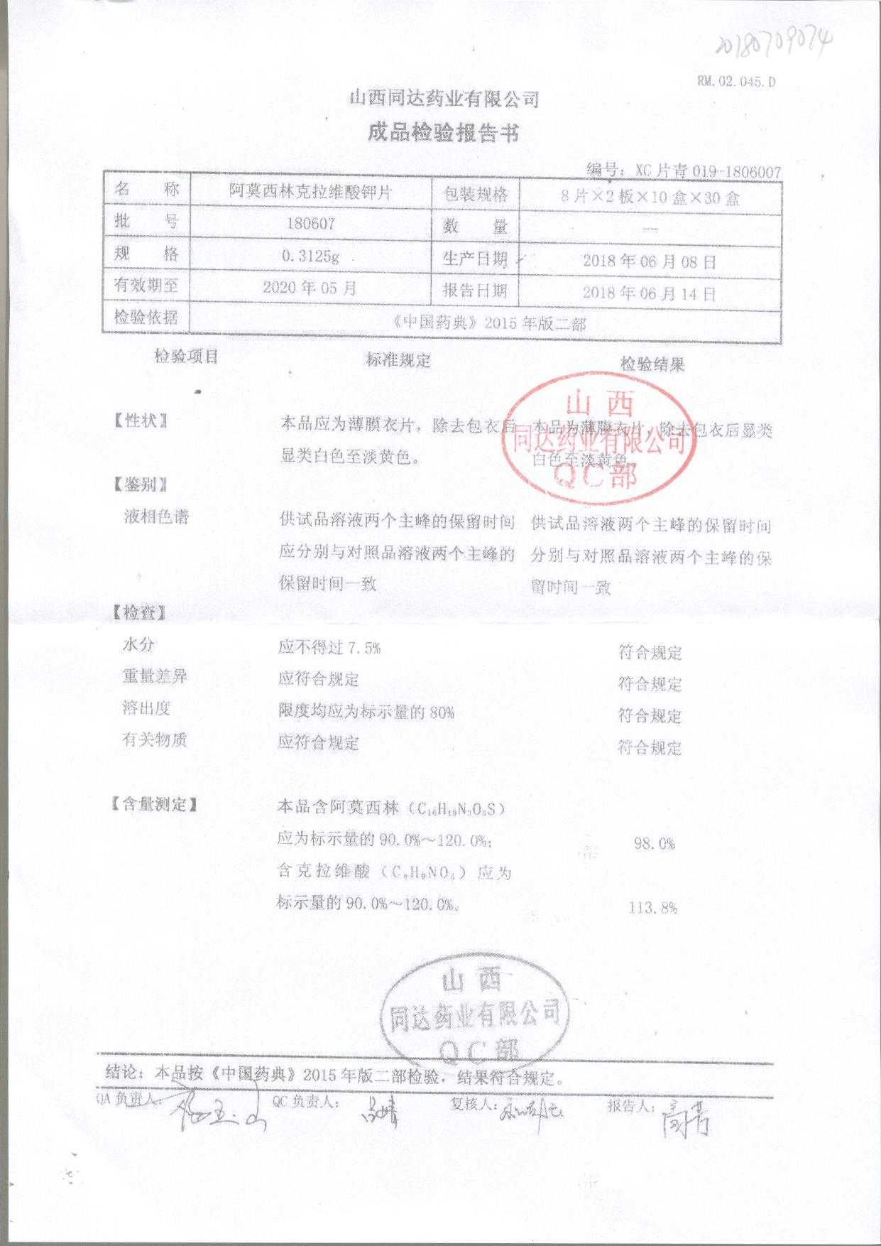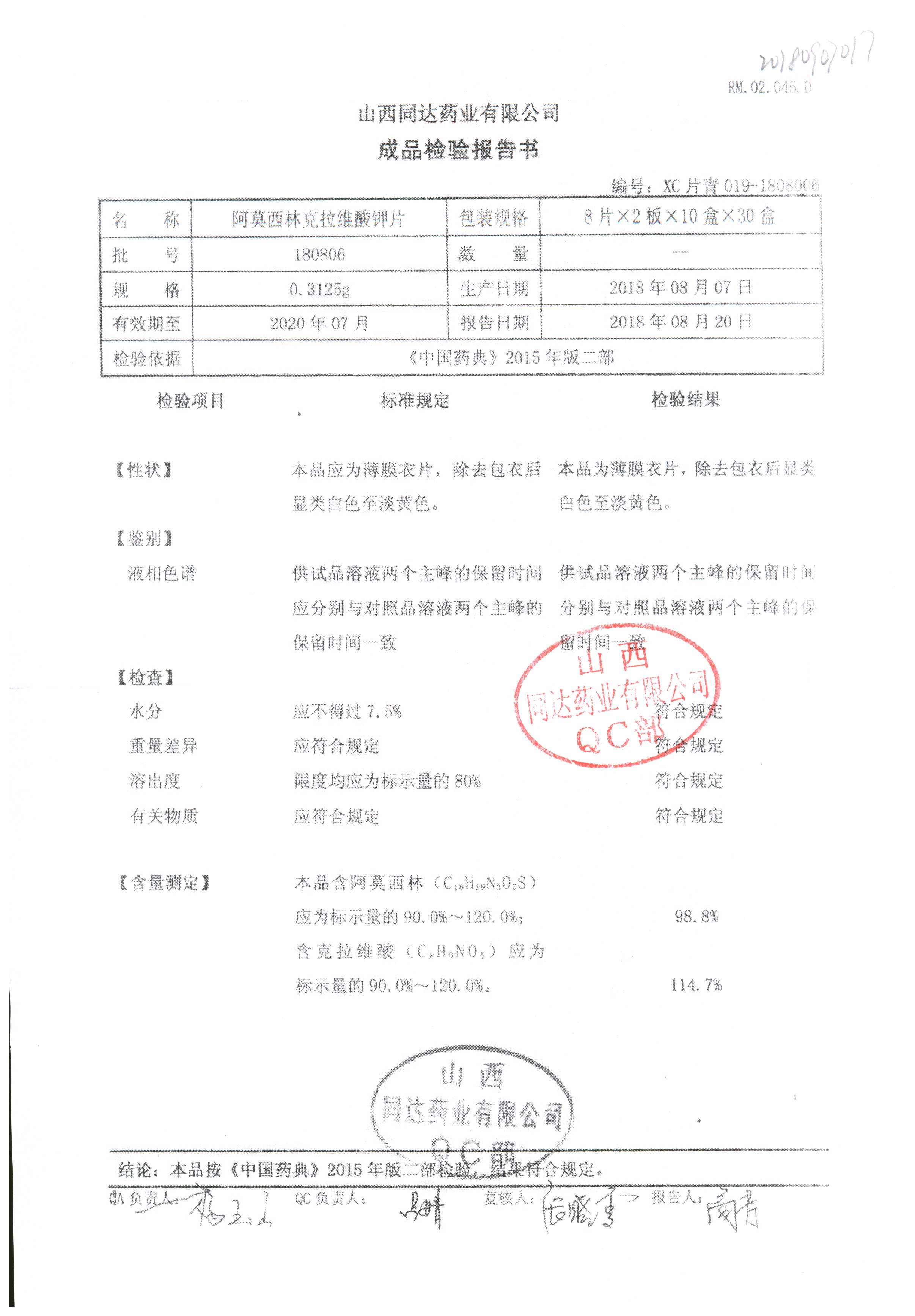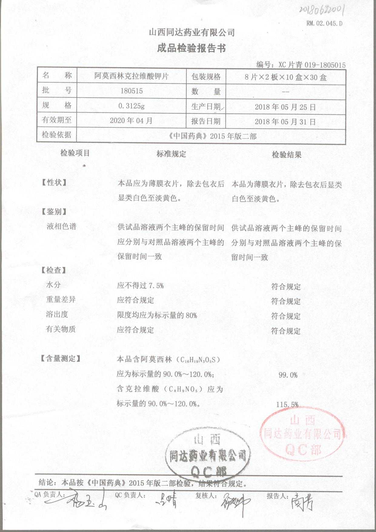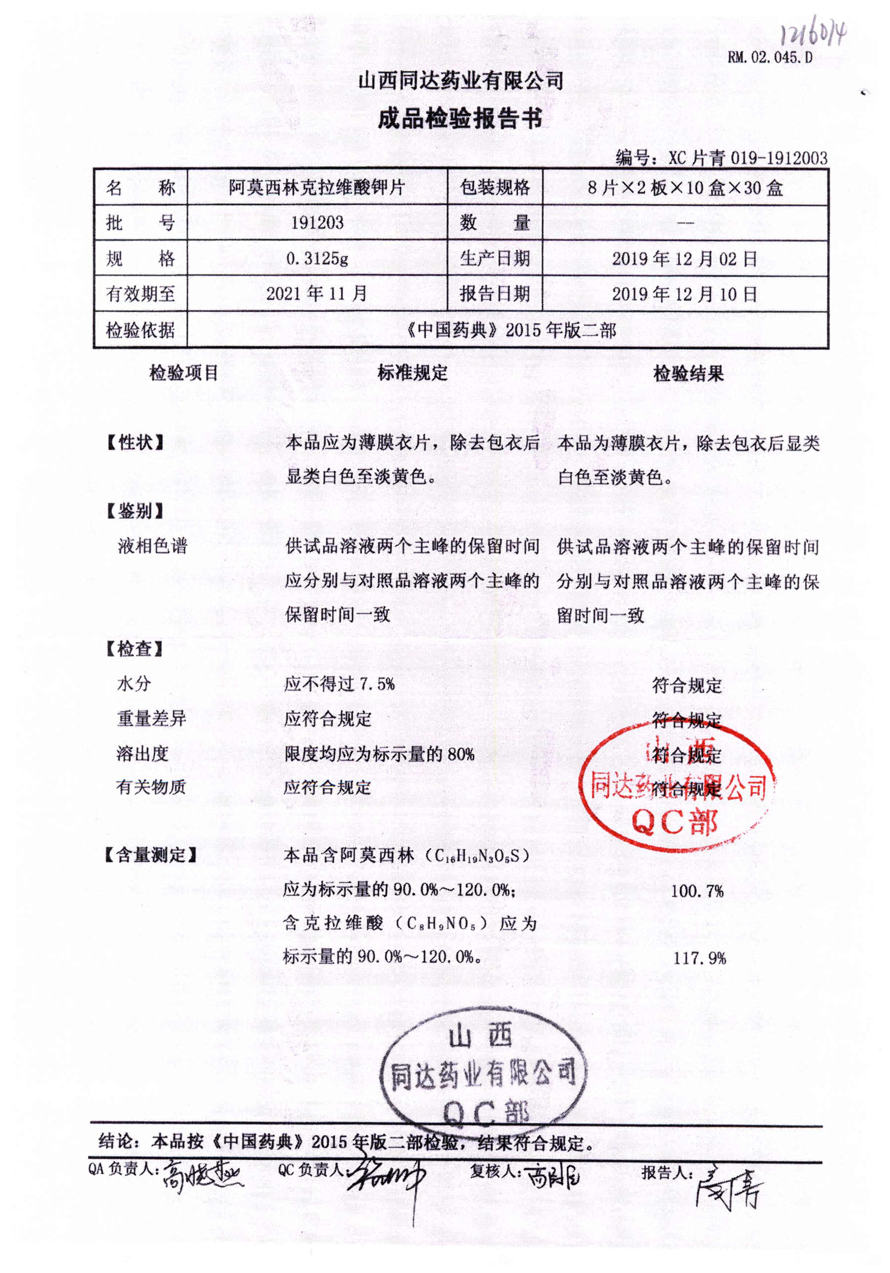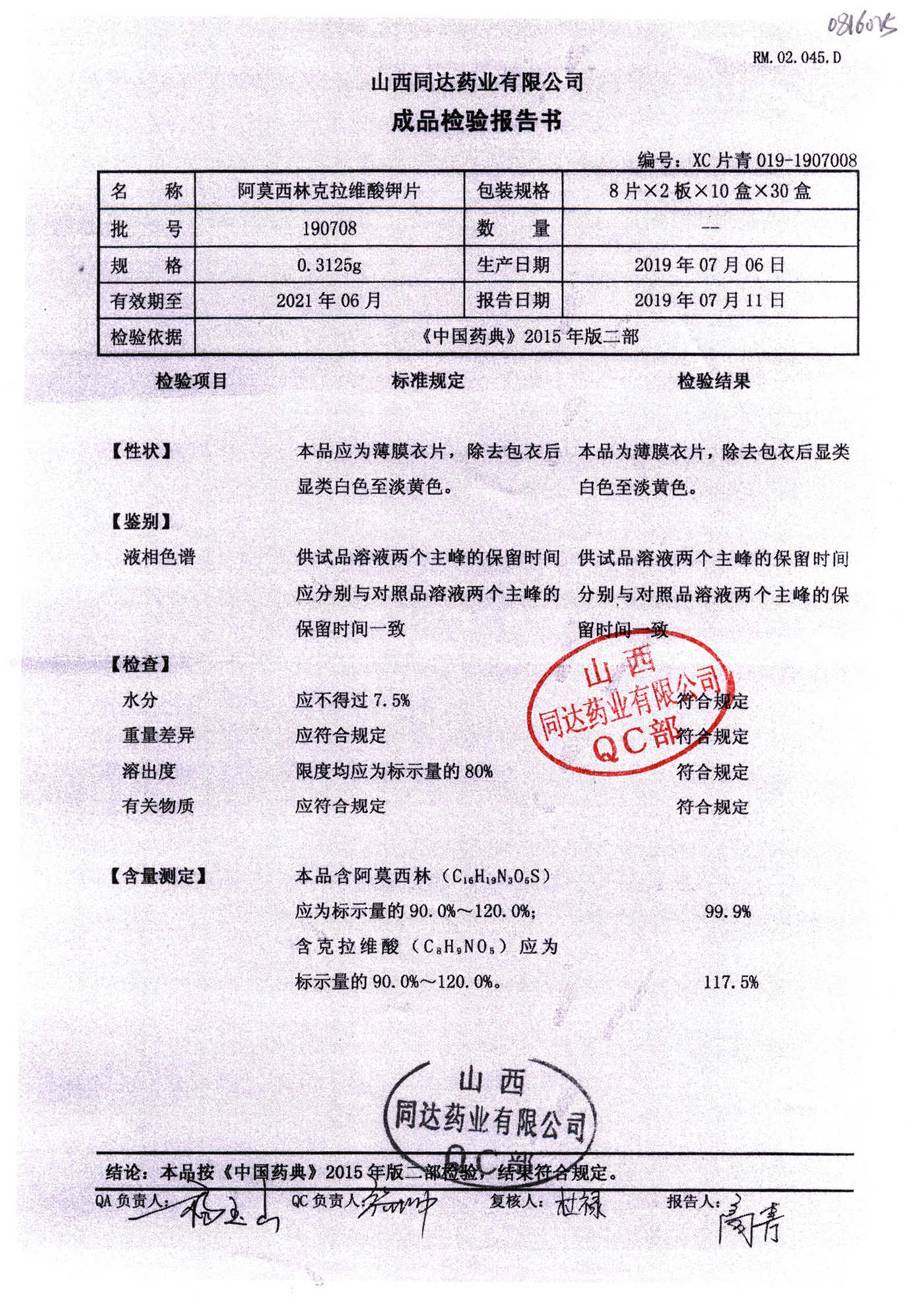 阿莫西林克拉維酸鉀片 | 0.3125g*16s | 190511 | 查看詳情 |
