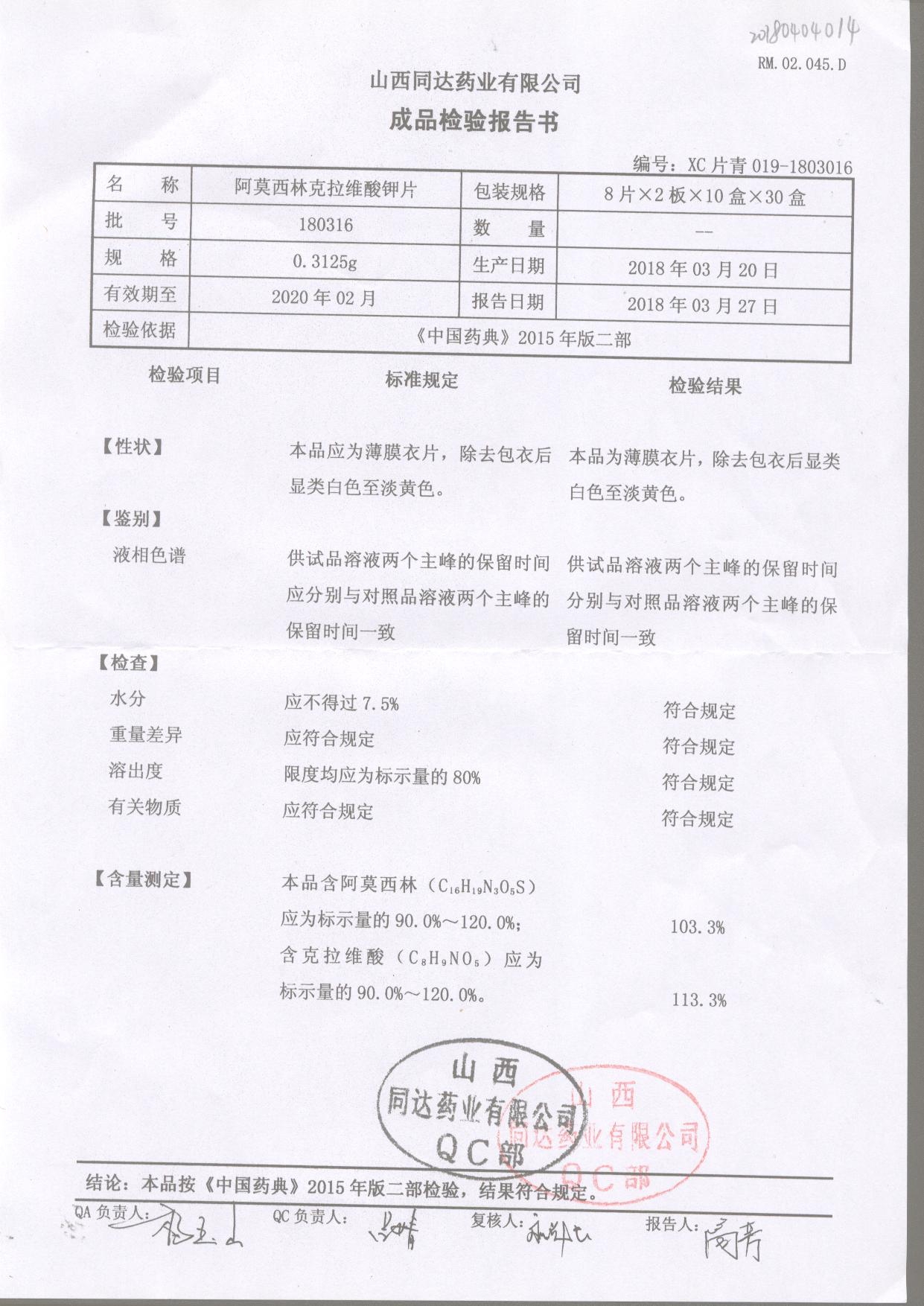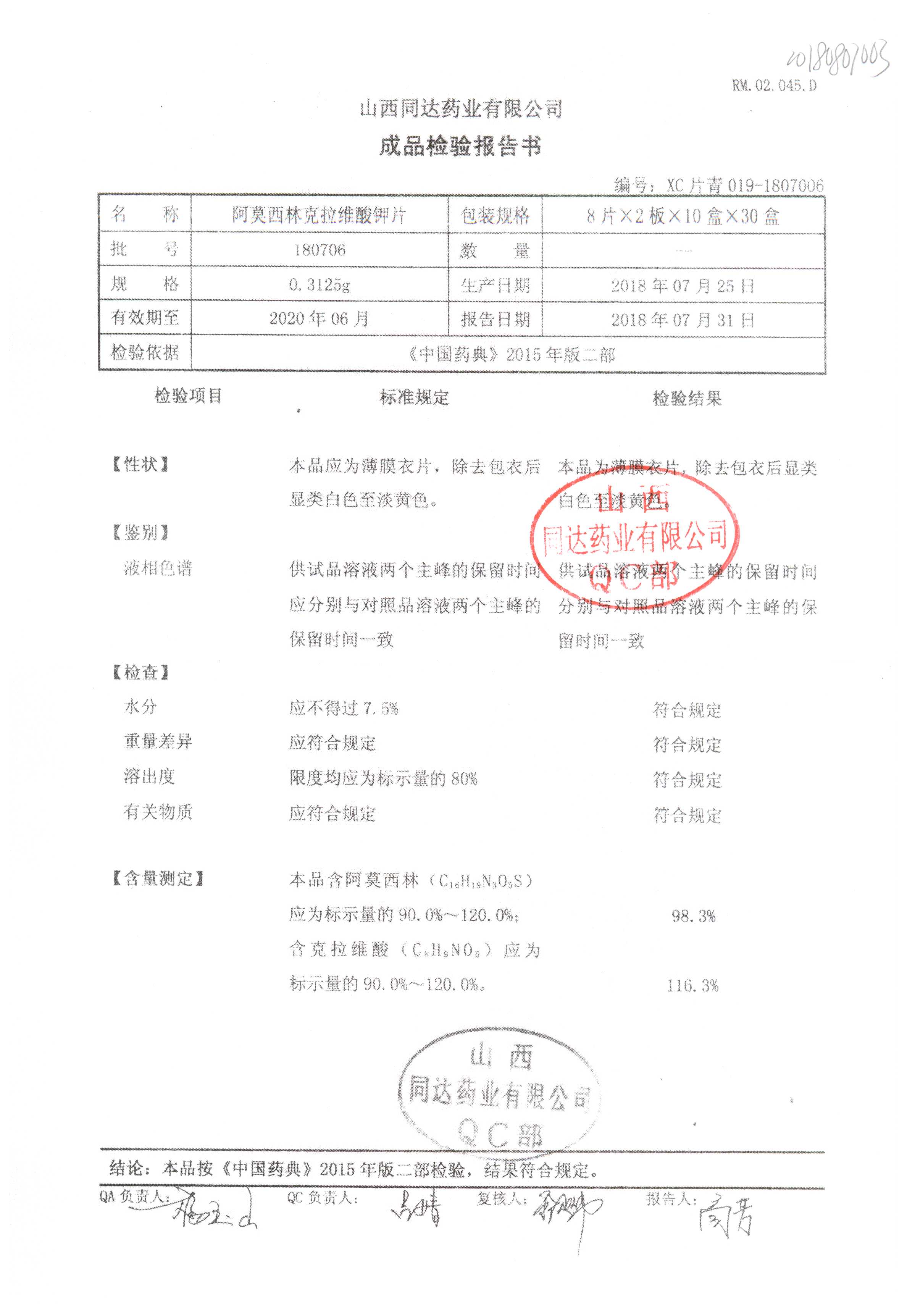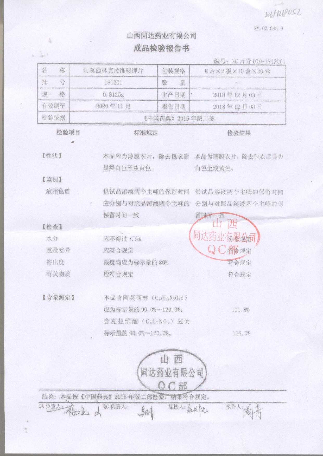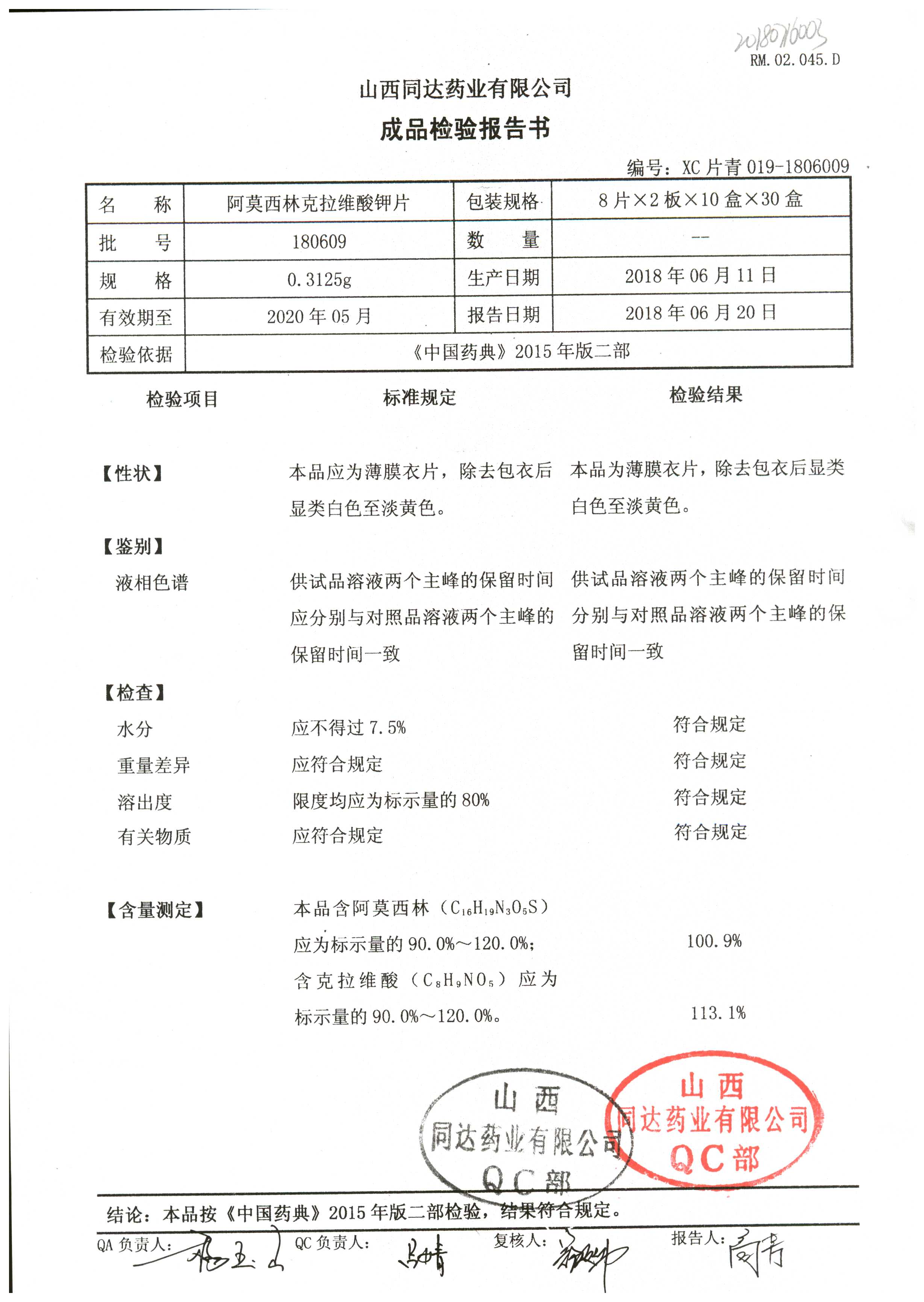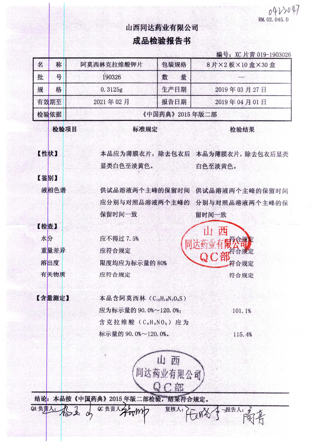 阿莫西林克拉維酸鉀片 | 0.3125g*16s | 190511 | 查看詳情 |