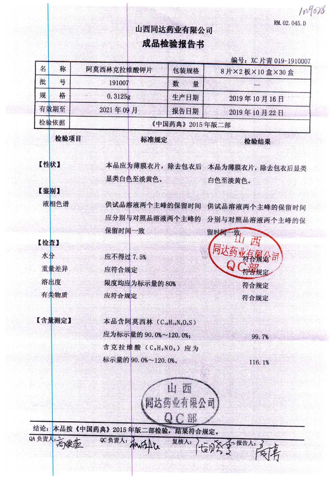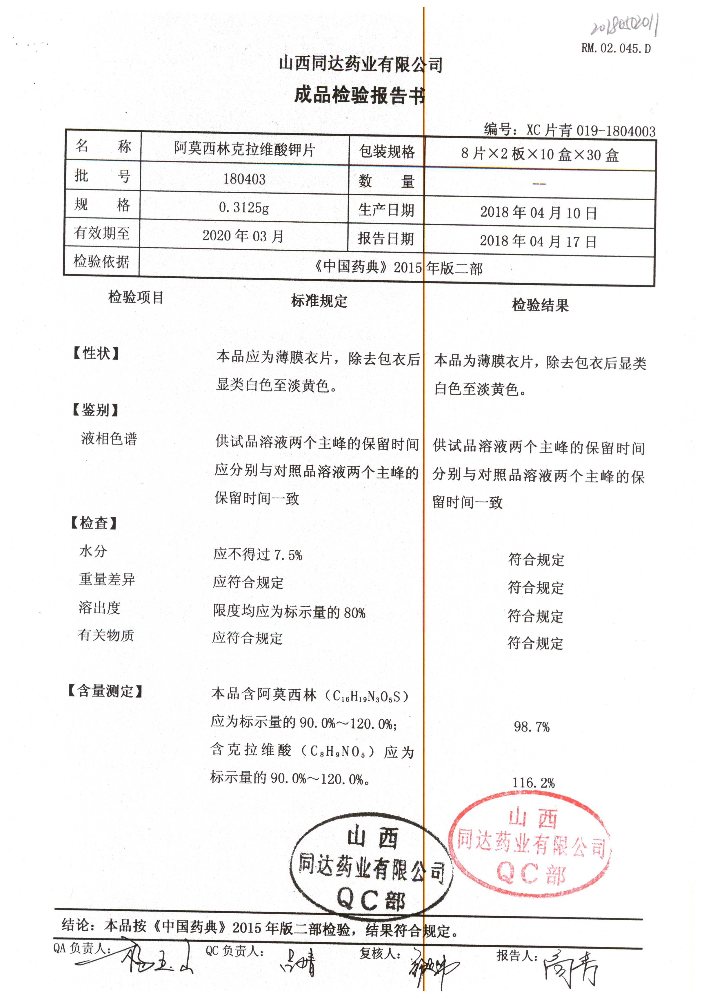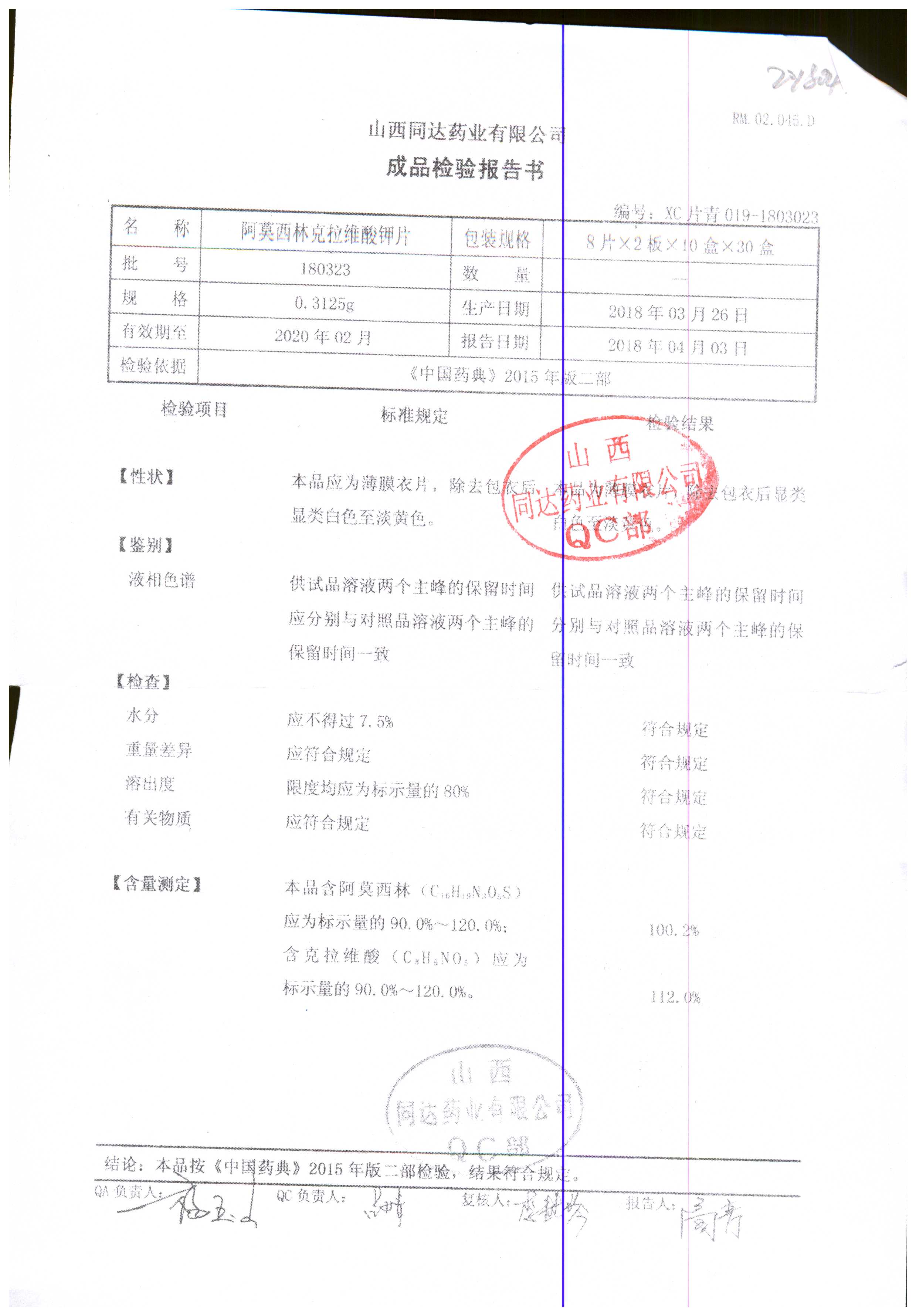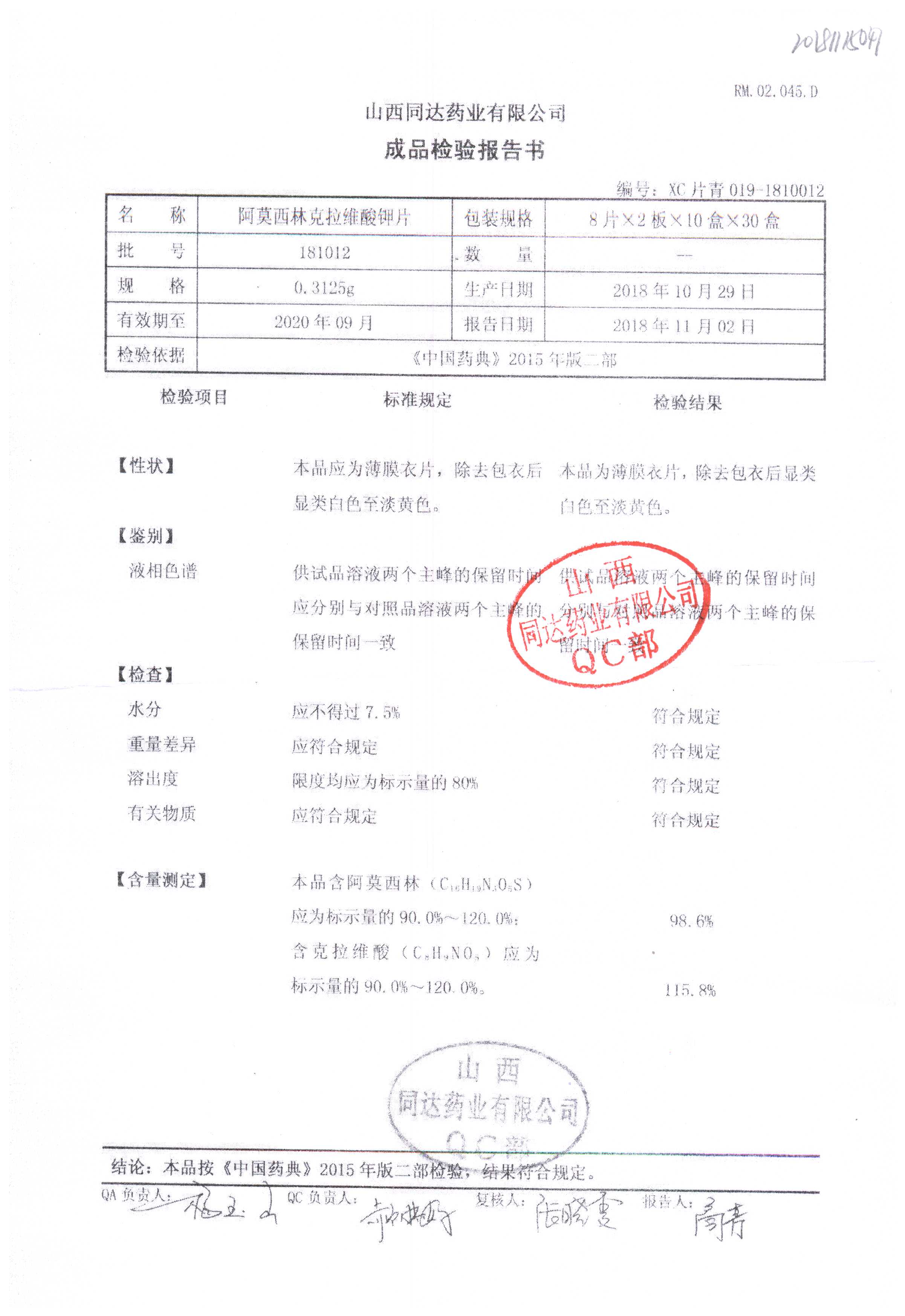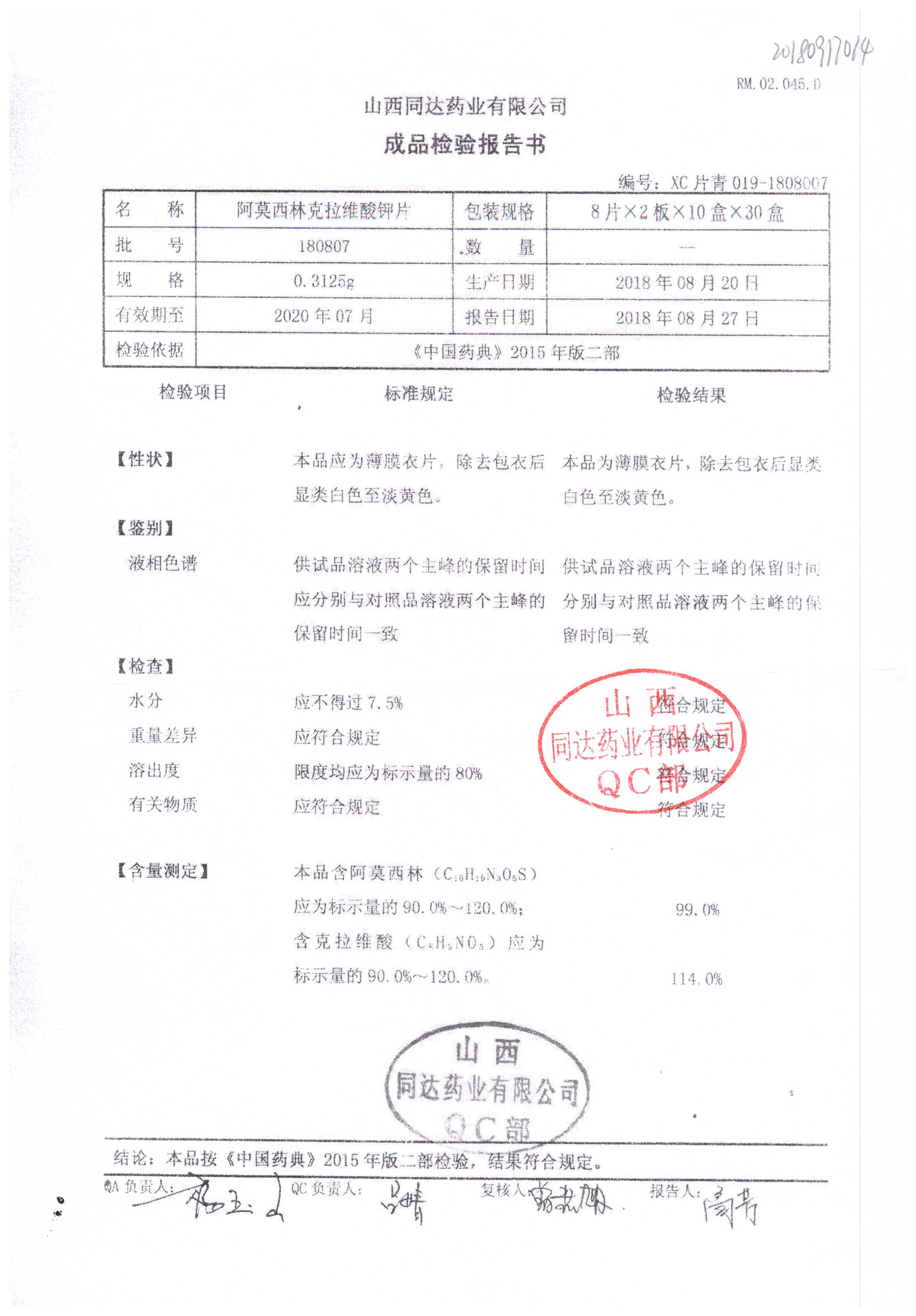阿莫西林克拉維酸鉀片 | 0.3125g*16s | 190511 | 查看詳情 |