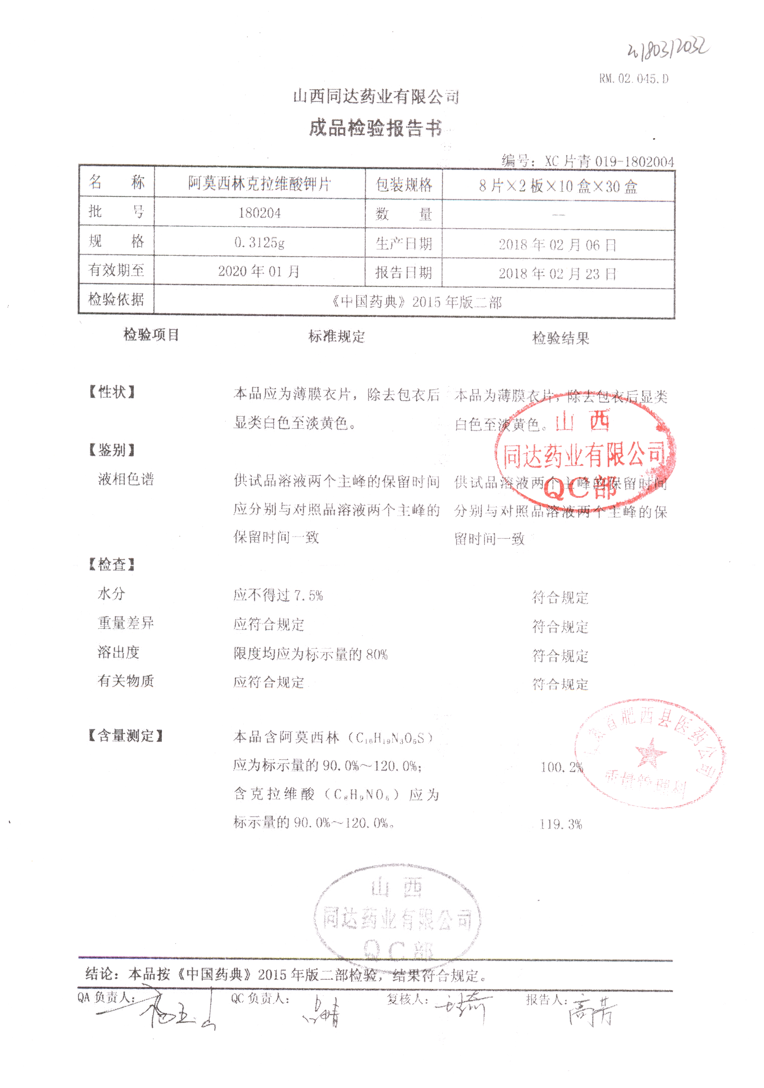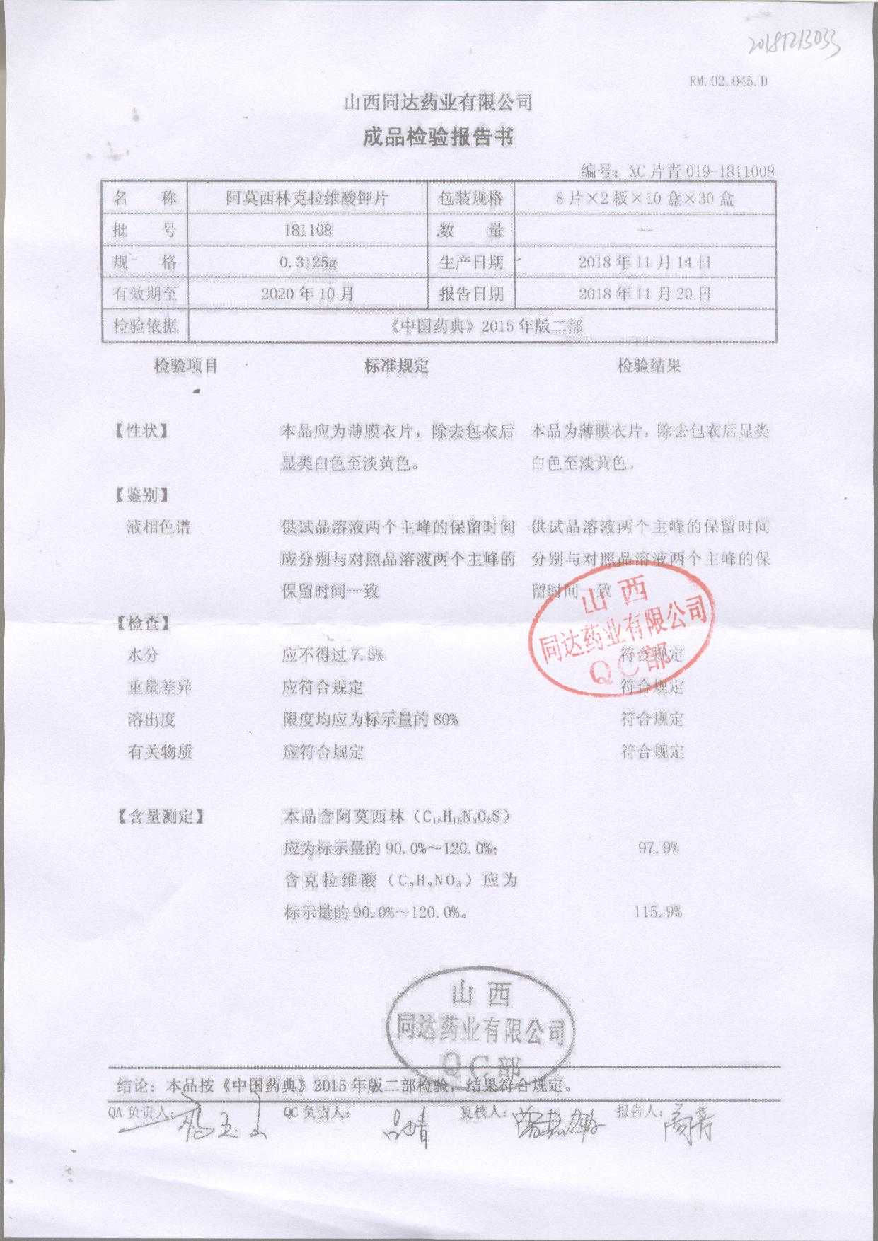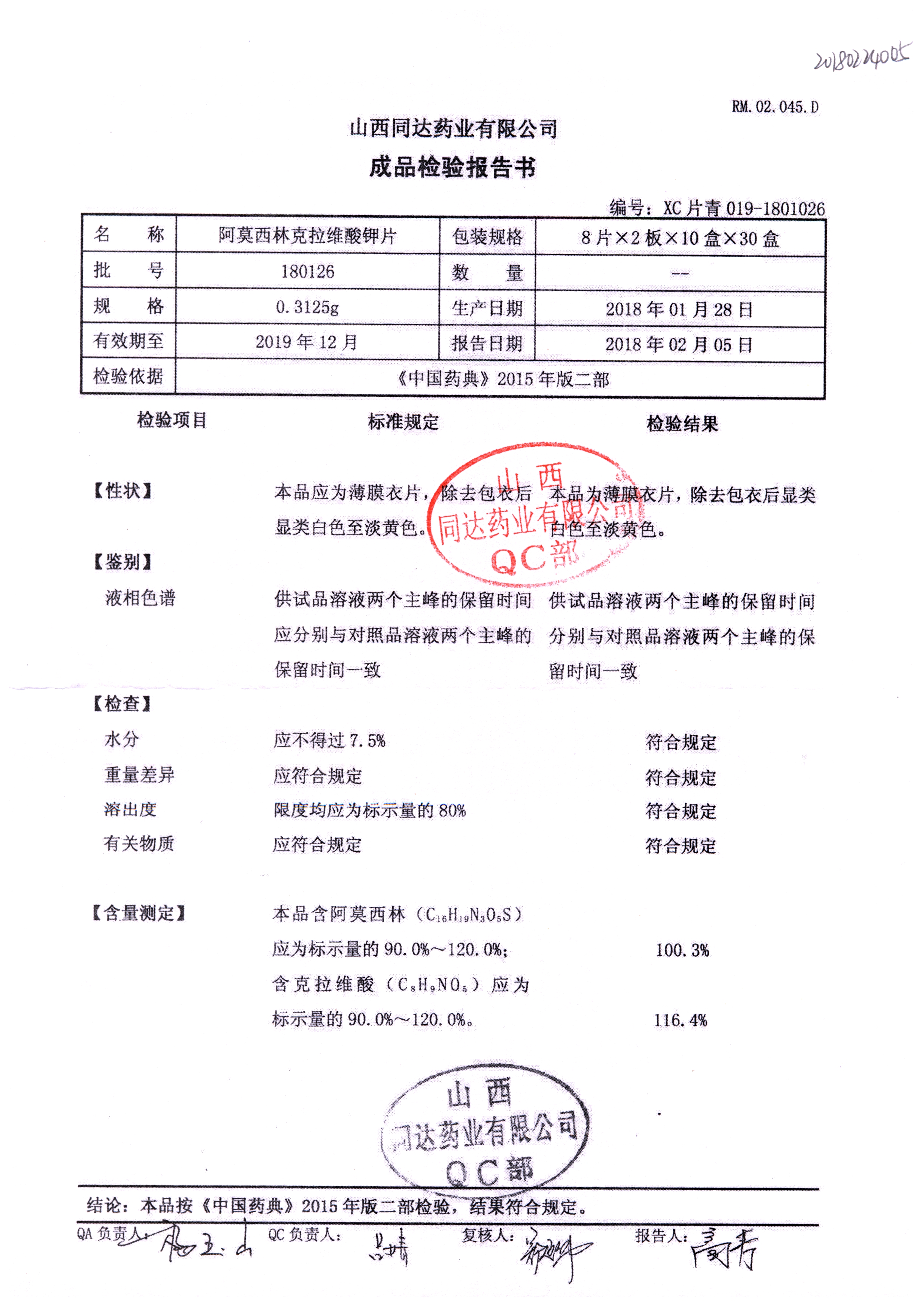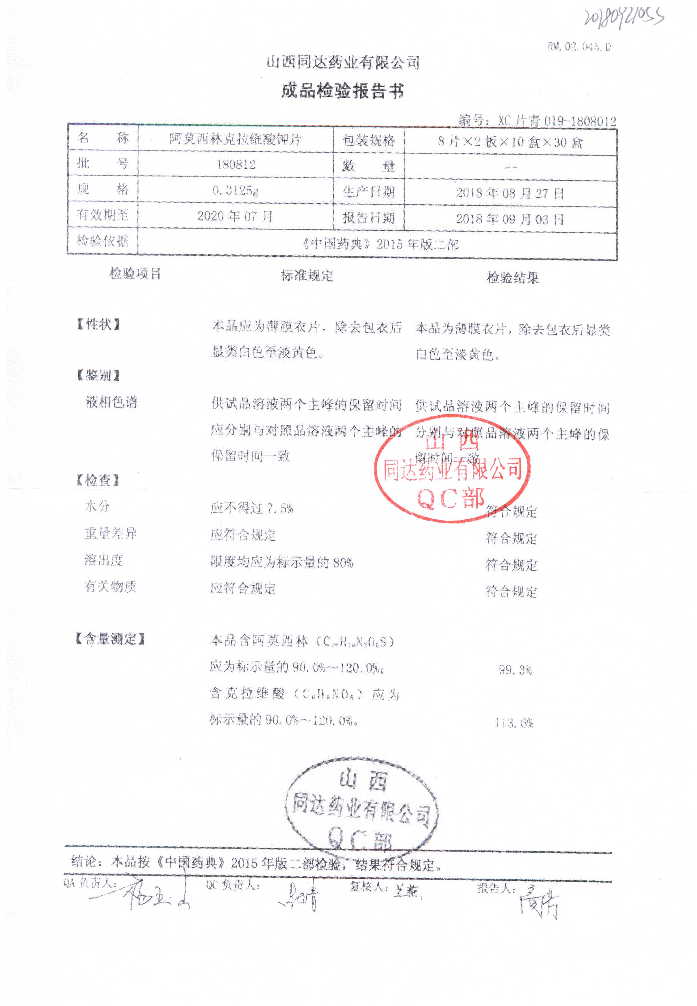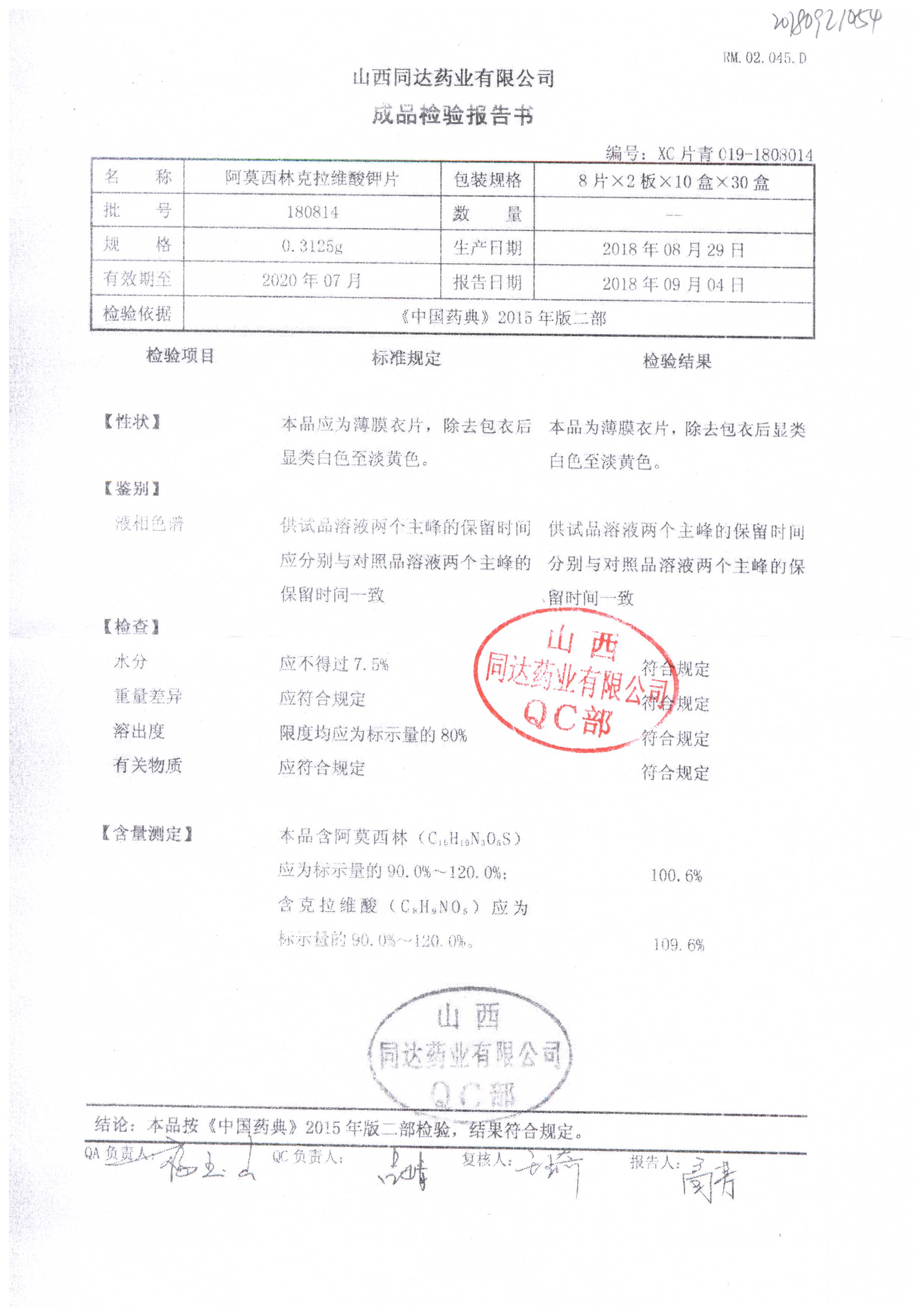 阿莫西林克拉維酸鉀片 | 0.3125g*16s | 190511 | 查看詳情 |