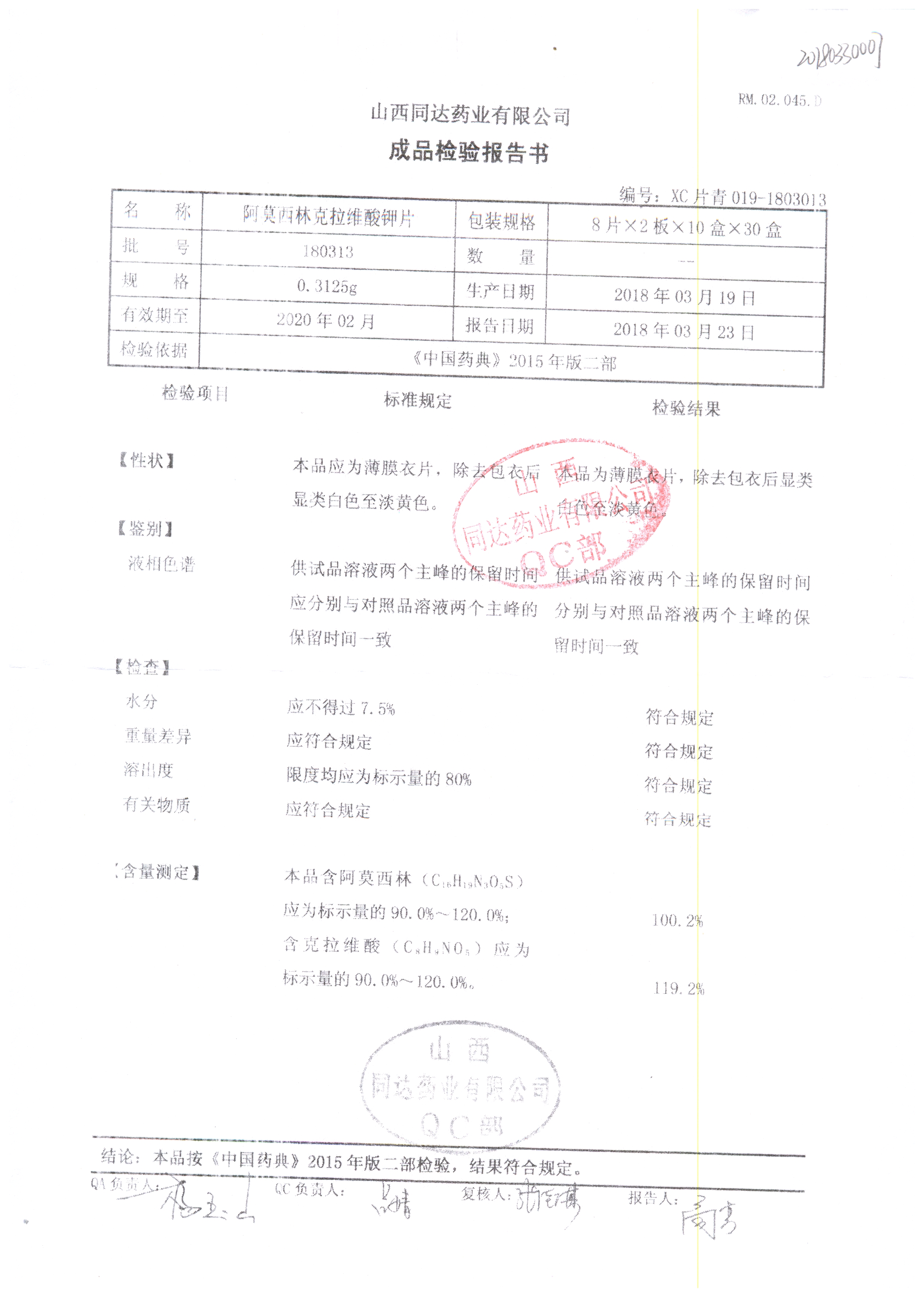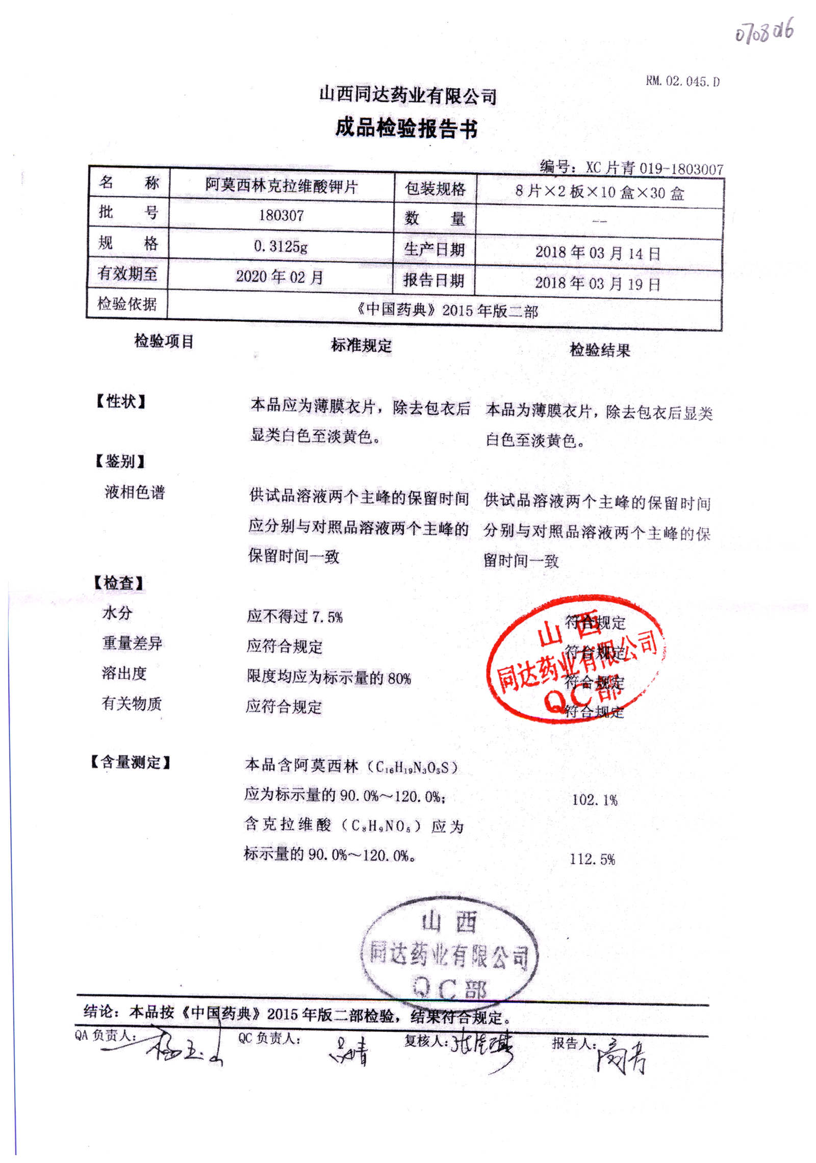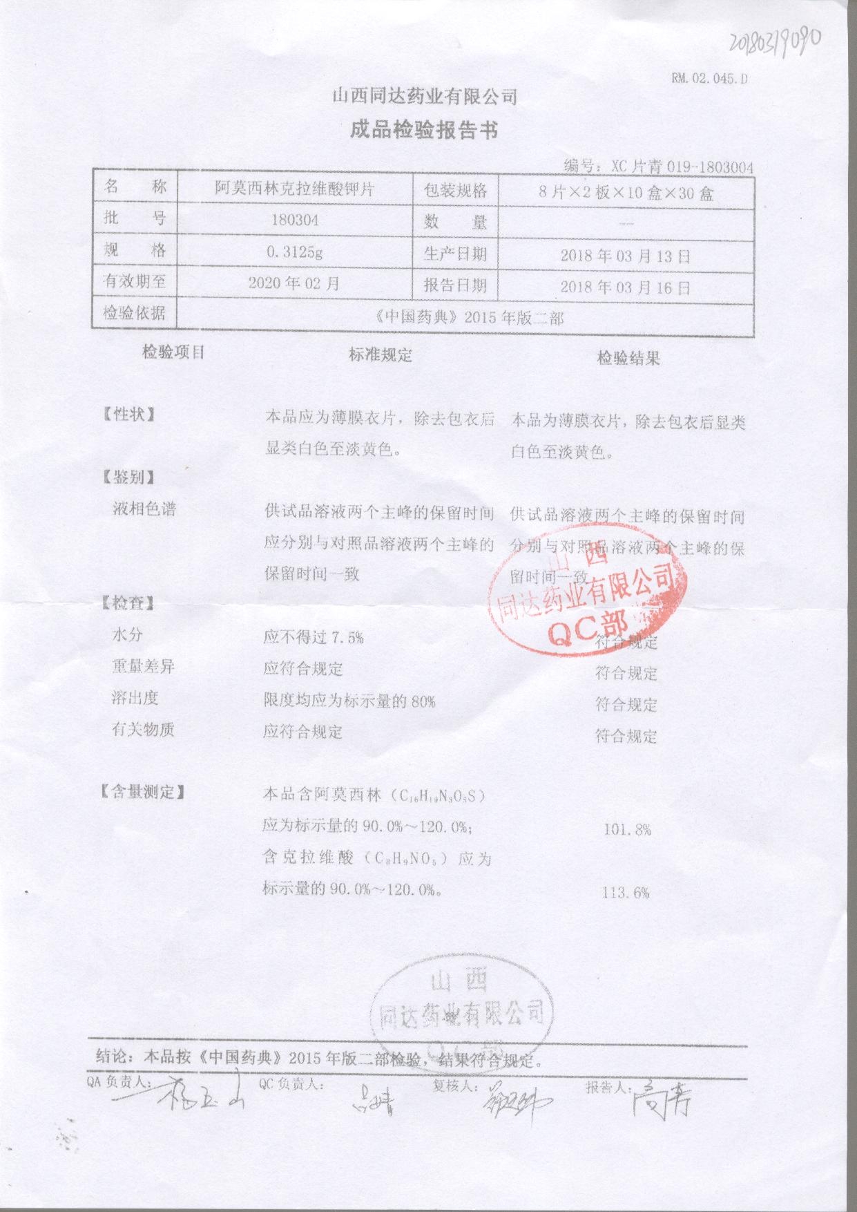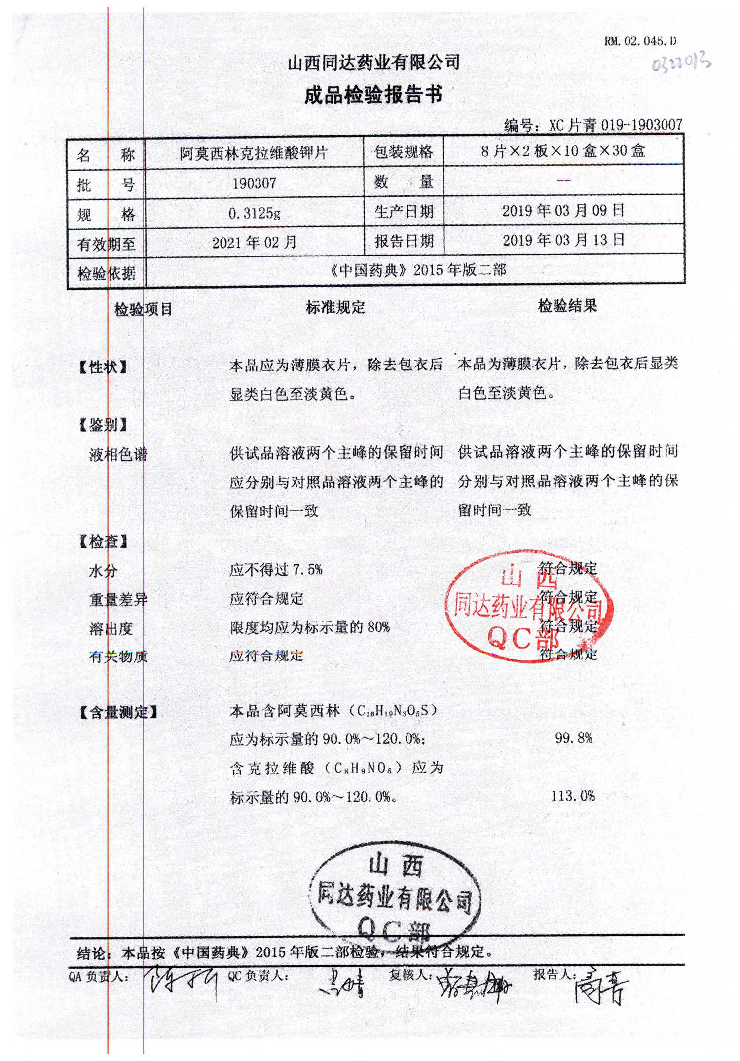 阿莫西林克拉維酸鉀片 | 0.3125g*16s | 190307 | 查看詳情 |