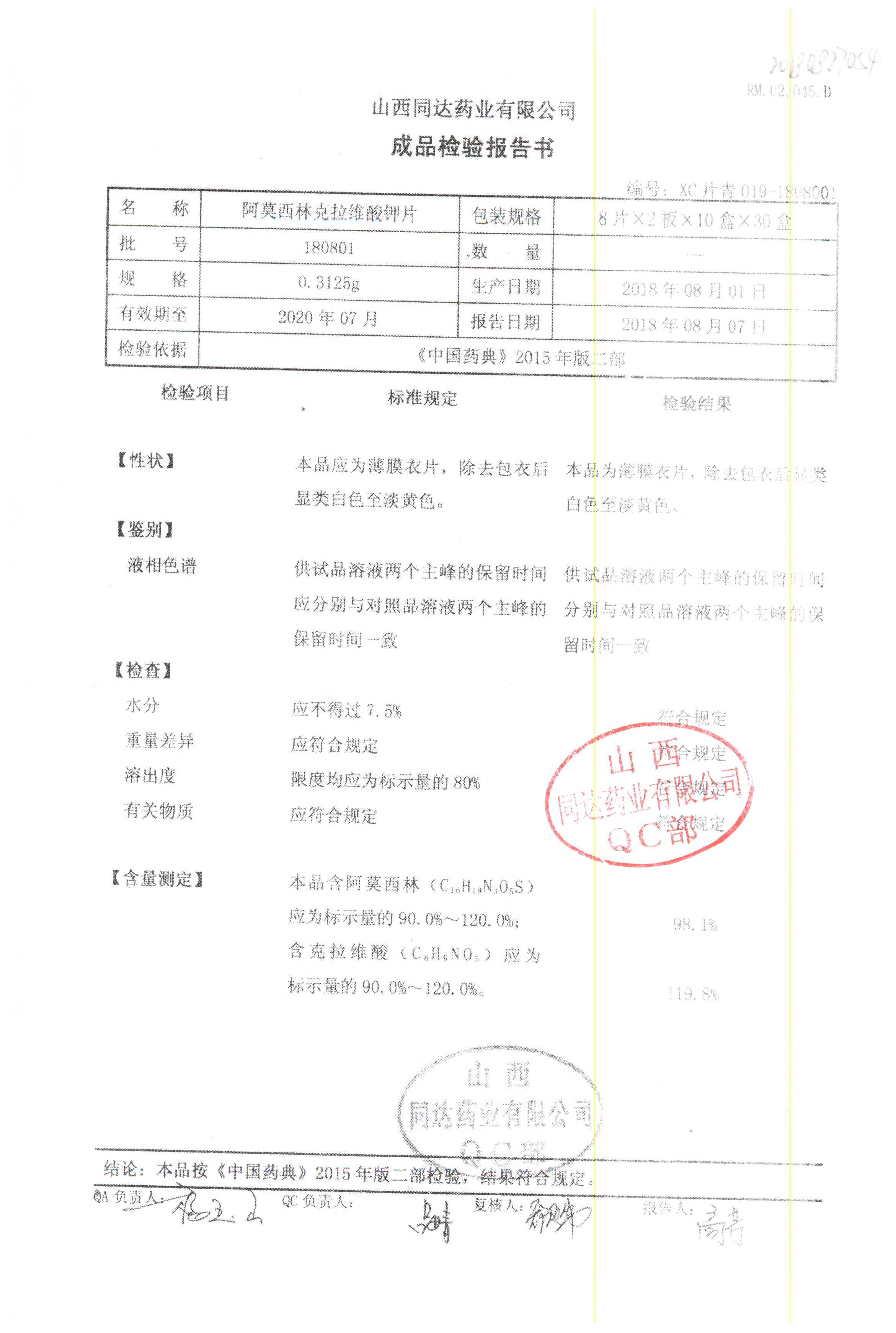 阿莫西林克拉維酸鉀片 | 0.3125g*16s | 180801 | 查看詳情 |