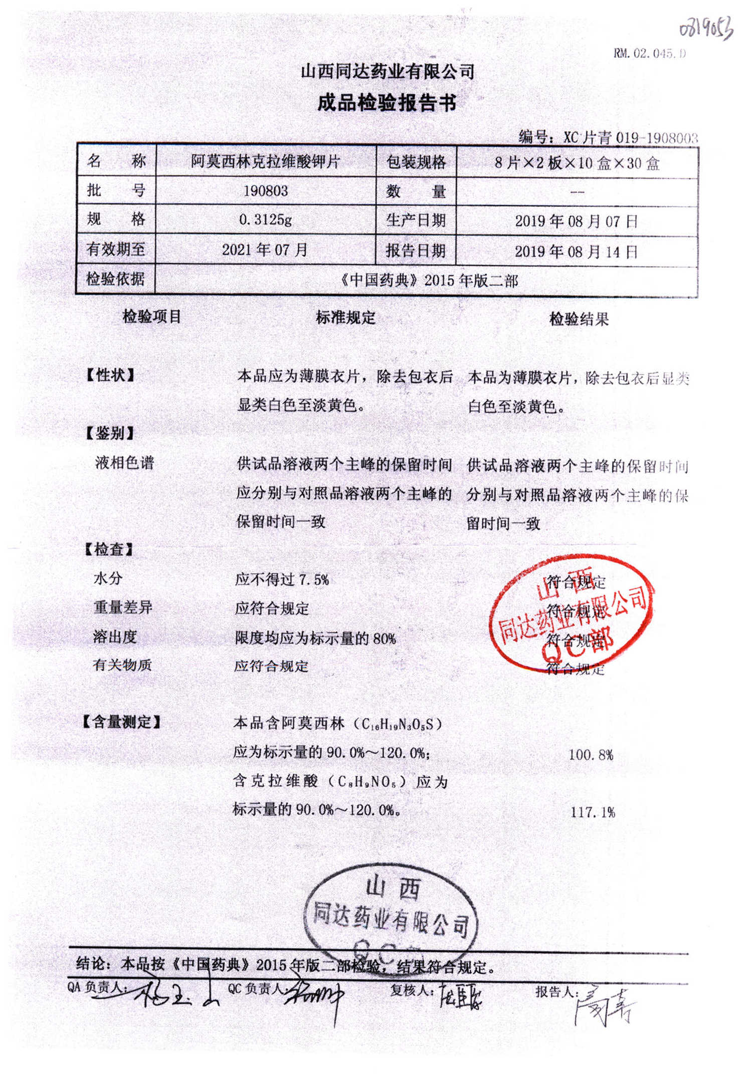 阿莫西林克拉維酸鉀片 | 0.3125g*16s | 190809 | 查看詳情 |