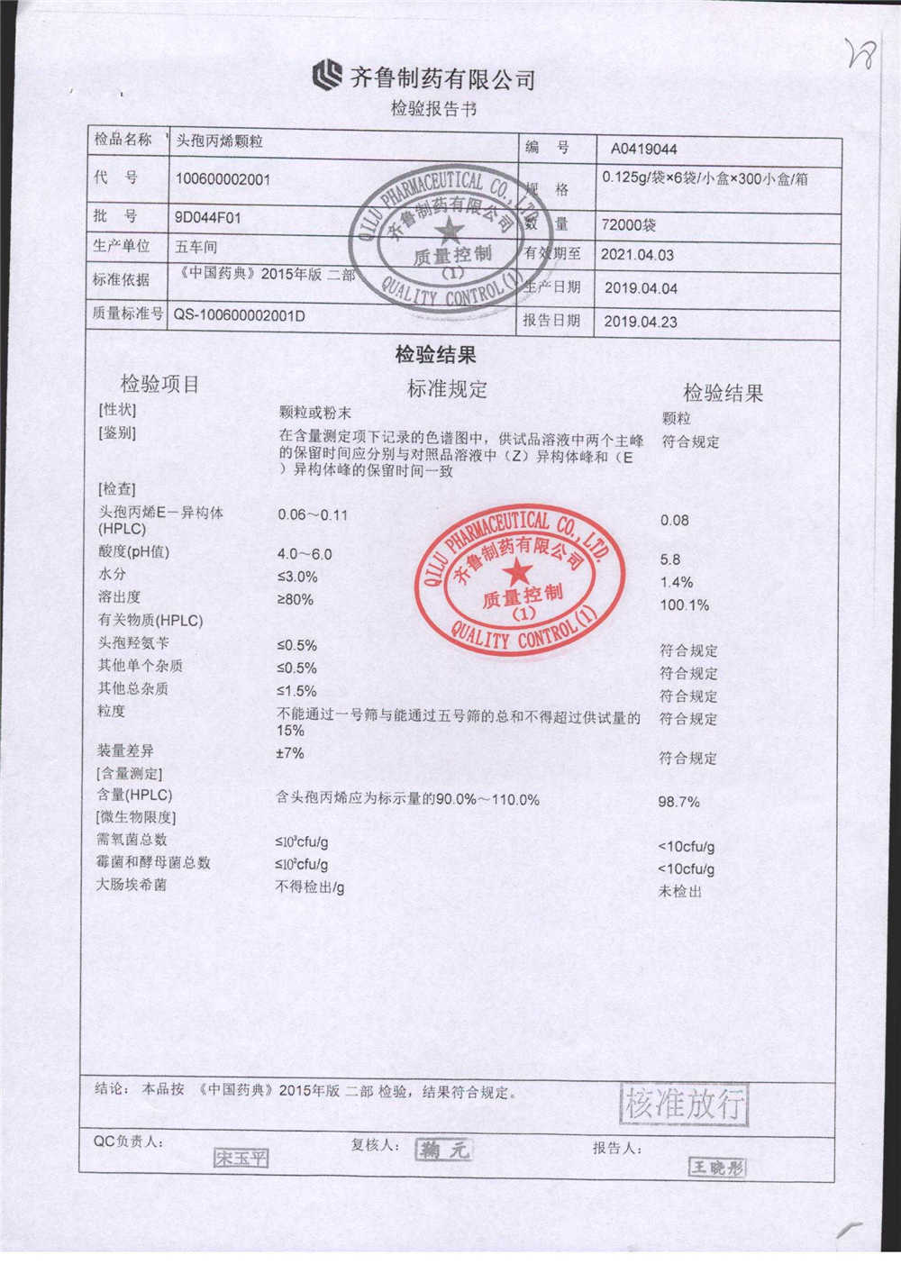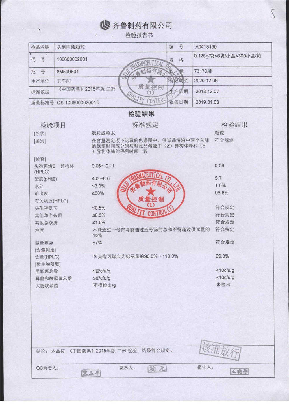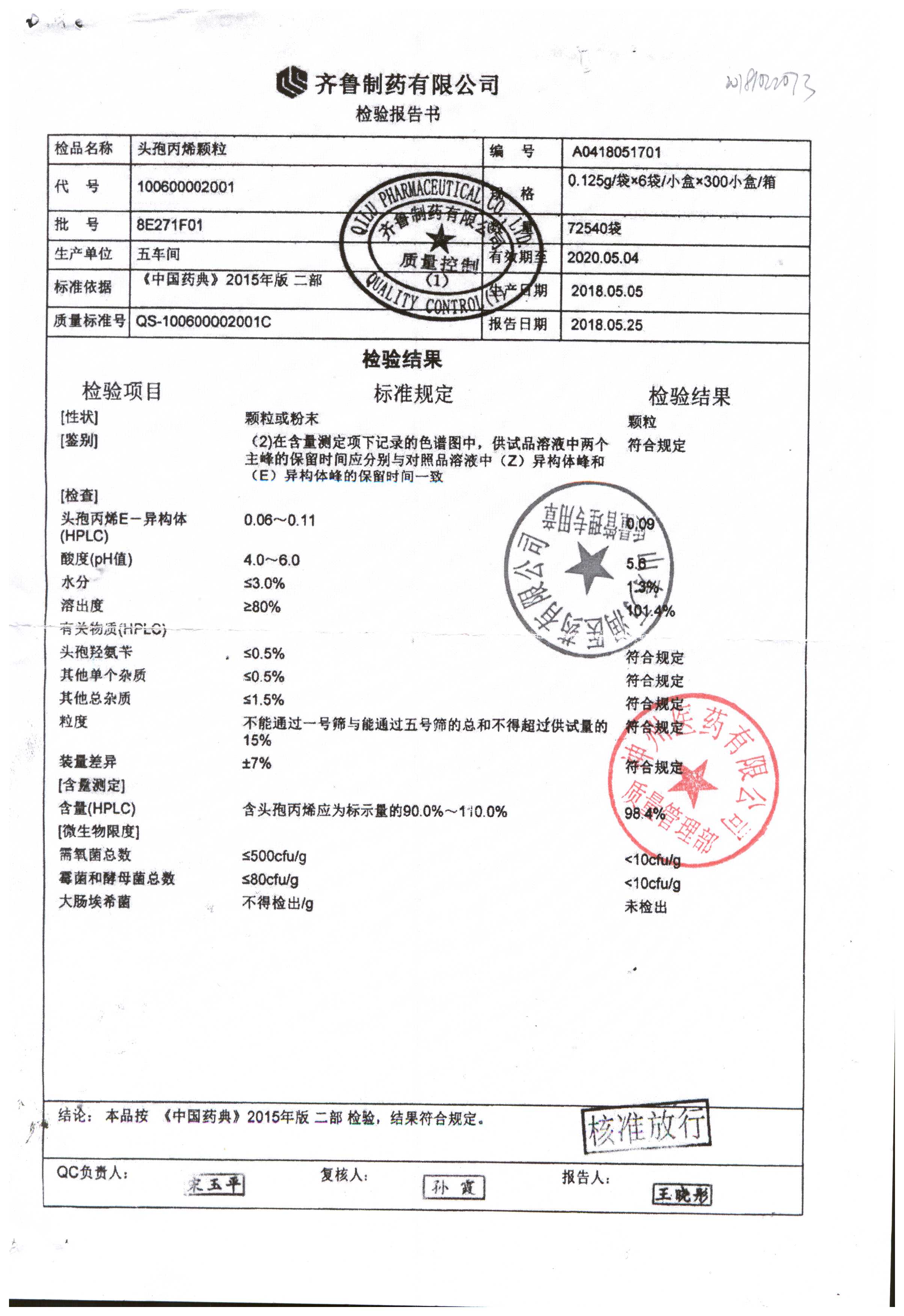 | 頭孢丙烯顆粒 | 0.125g*6袋 | 8C125F01 | 查看詳情 |