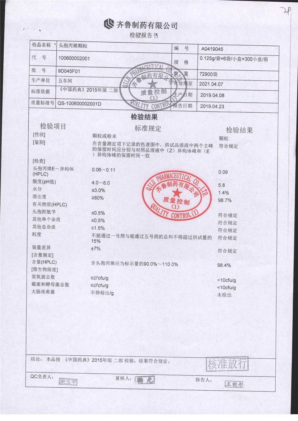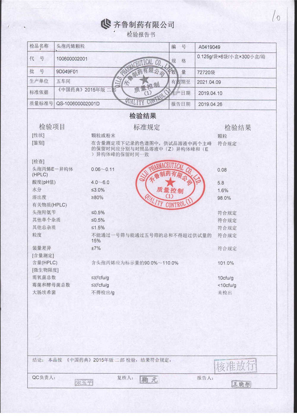 | 頭孢丙烯顆粒 | 0.125g*6袋 | 9D050F01 | 查看詳情 |