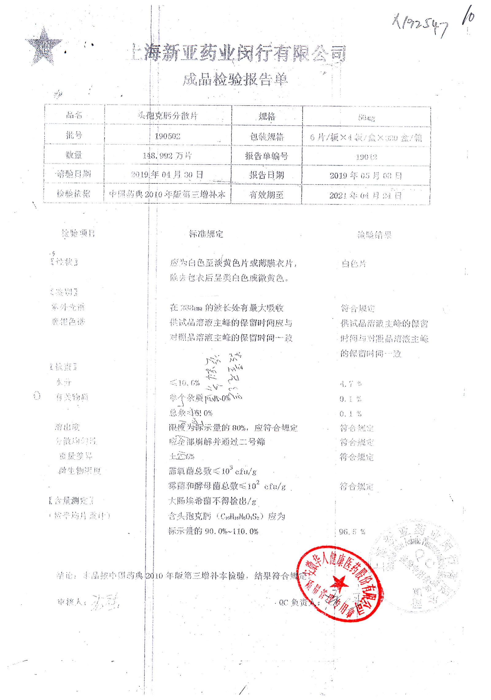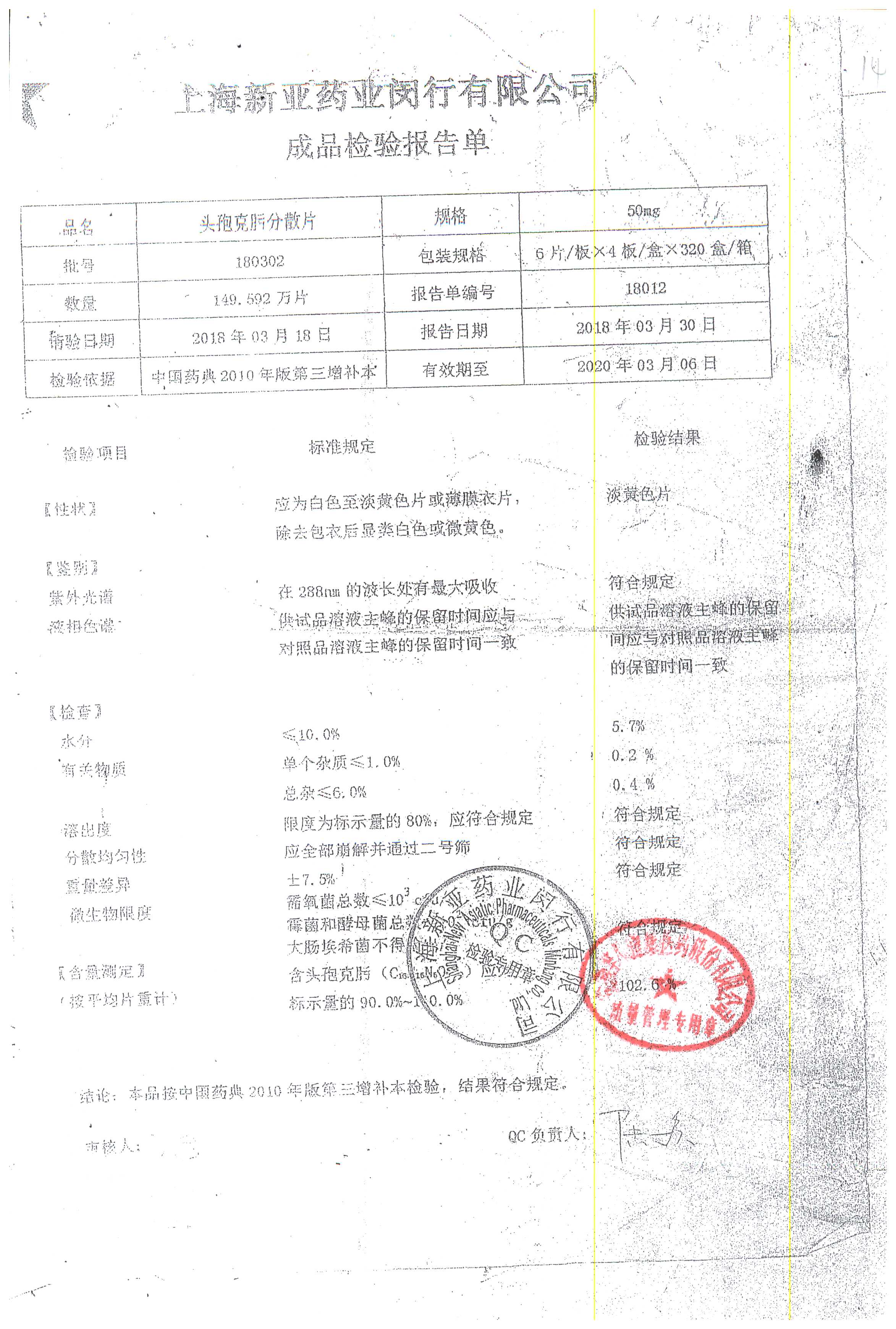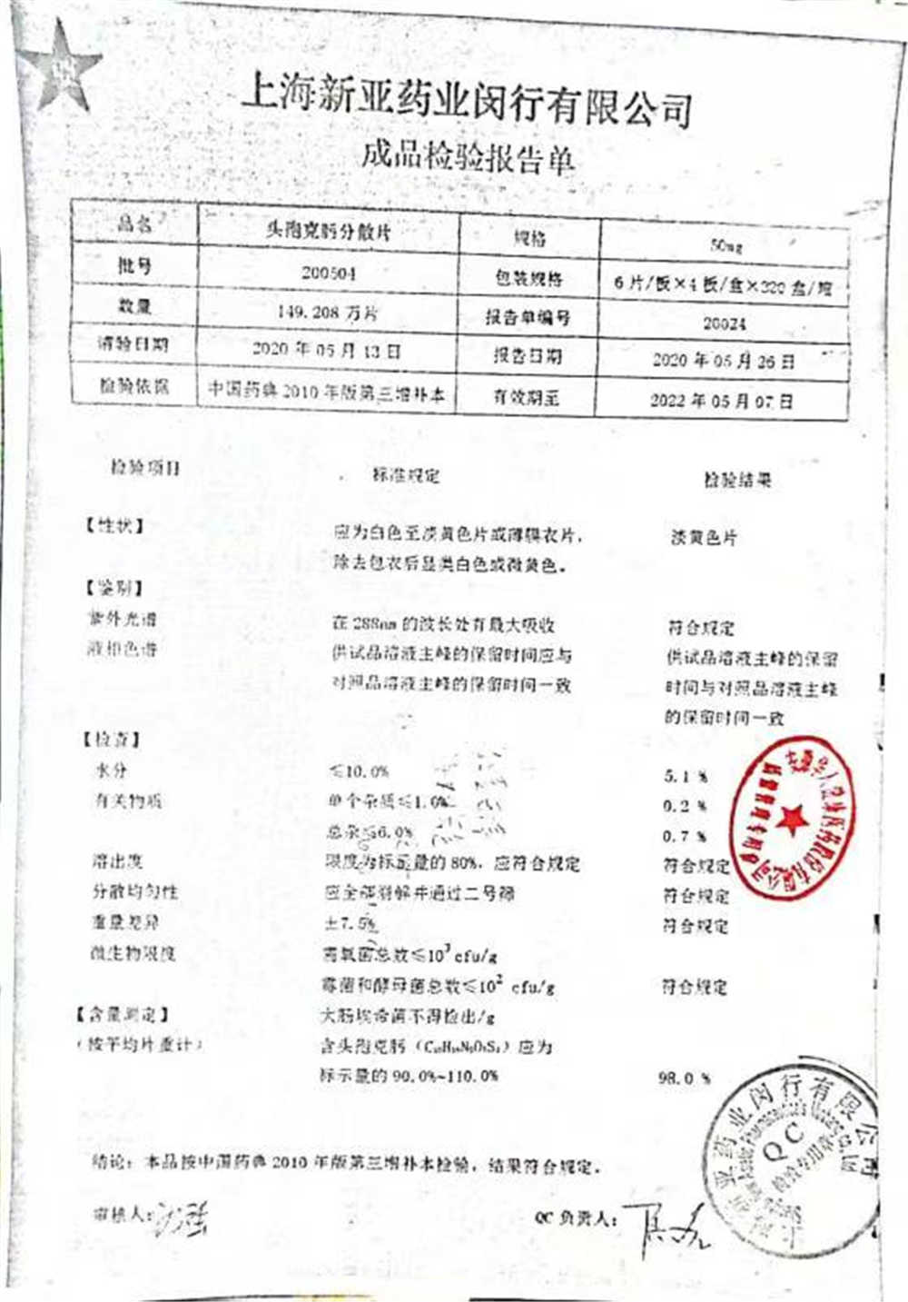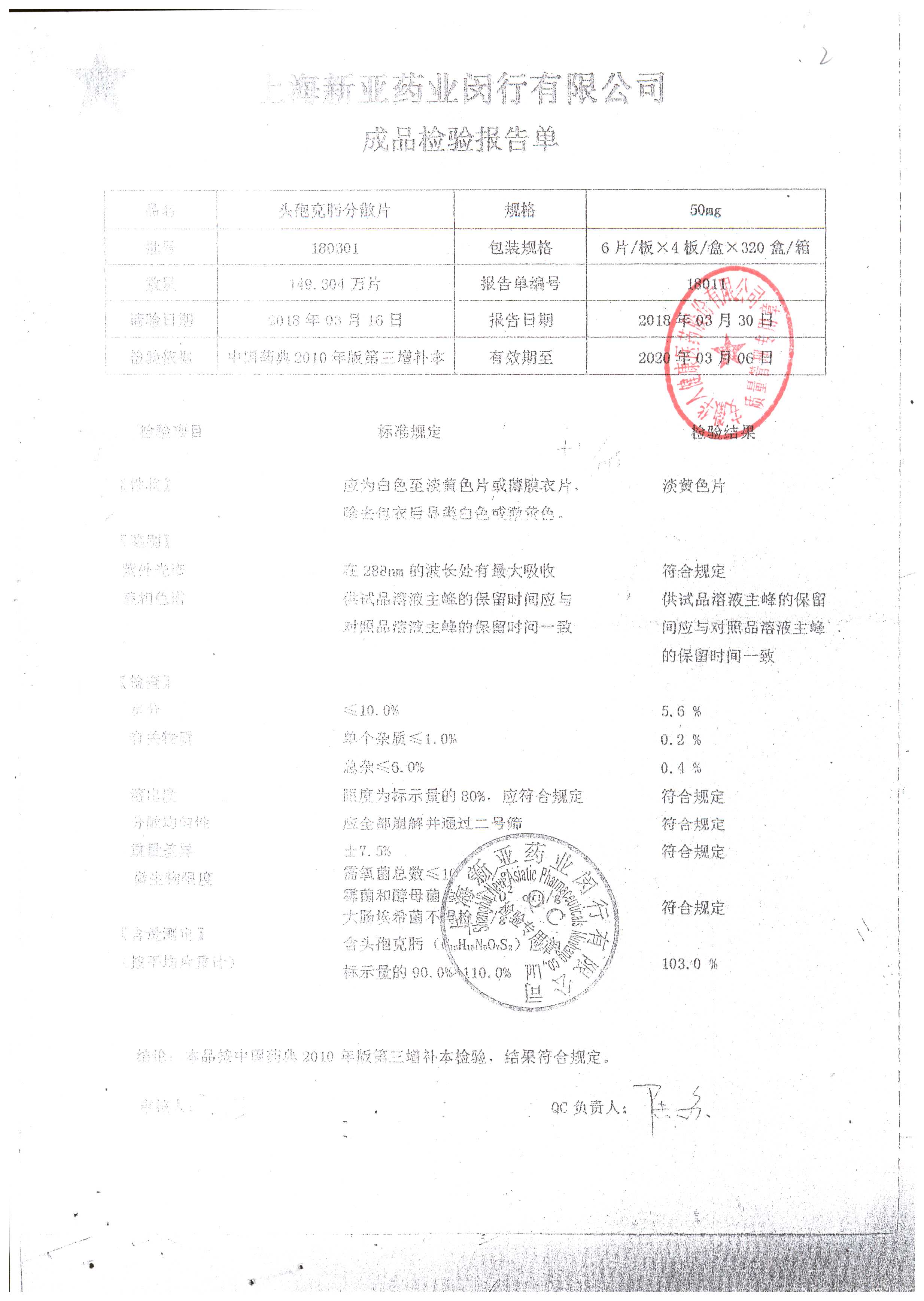 | 頭孢克肟分散片 | 50mg*24s | 190502 | 查看詳情 |