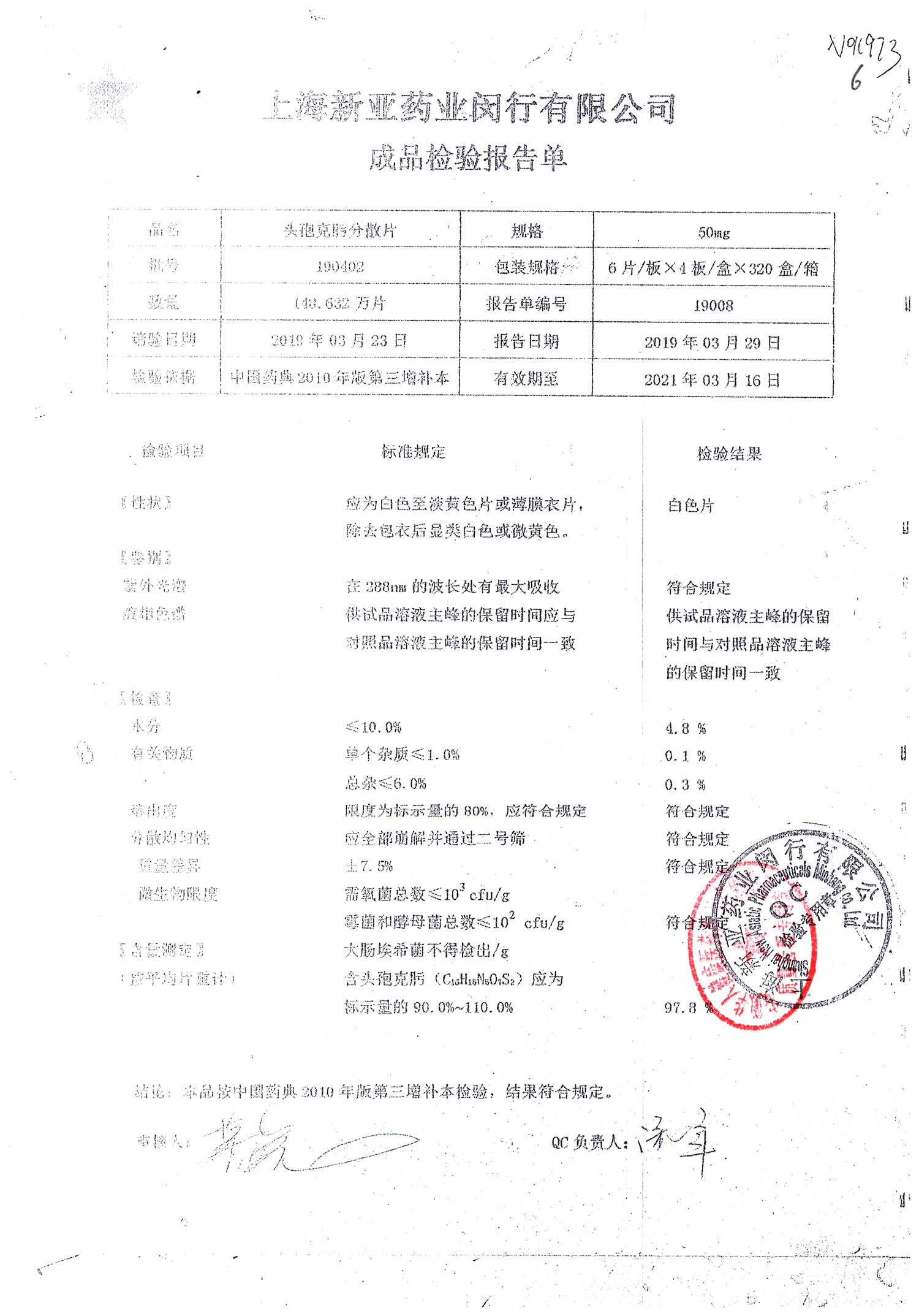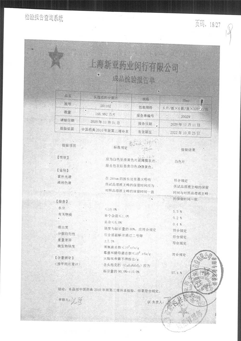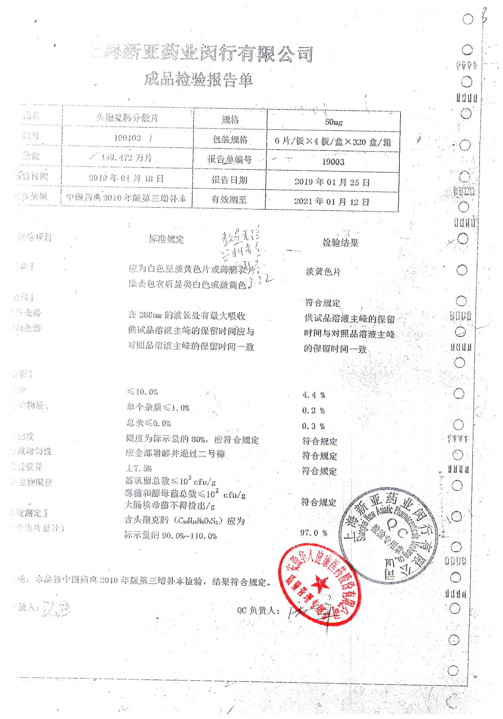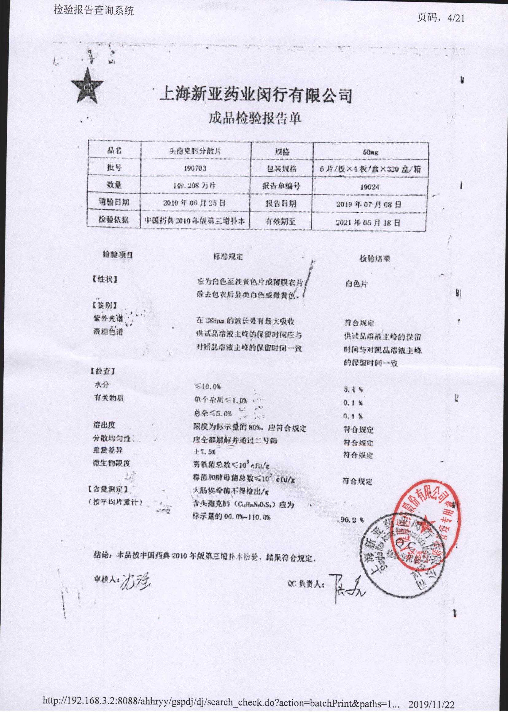 | 頭孢克肟分散片 | 50mg*24s | 190701 | 查看詳情 |