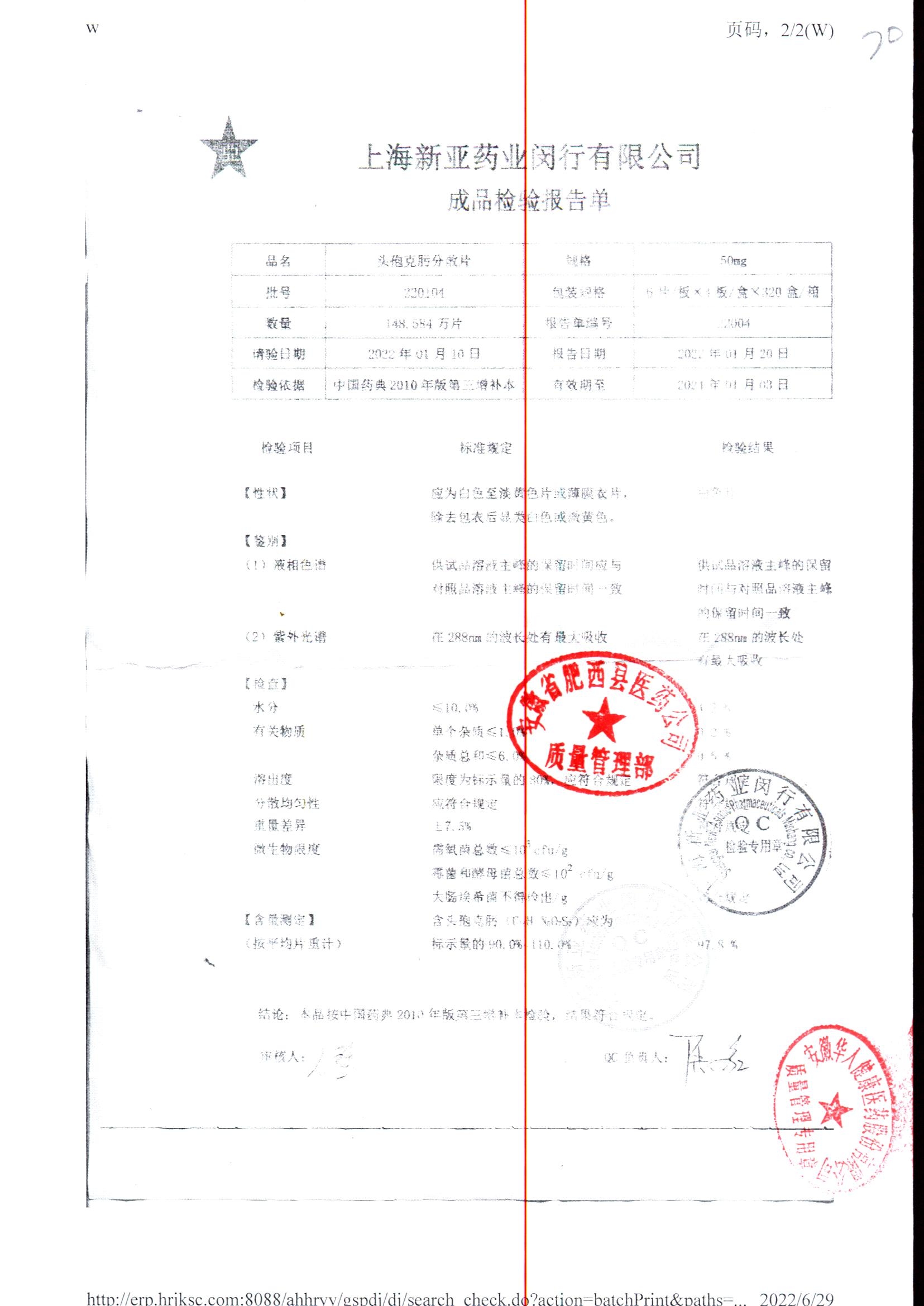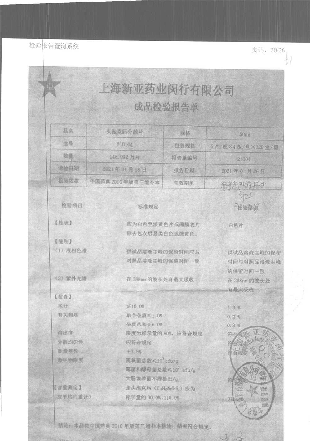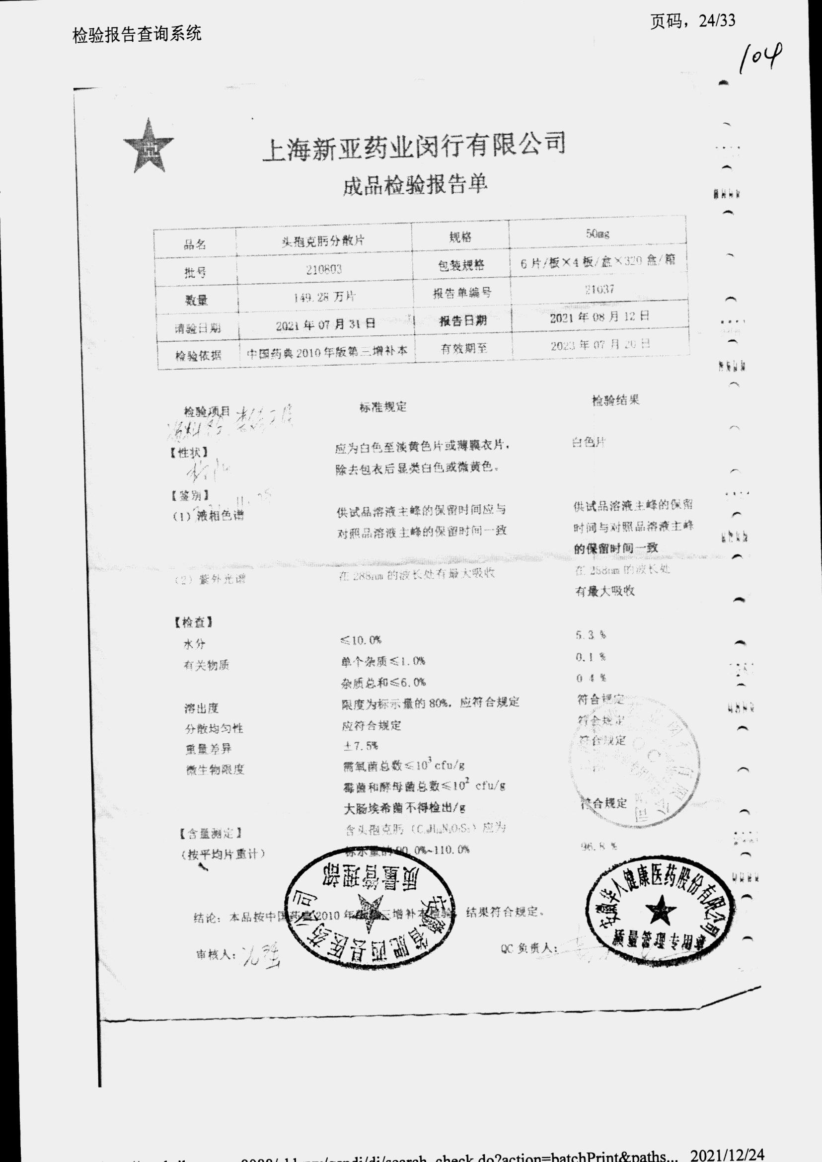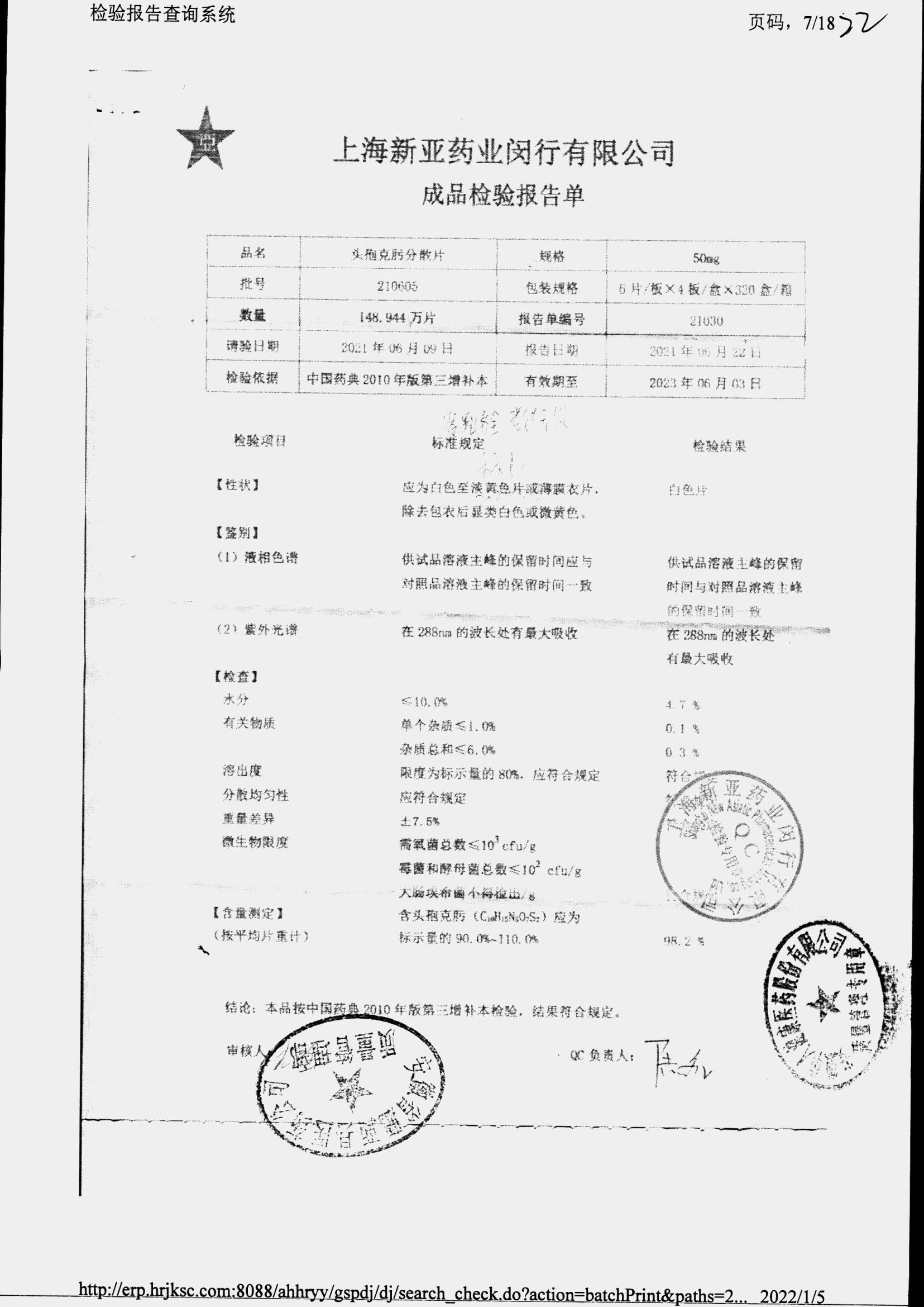 | 頭孢克肟分散片 | 50mg*24s | 210303 | 查看詳情 |