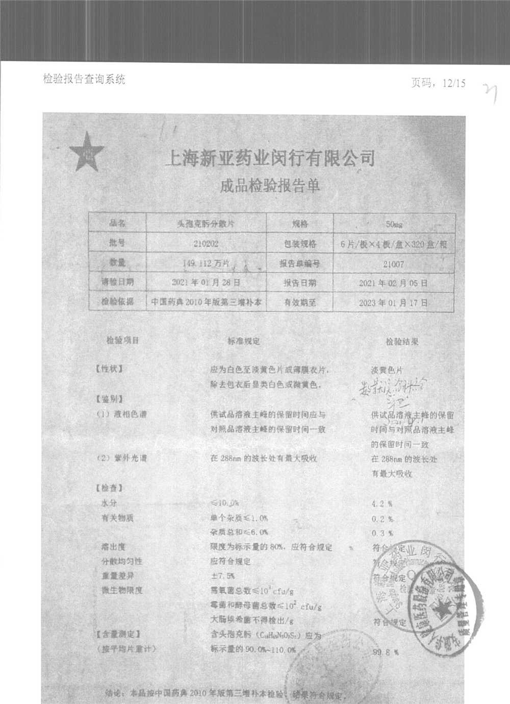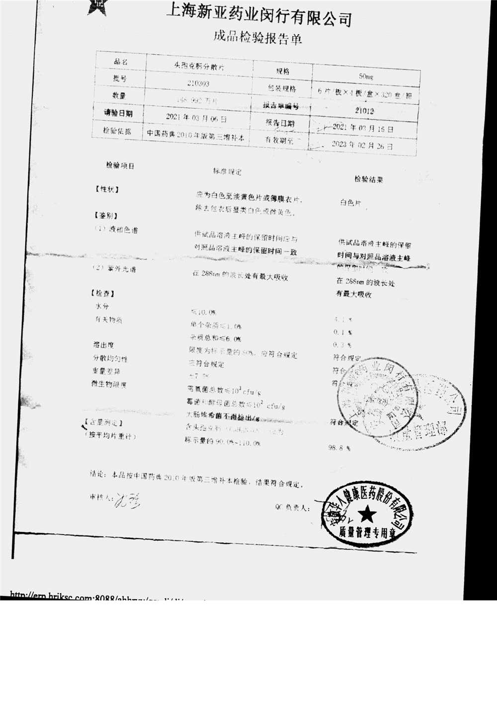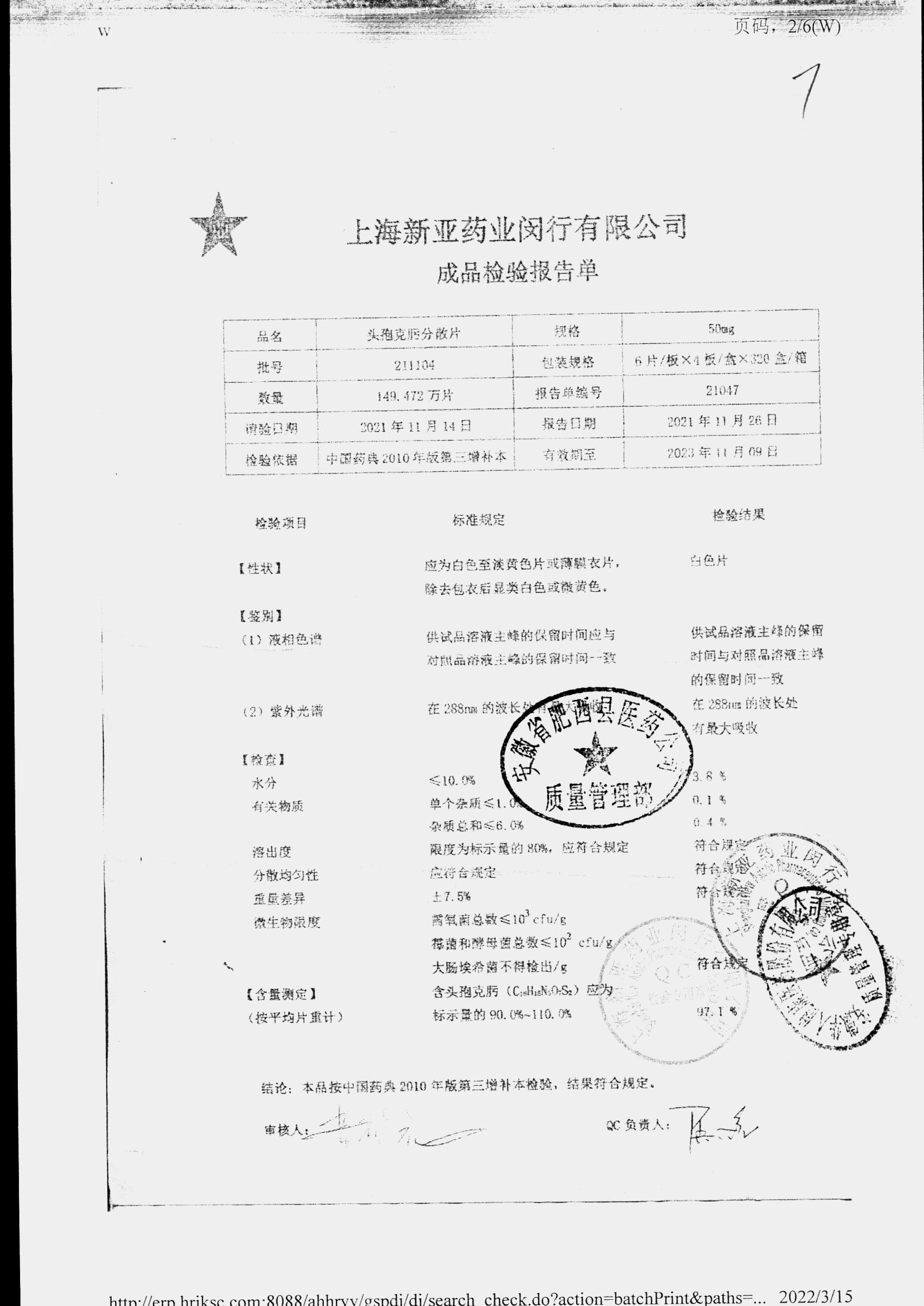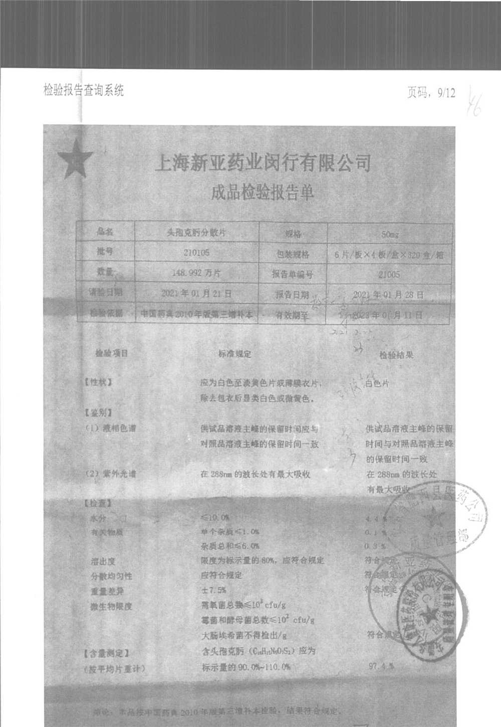 | 頭孢克肟分散片 | 50mg*24s | 210303 | 查看詳情 |