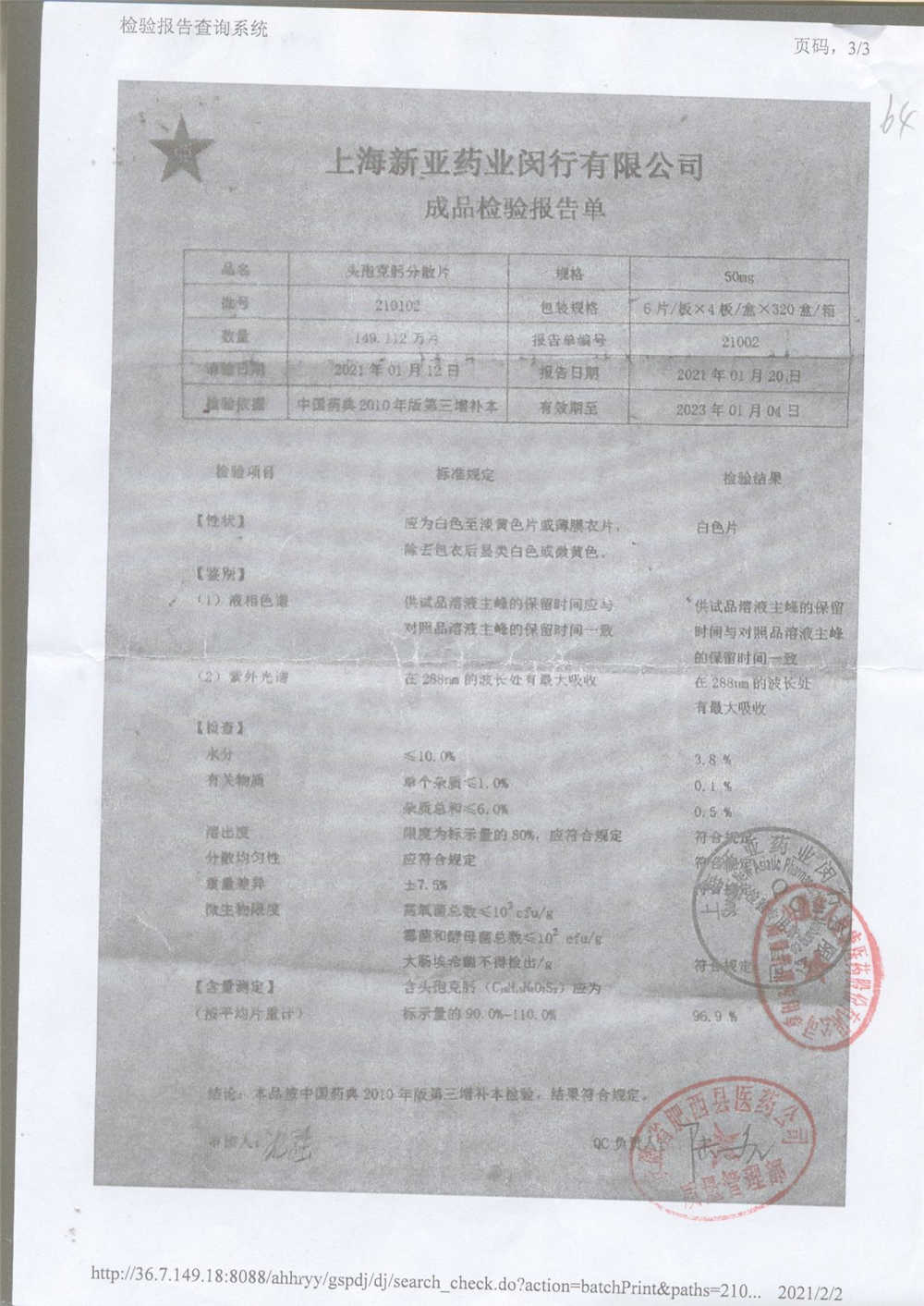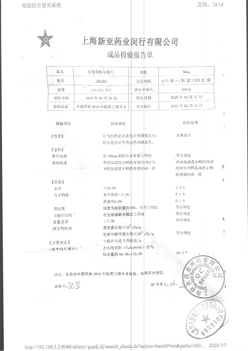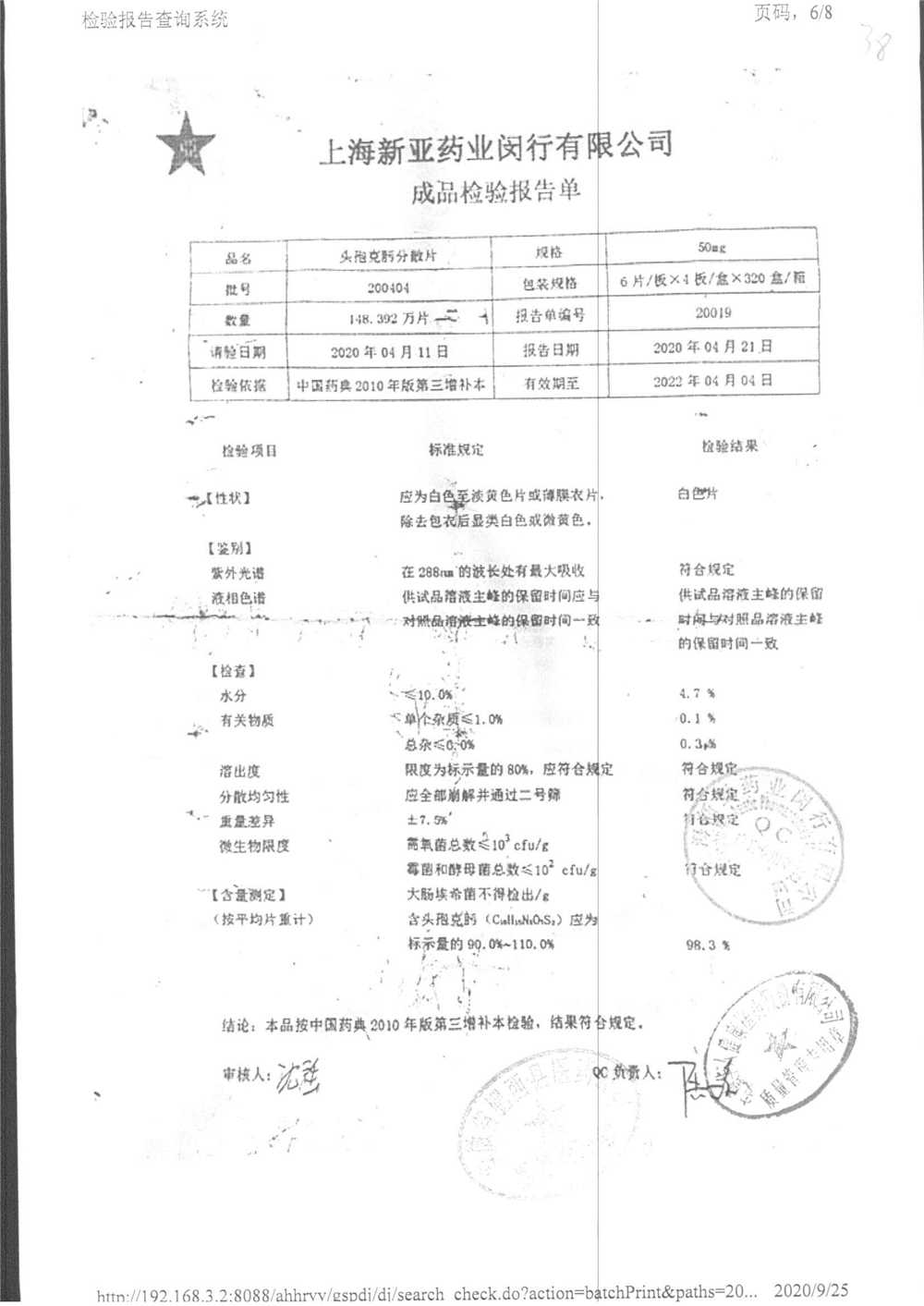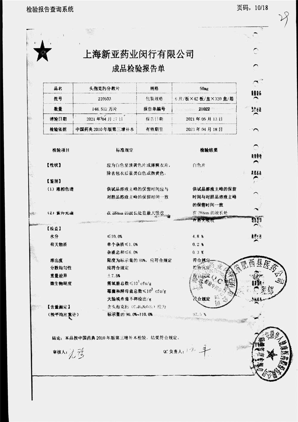 | 頭孢克肟分散片 | 50mg*24s | 210303 | 查看詳情 |