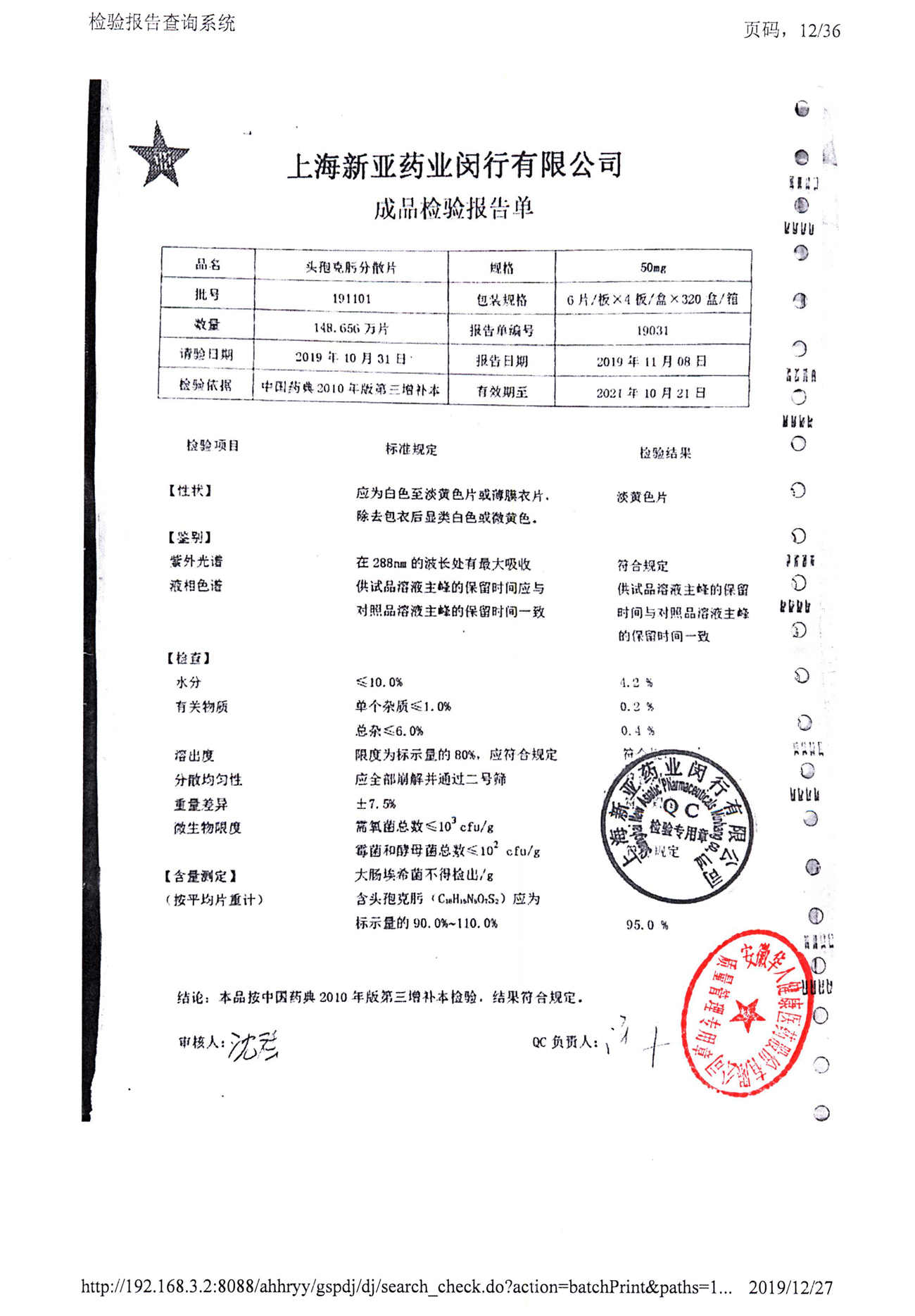 | 頭孢克肟分散片 | 50mg*24s | 191202 | 查看詳情 |