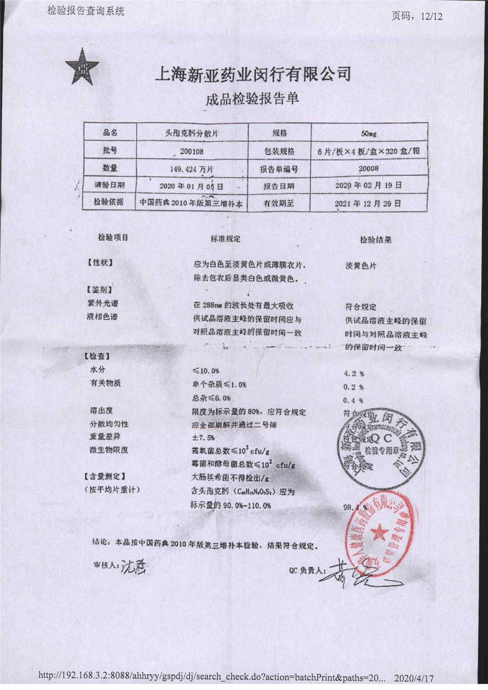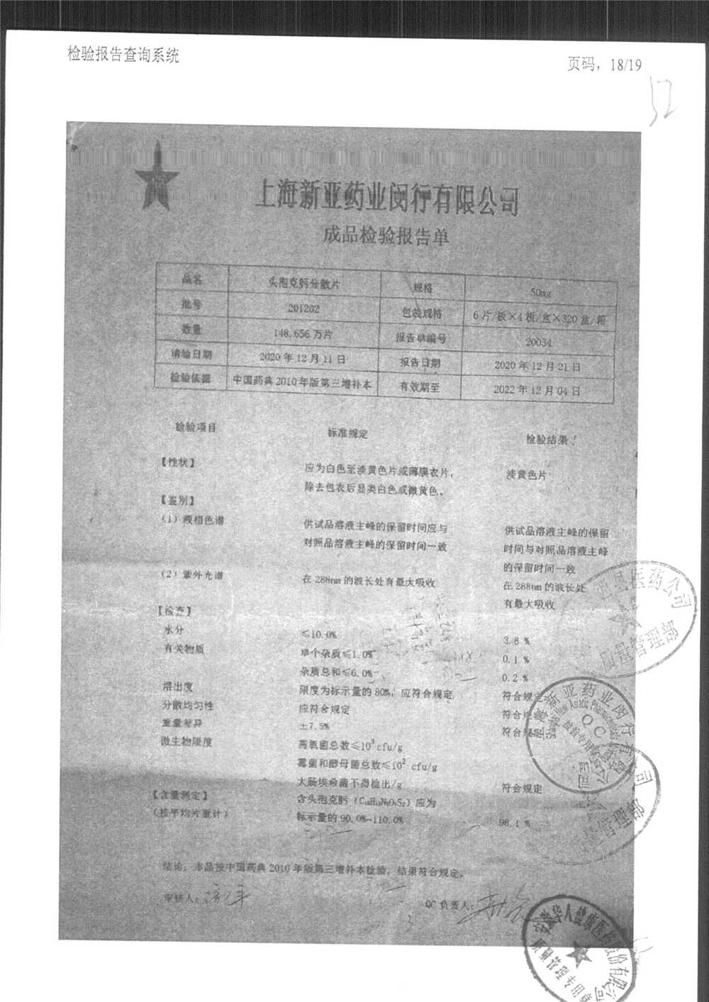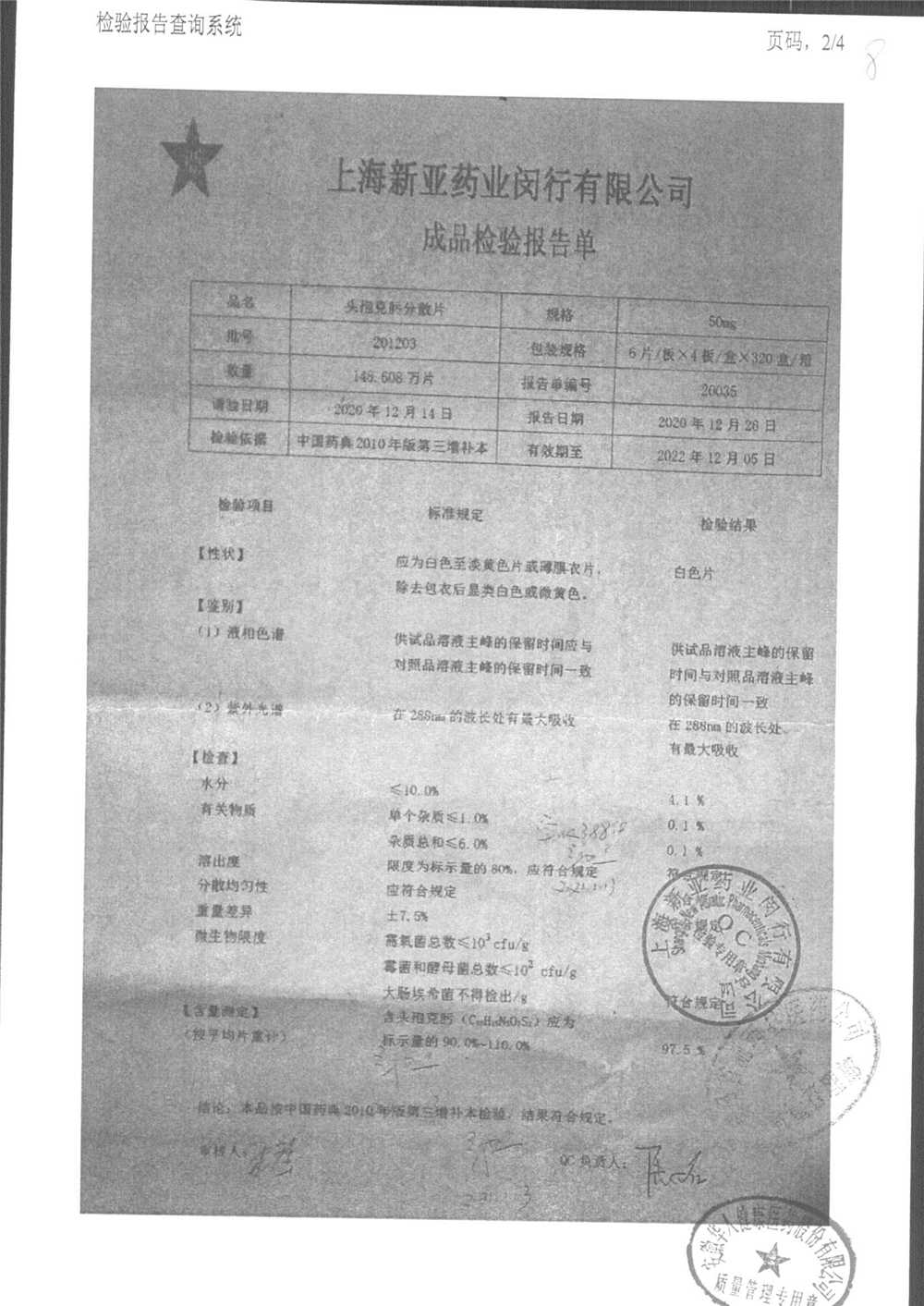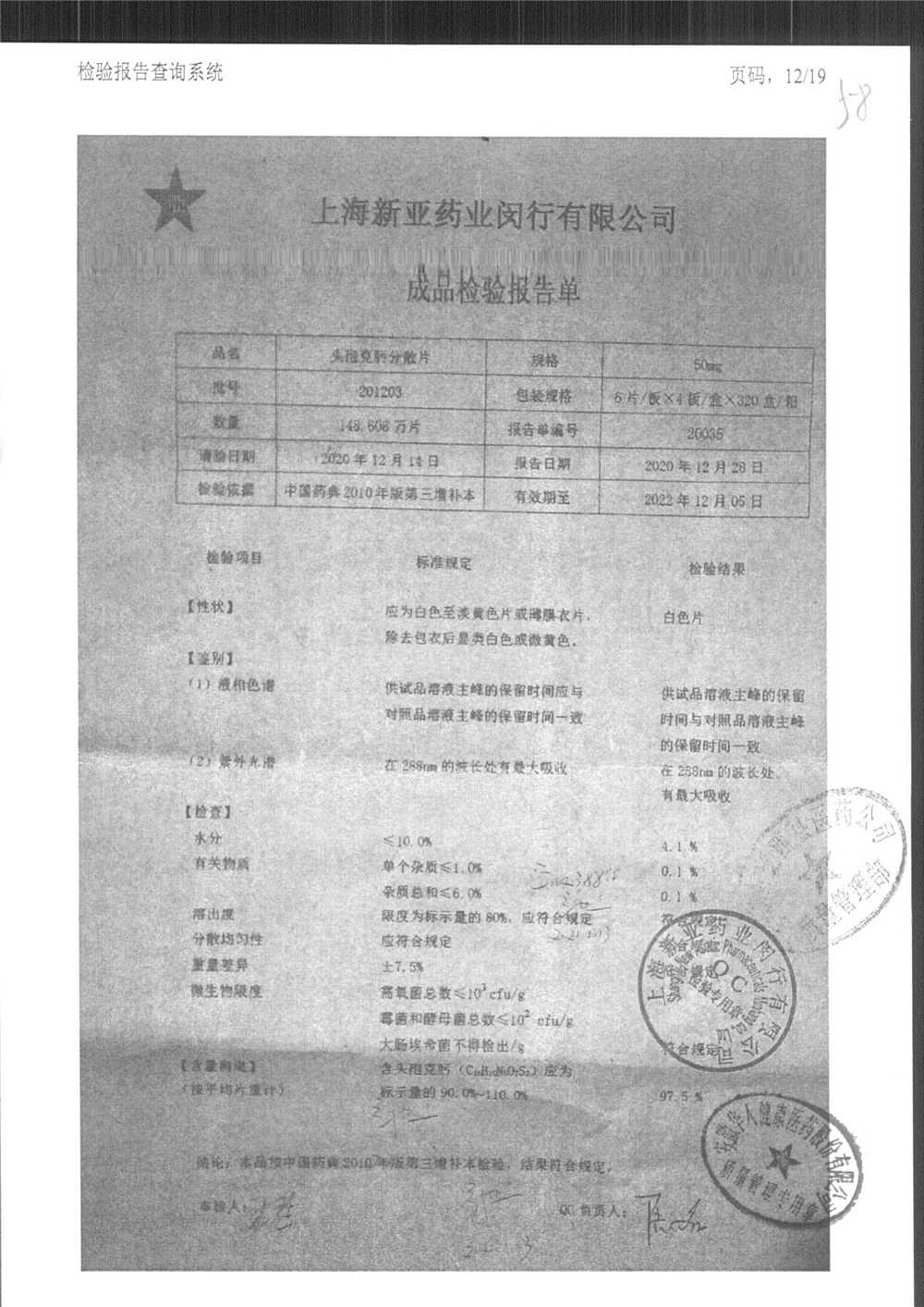 | 頭孢克肟分散片 | 50mg*24s | 201203 | 查看詳情 |