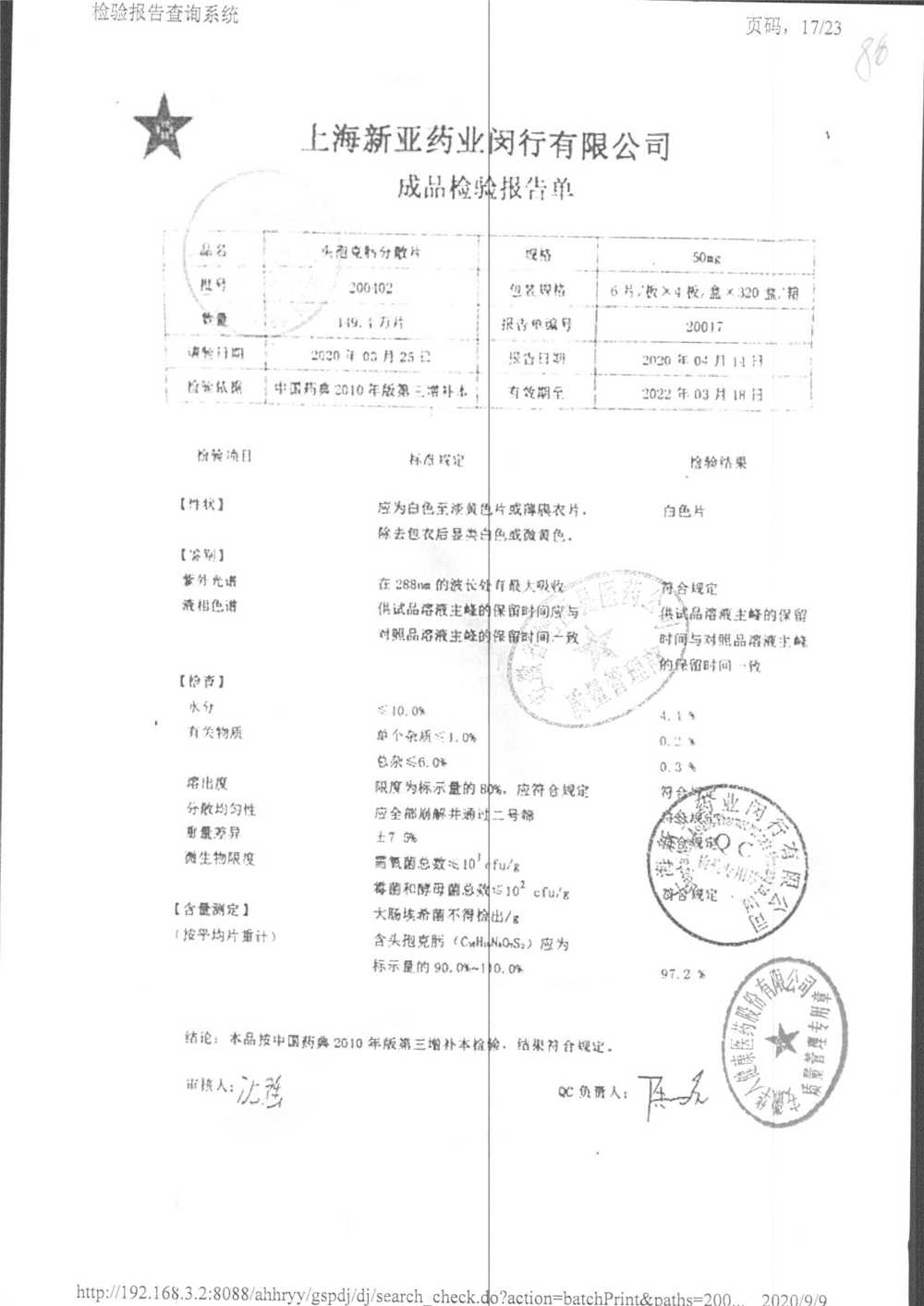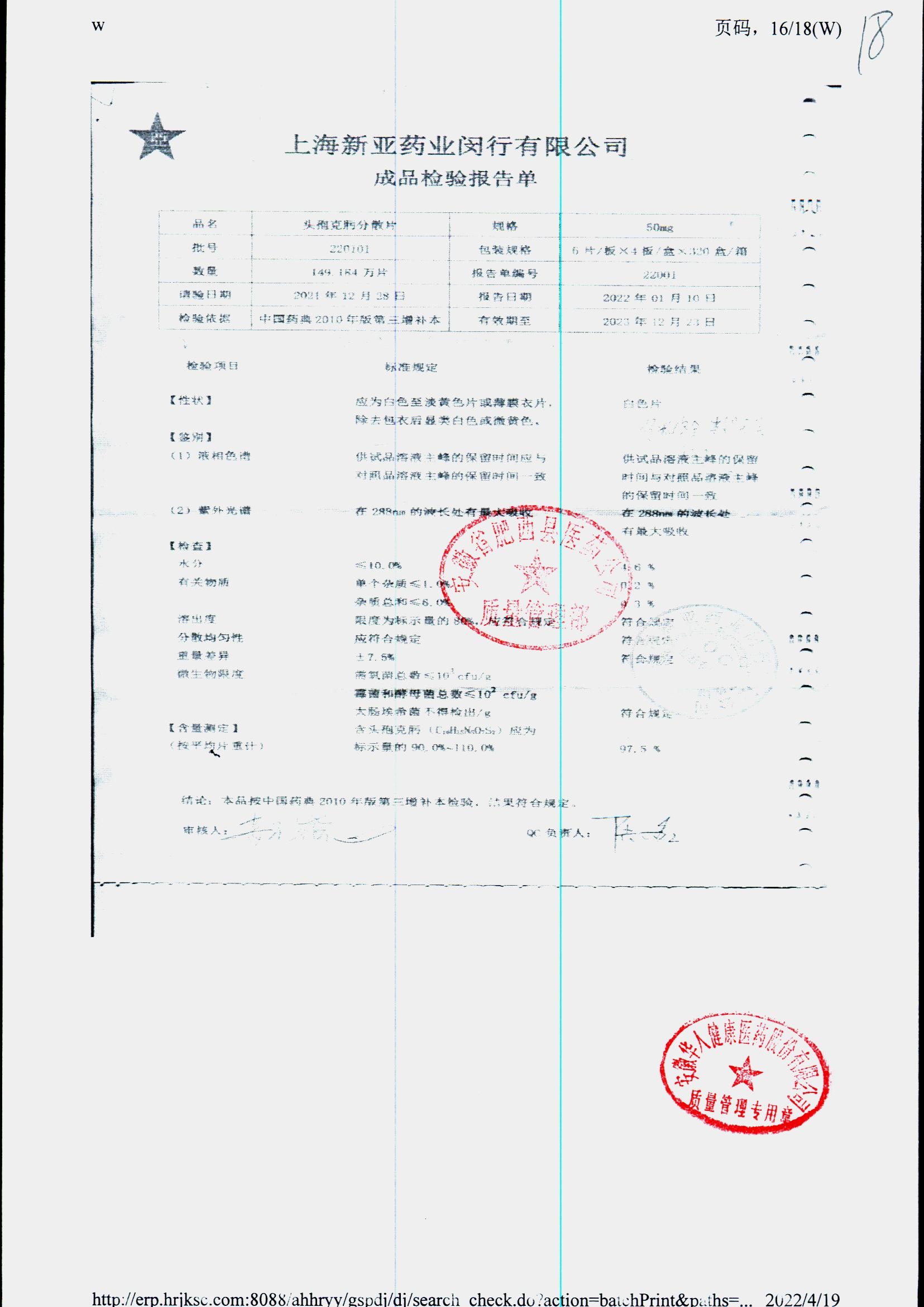 | 頭孢克肟分散片 | 50mg*24s | 210105 | 查看詳情 |