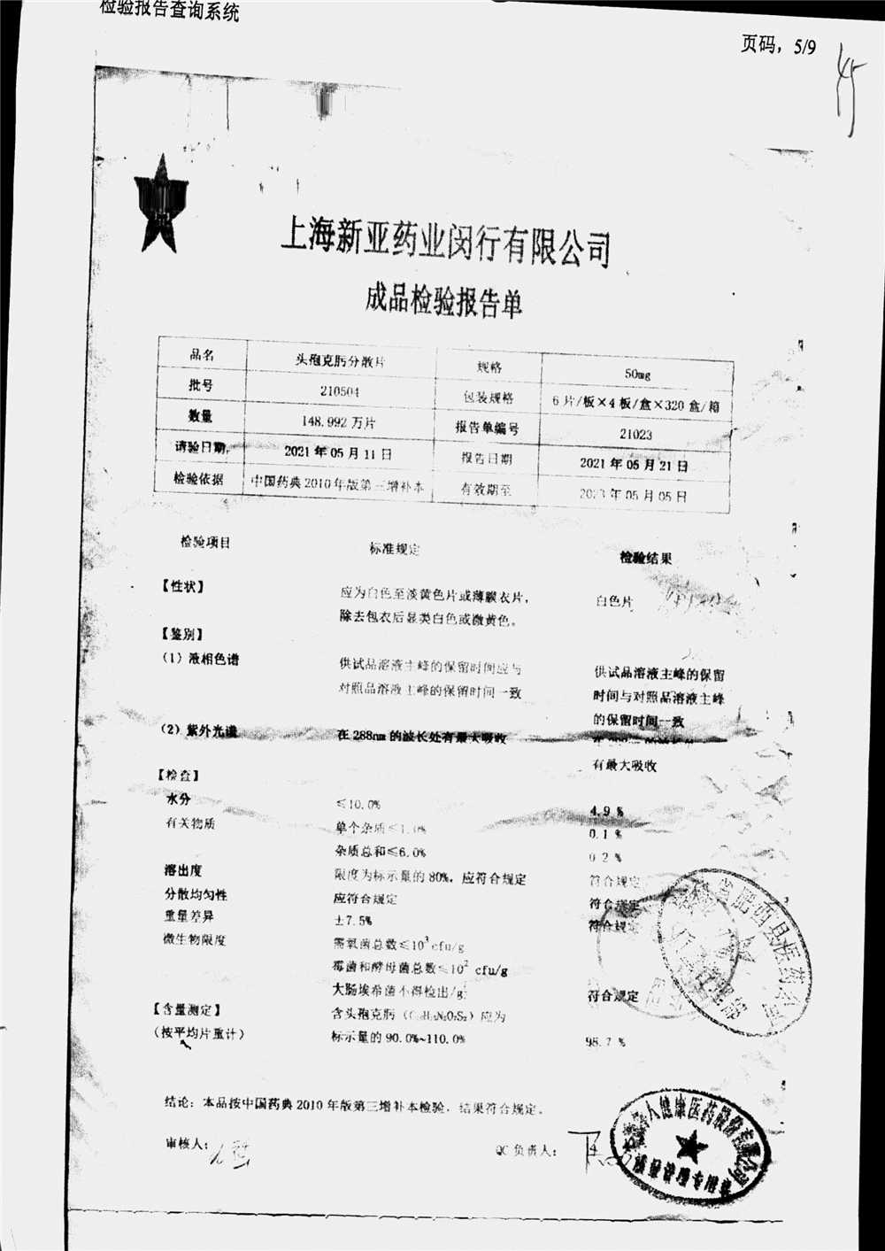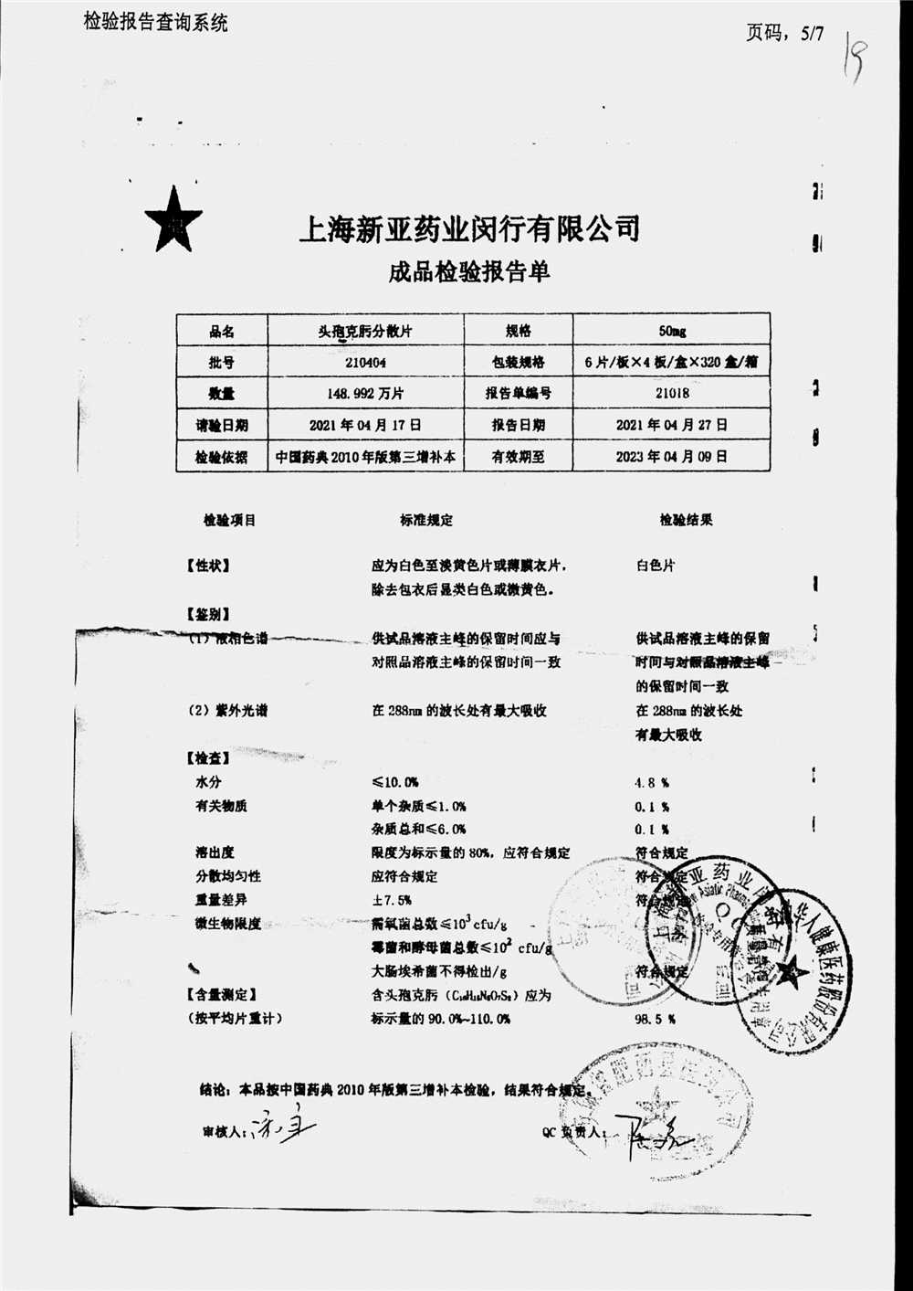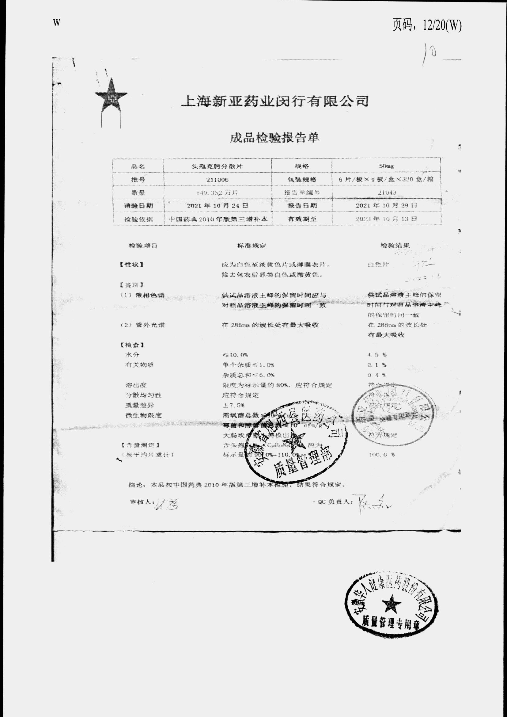 | 頭孢克肟分散片 | 50mg*24s | 210404 | 查看詳情 |