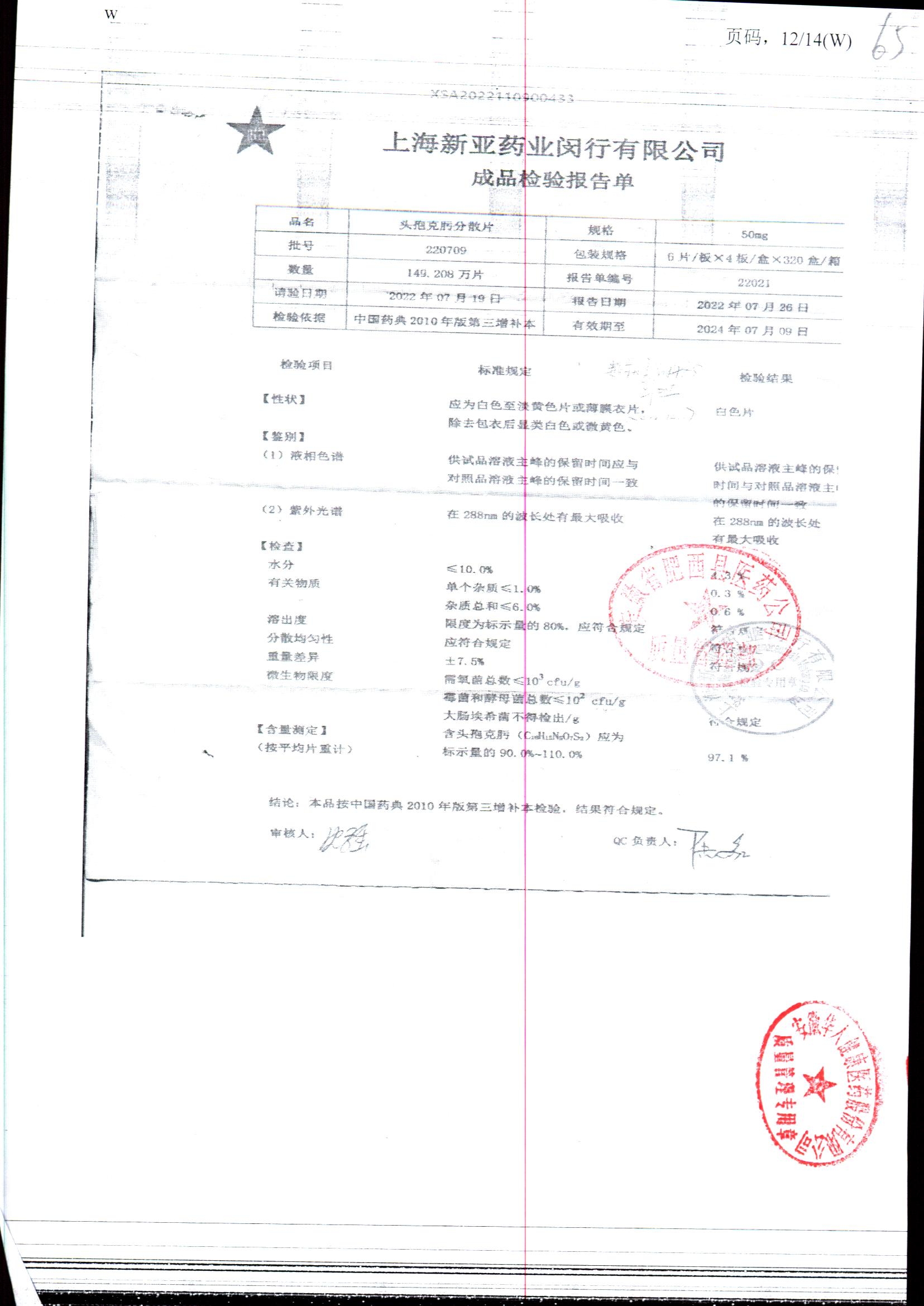 | 頭孢克肟分散片 | 50mg*24s | 220709 | 查看詳情 |