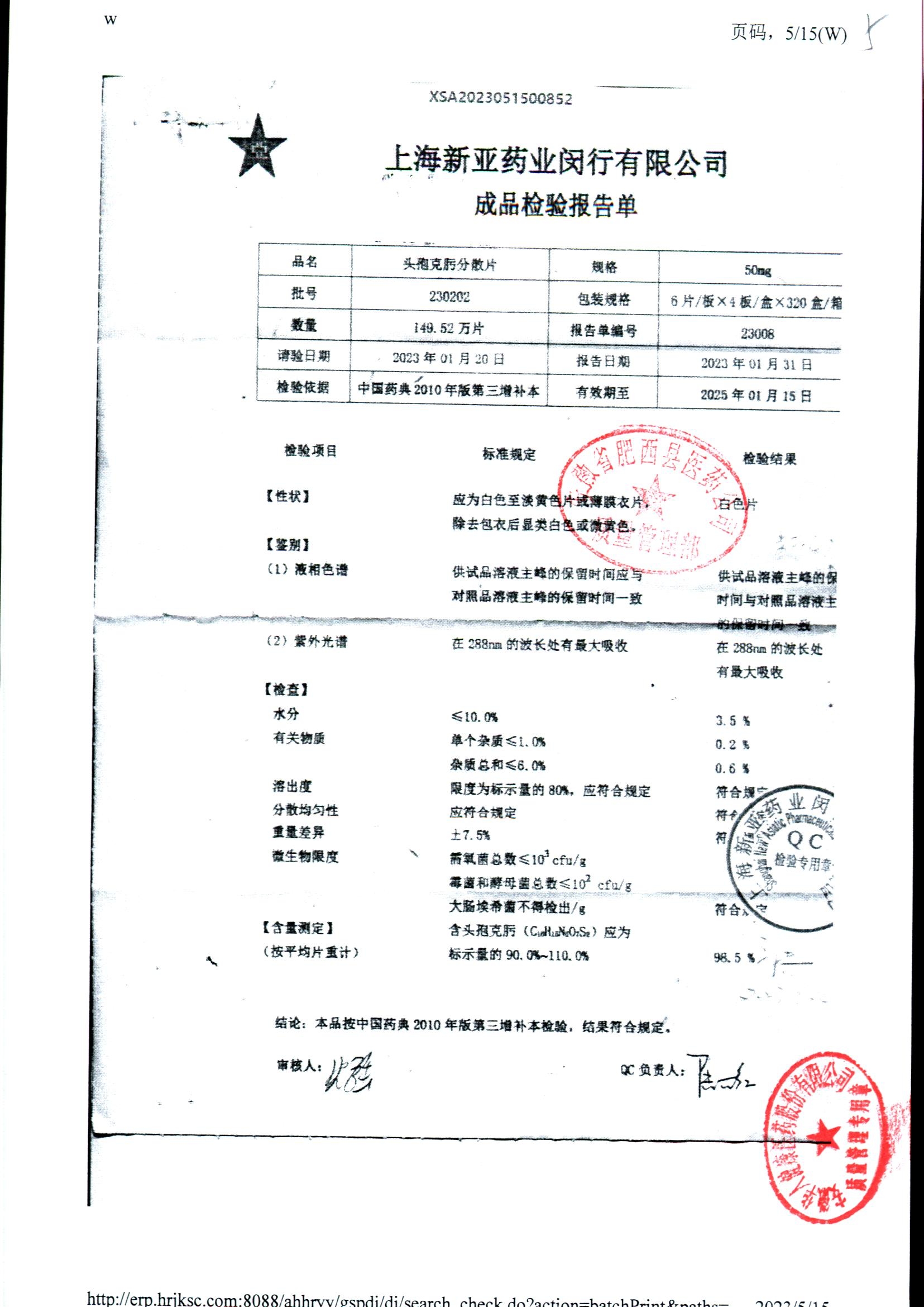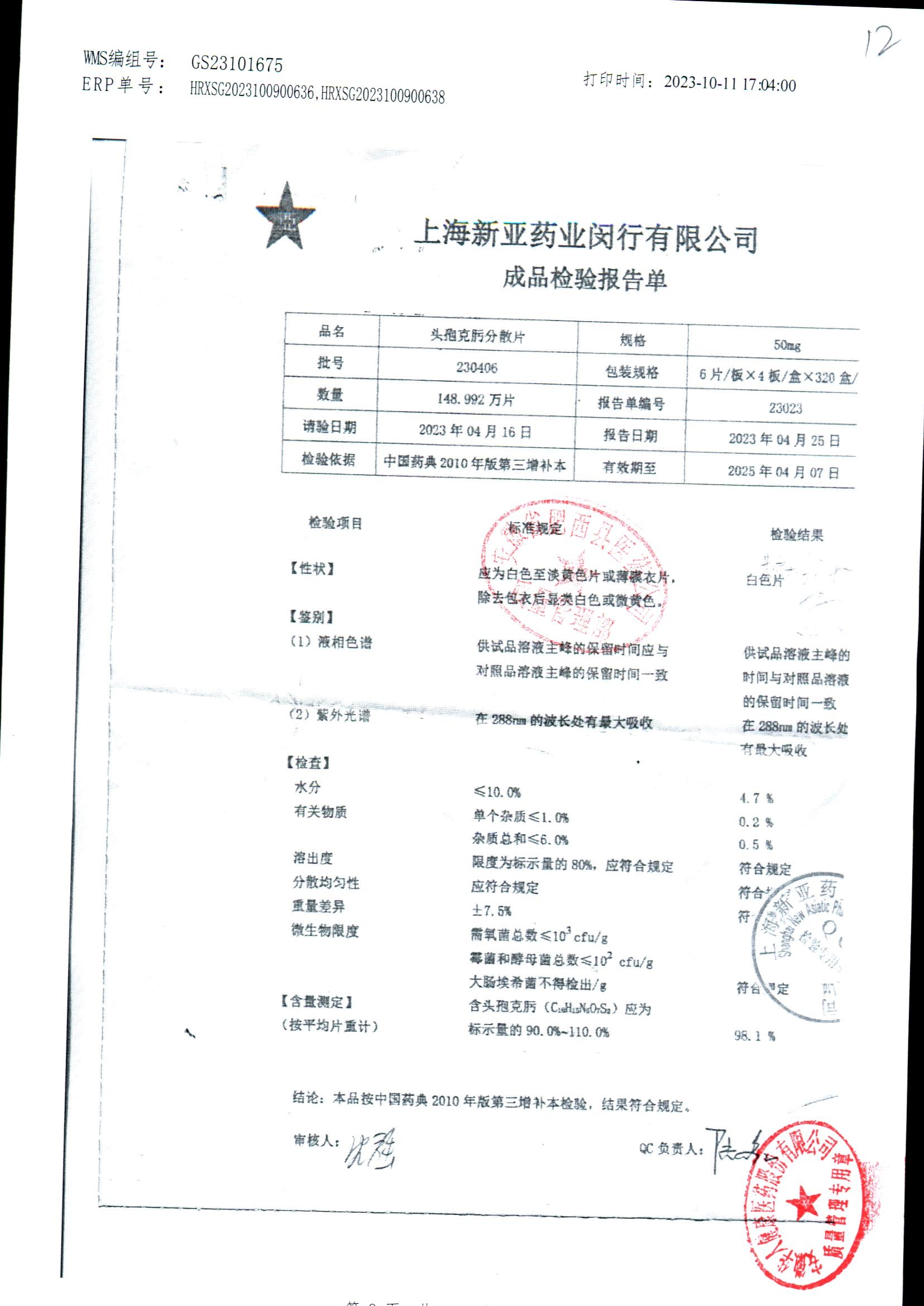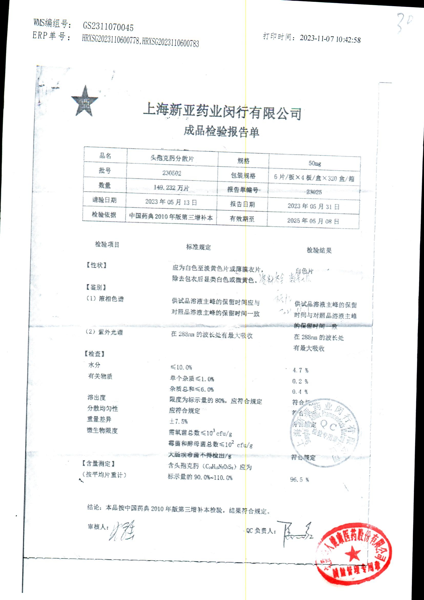 | 頭孢克肟分散片 | 50mg*24s | 230404 | 查看詳情 |