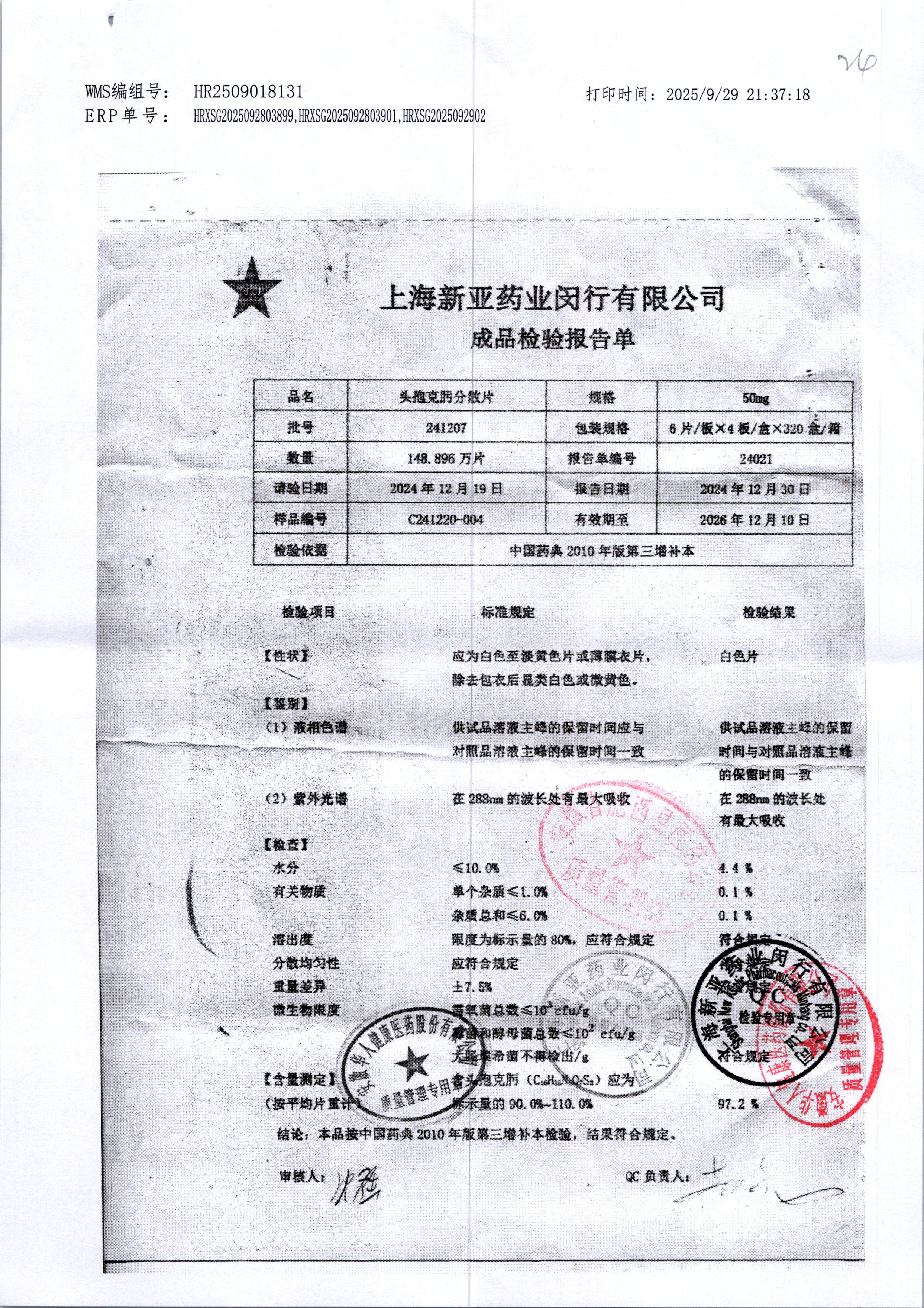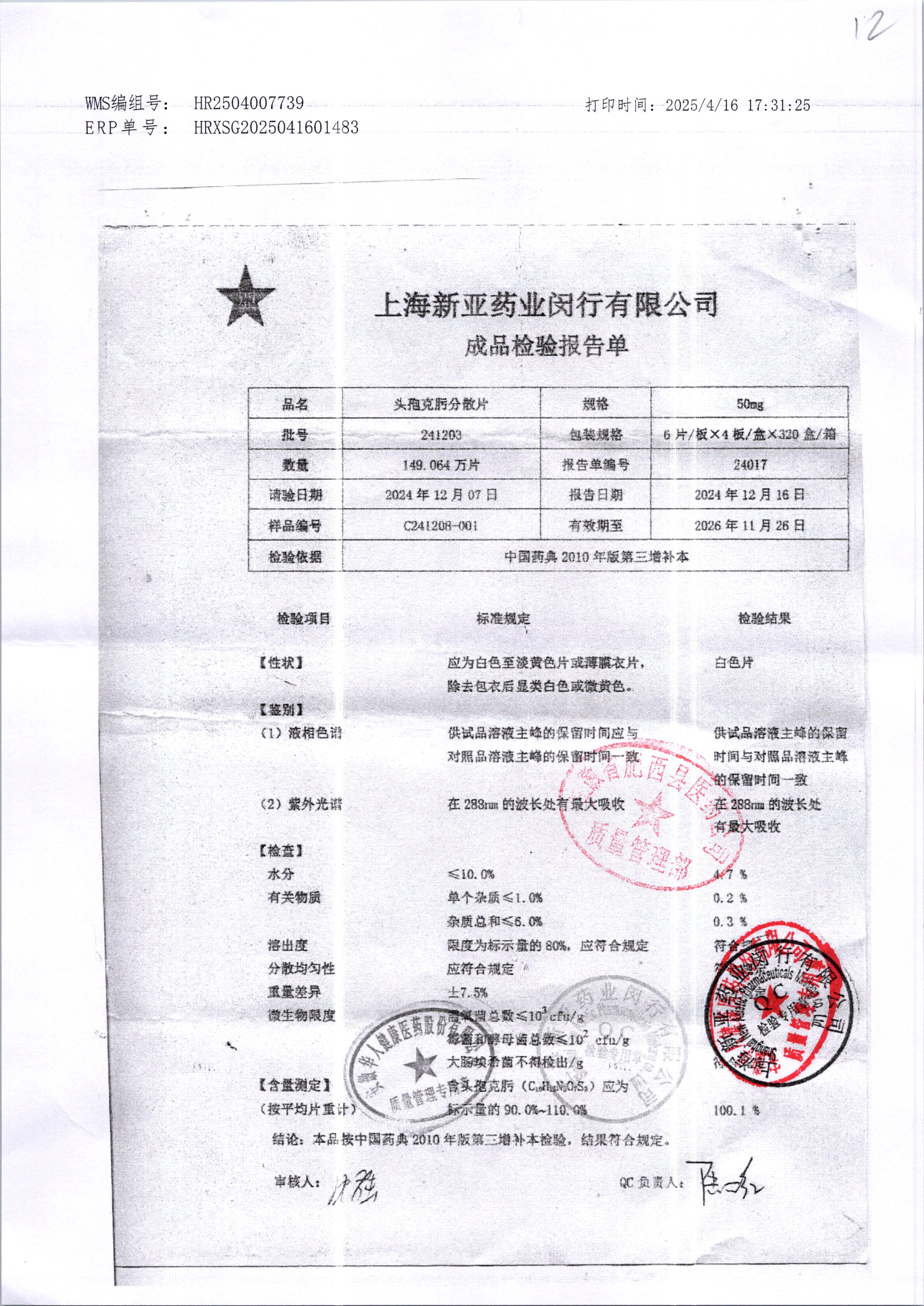 | 頭孢克肟分散片 | 50mg*24s | 241203 | 查看詳情 |