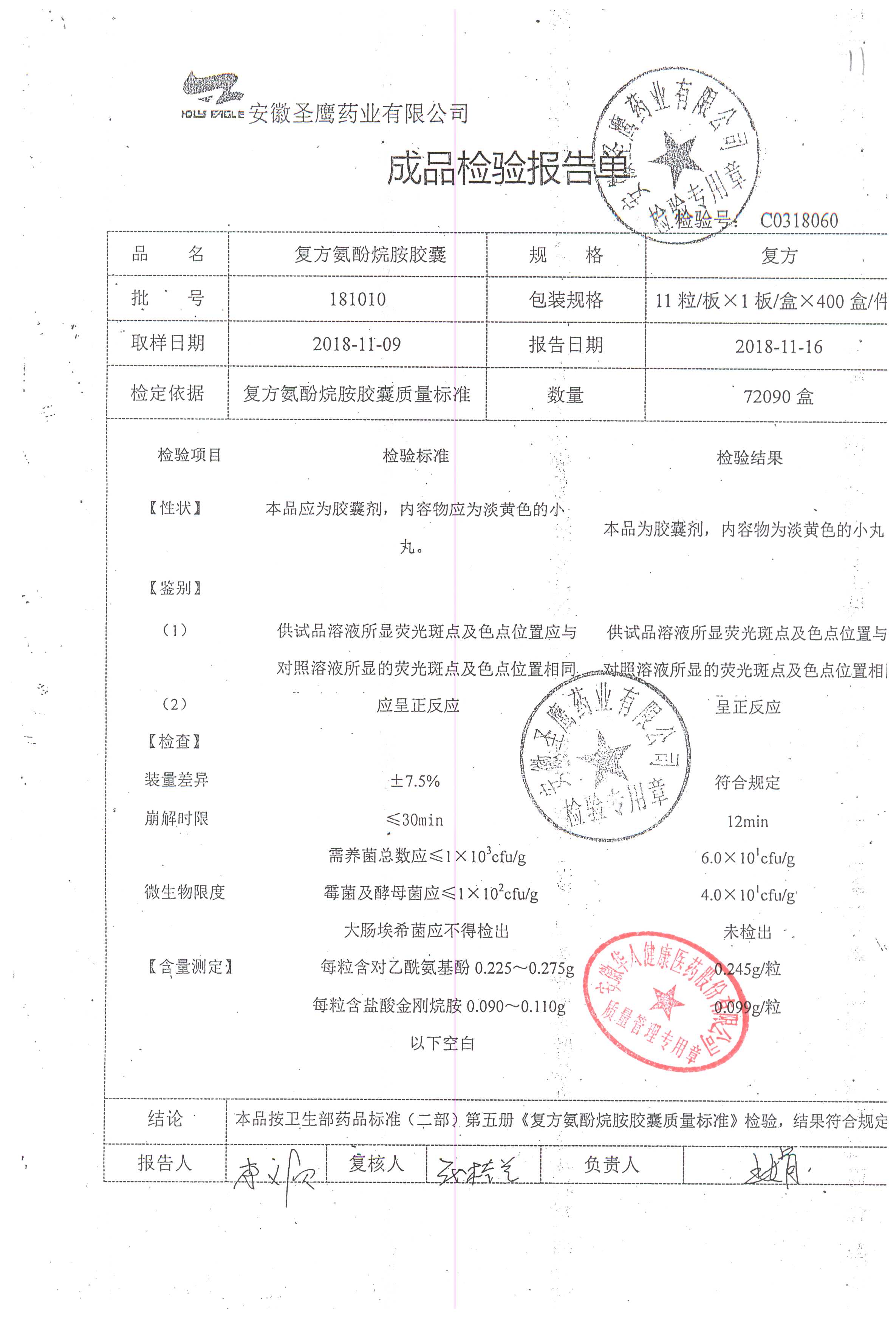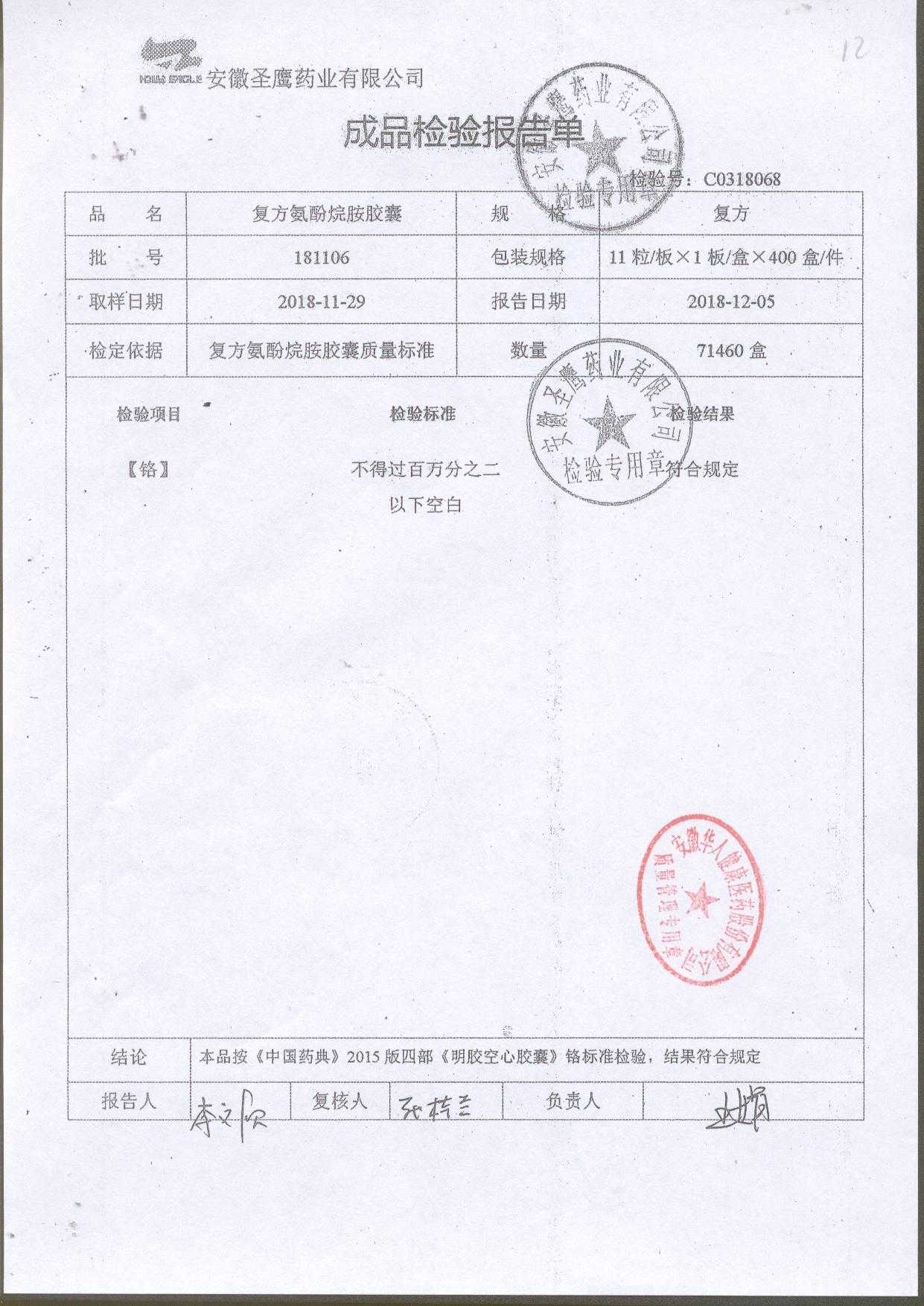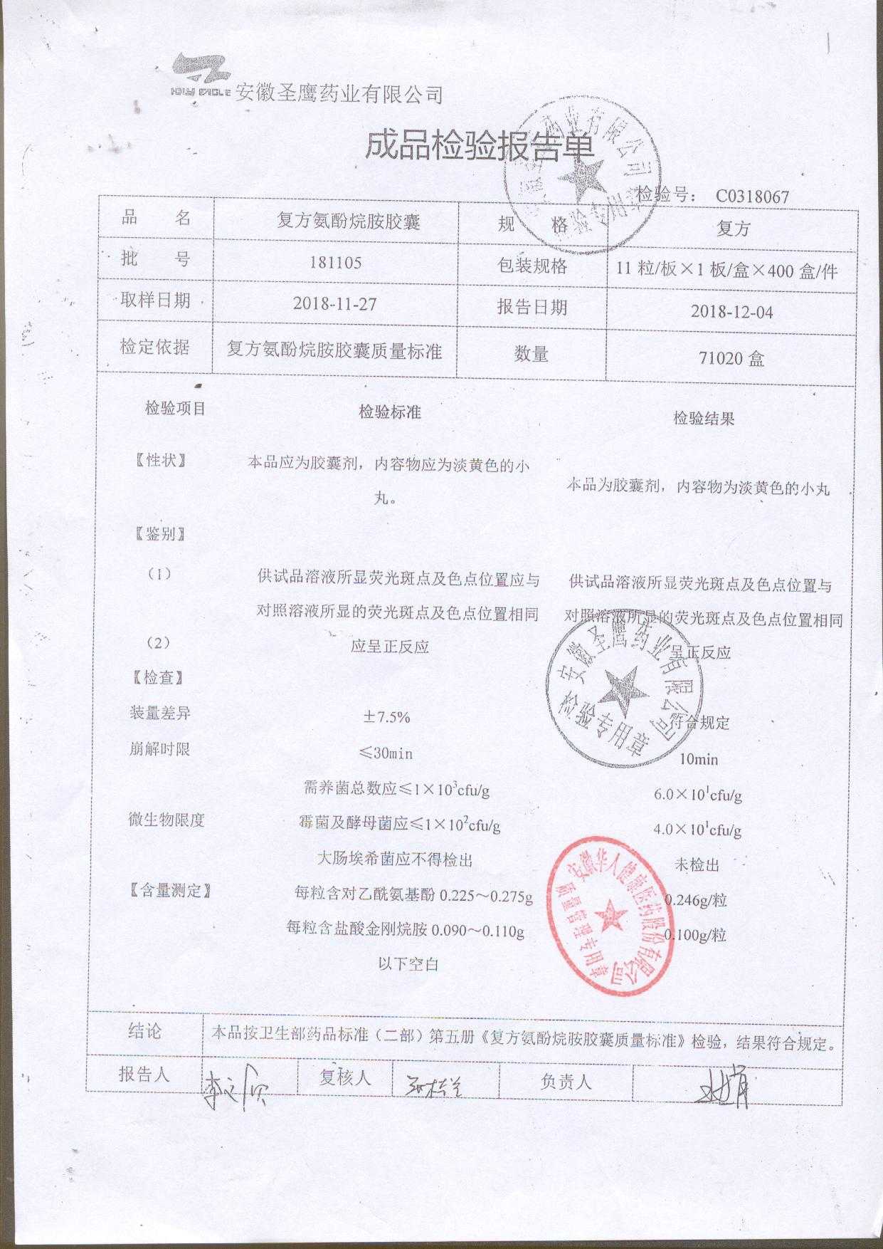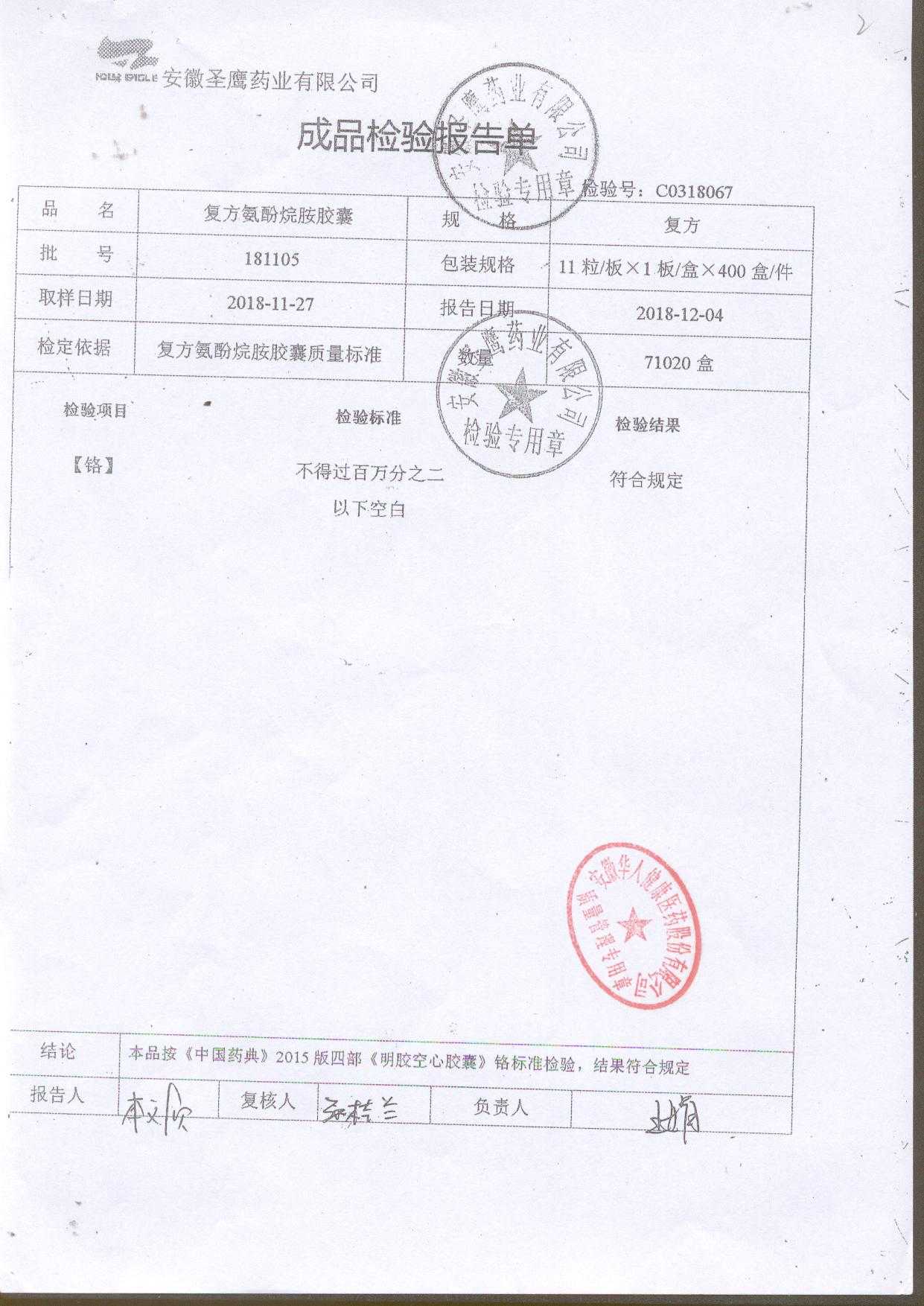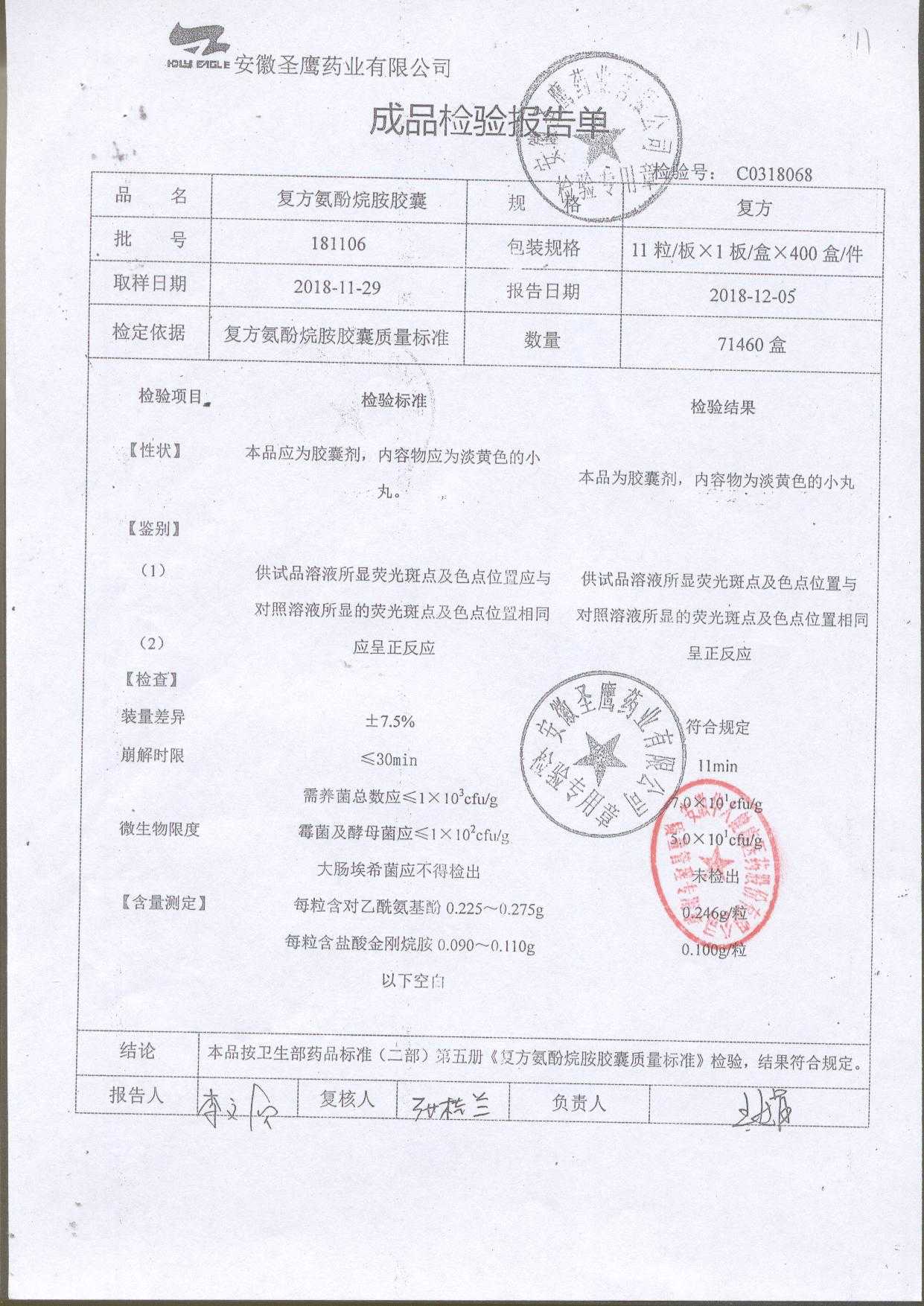 | 復方氨酚烷胺膠囊 | 11s*1 | 181105(2/2) | 查看詳情 |