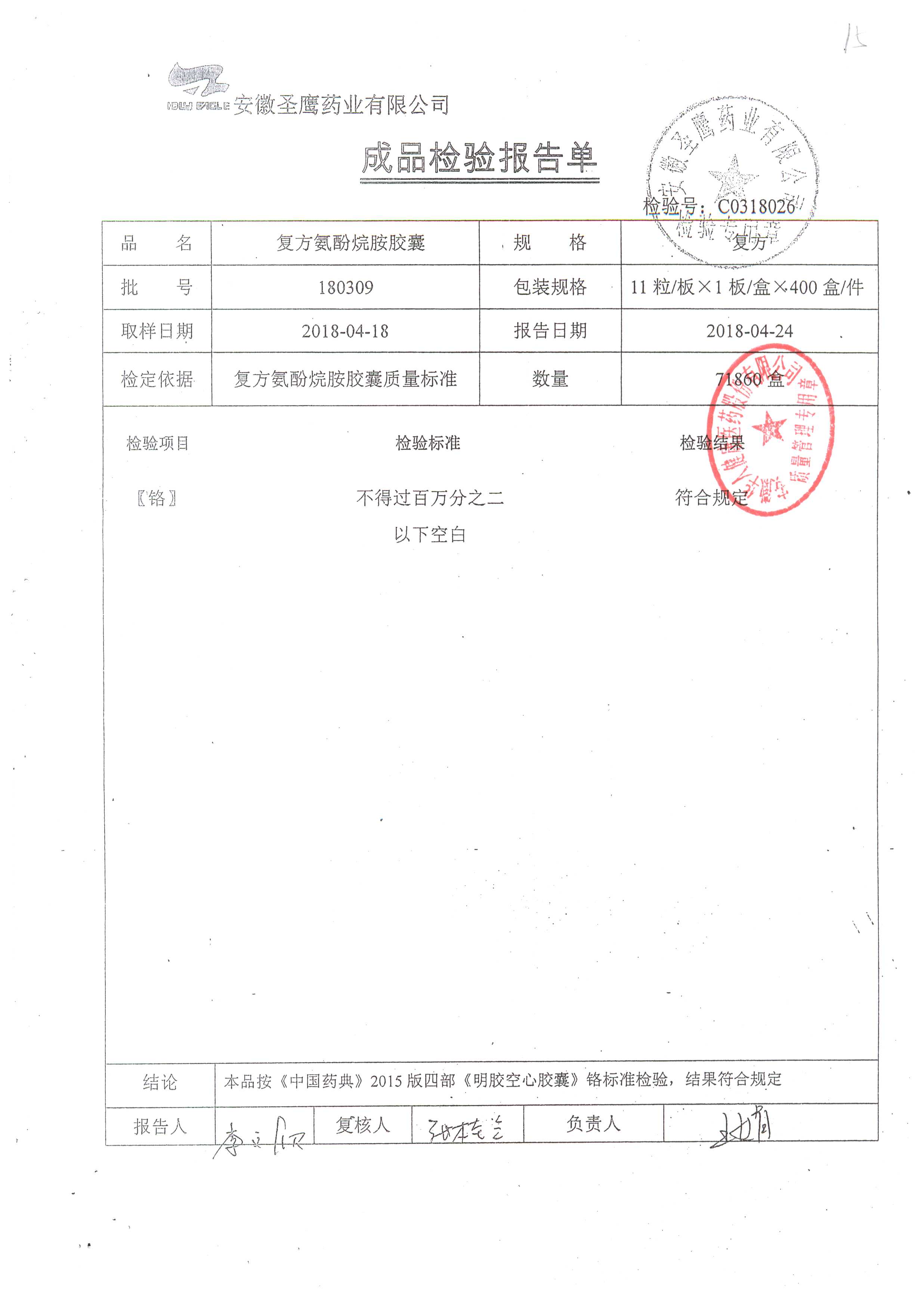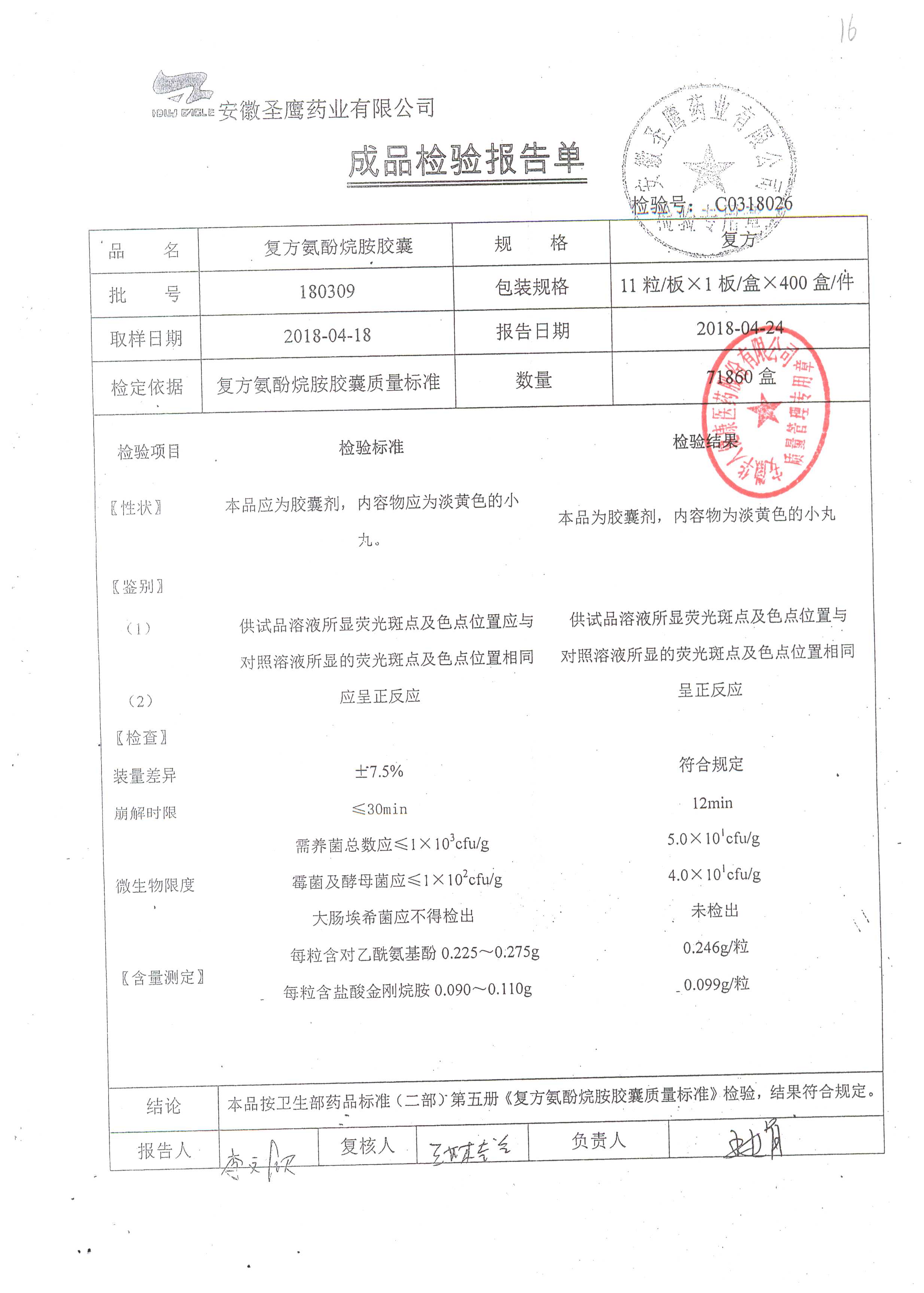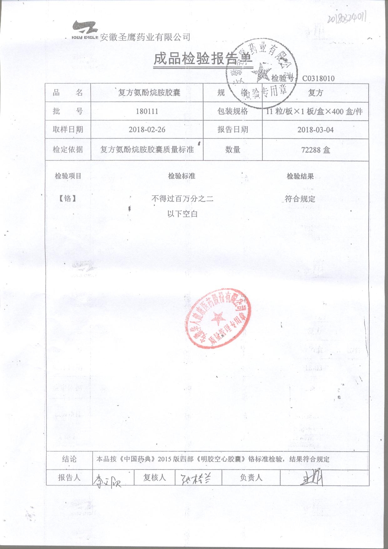| 復方氨酚烷胺膠囊 | 11s*1 | 180405(1/2) | 查看詳情 |