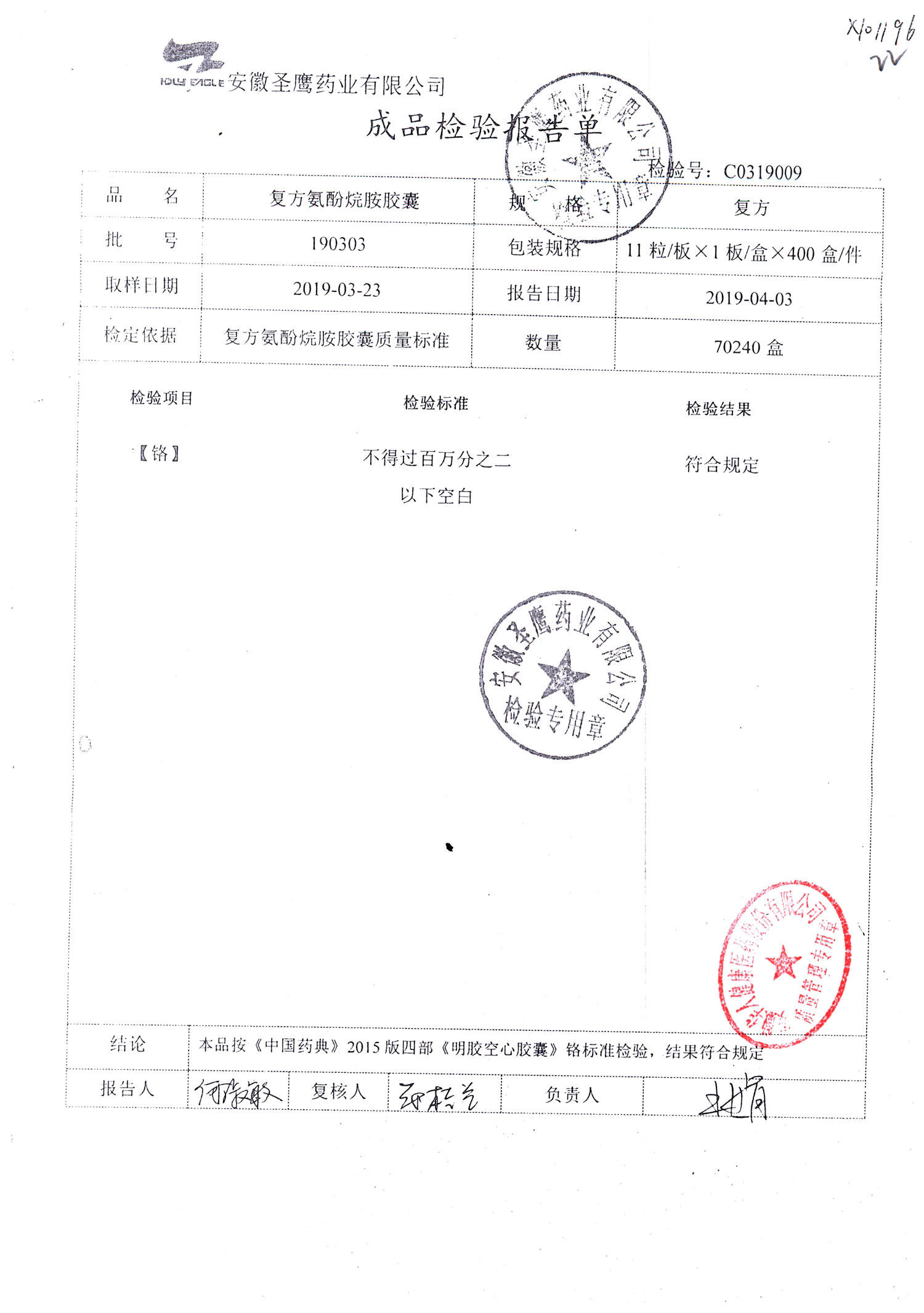 | 復方氨酚烷胺膠囊 | 11s*1 | 180309(鉻) | 查看詳情 |
