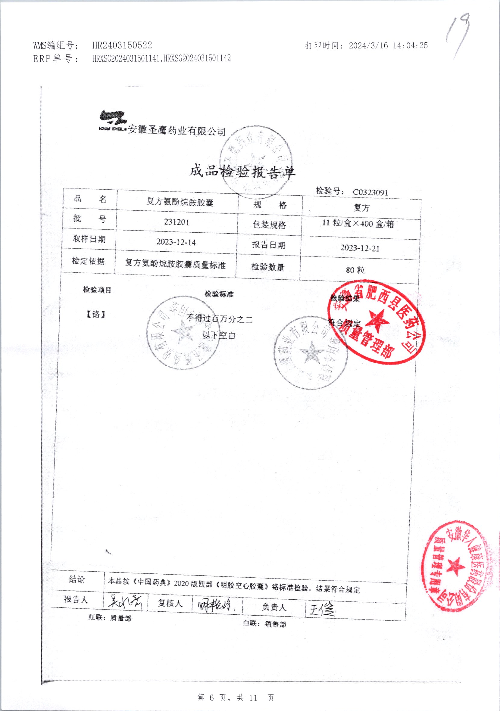 | 復方氨酚烷胺膠囊 | 11s*1 | 231201/2 | 查看詳情 |