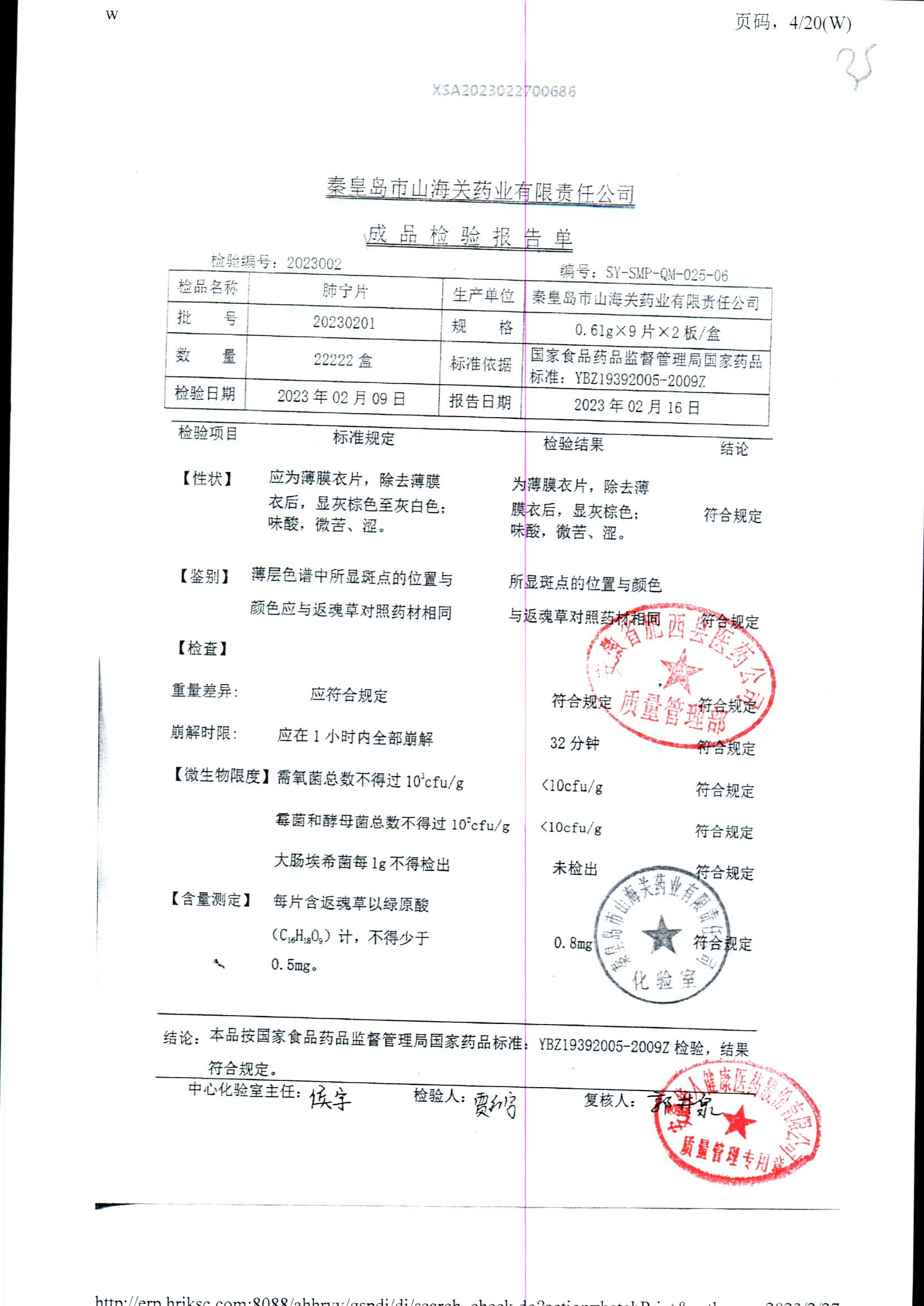| 肺寧片 | 0.61g*18s | 20230201 | 查看詳情 |