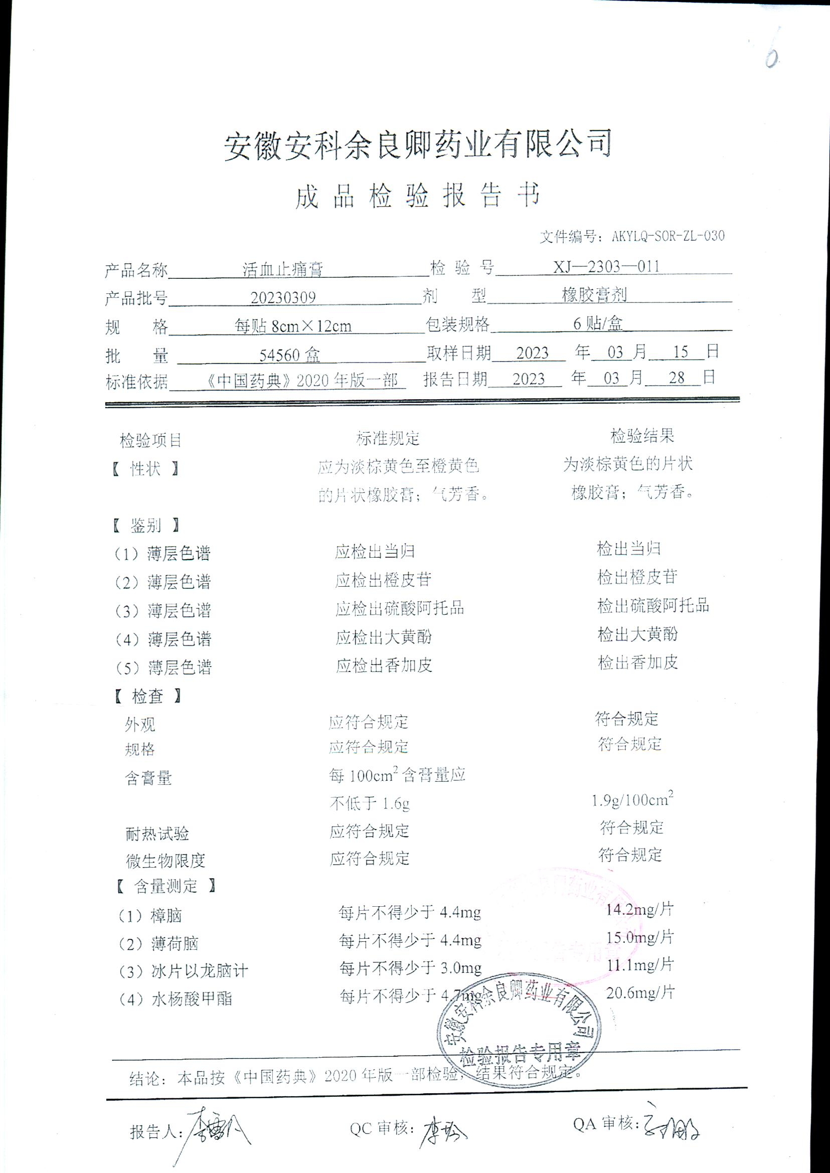 | 活血止痛膏 | 8cm*12cm*6貼 | 20230409 | 查看詳情 |