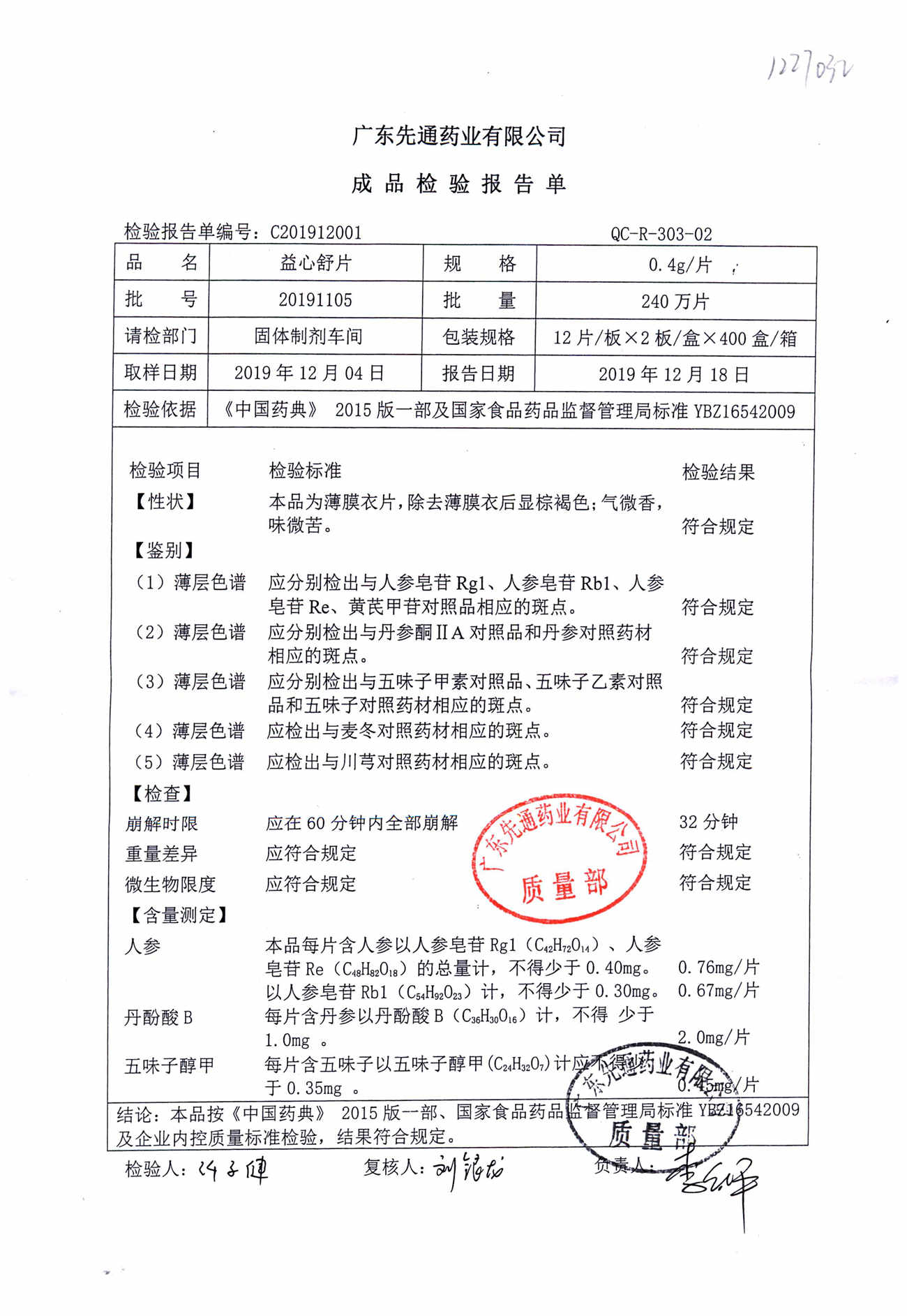 | 益心舒片 | 0.4g*24s | 20191105 | 查看詳情 |