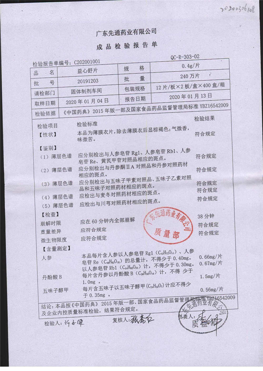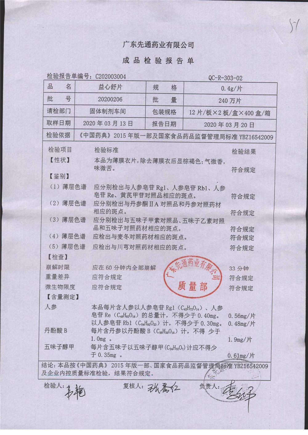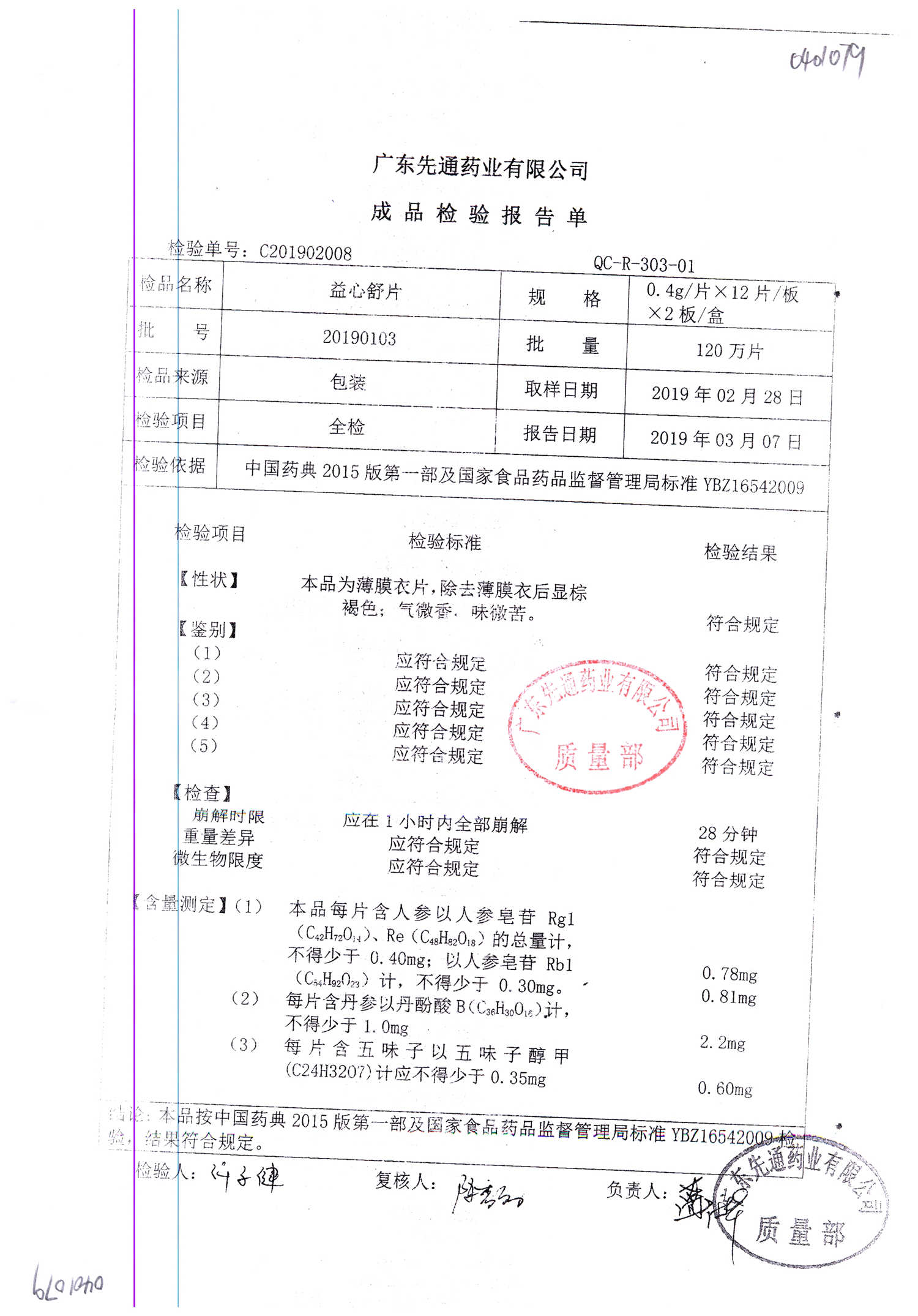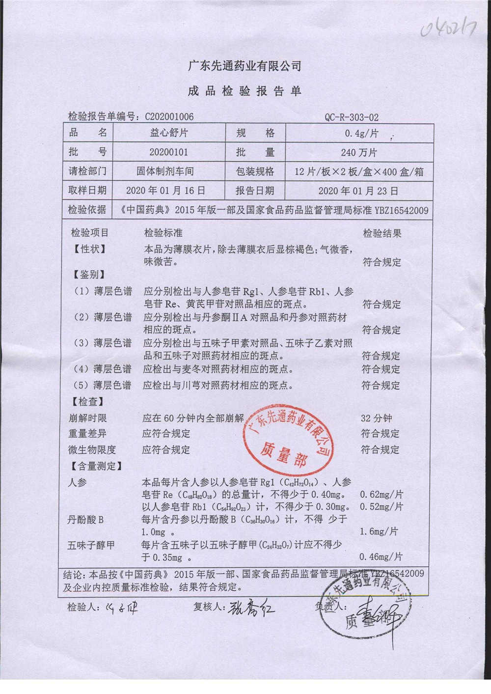 | 益心舒片 | 0.4g*24s | 20200604 | 查看詳情 |