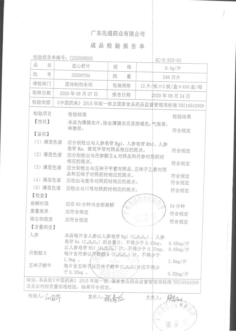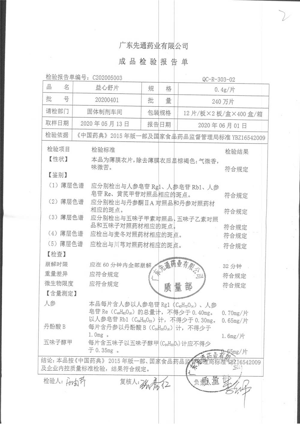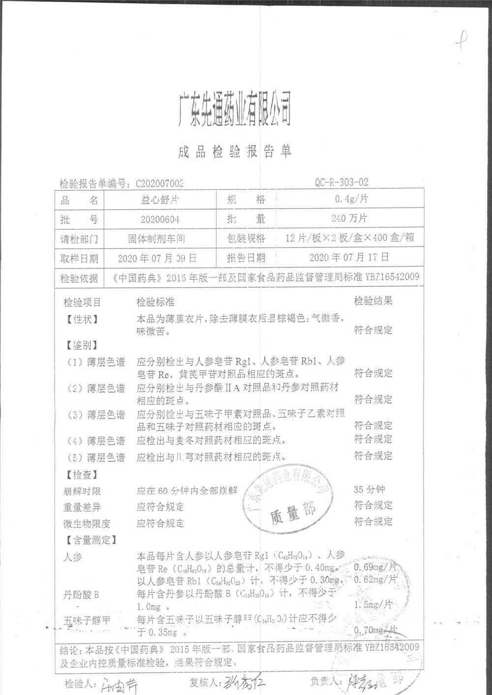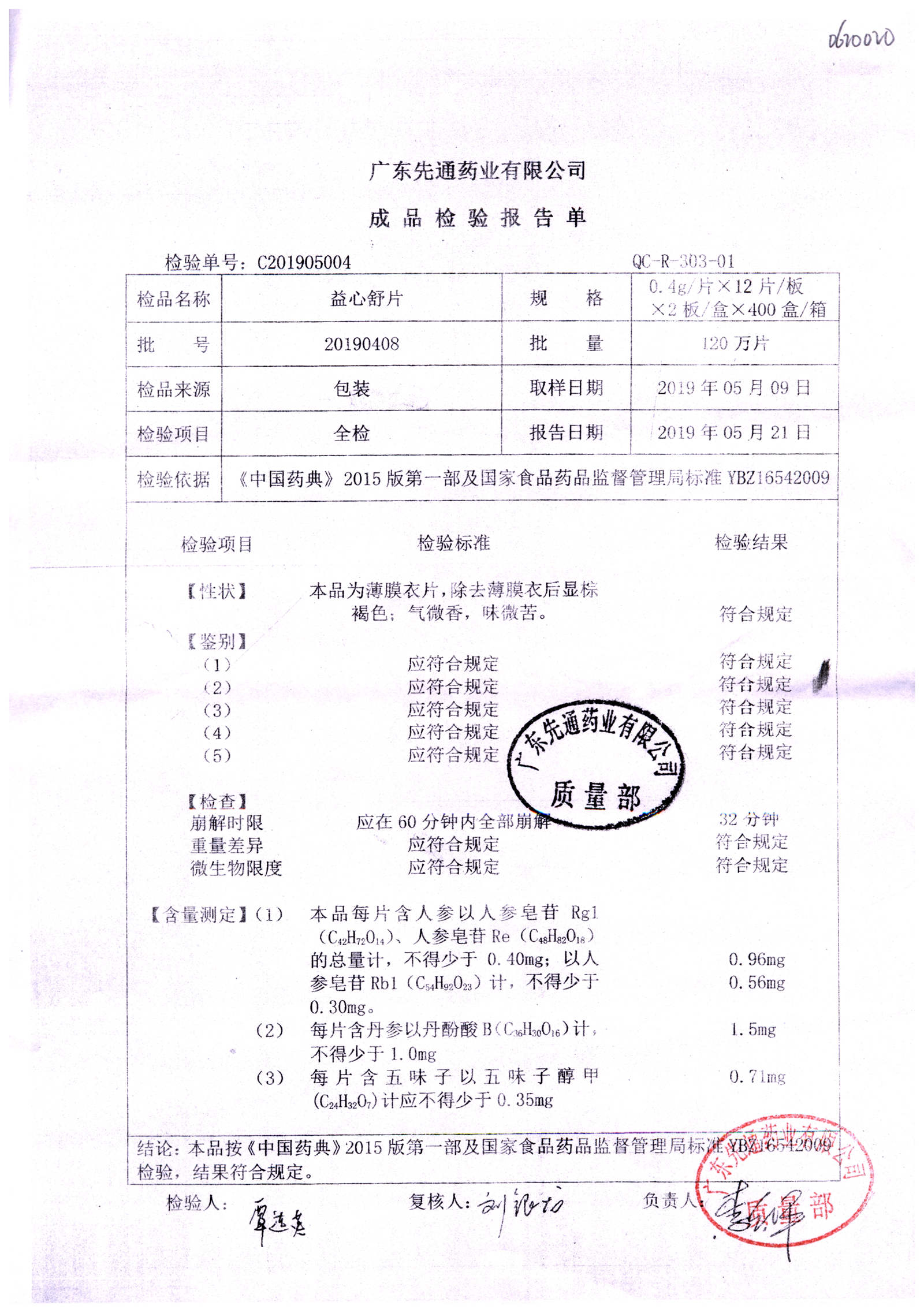 | 益心舒片 | 0.4g*24s | 20200604 | 查看詳情 |