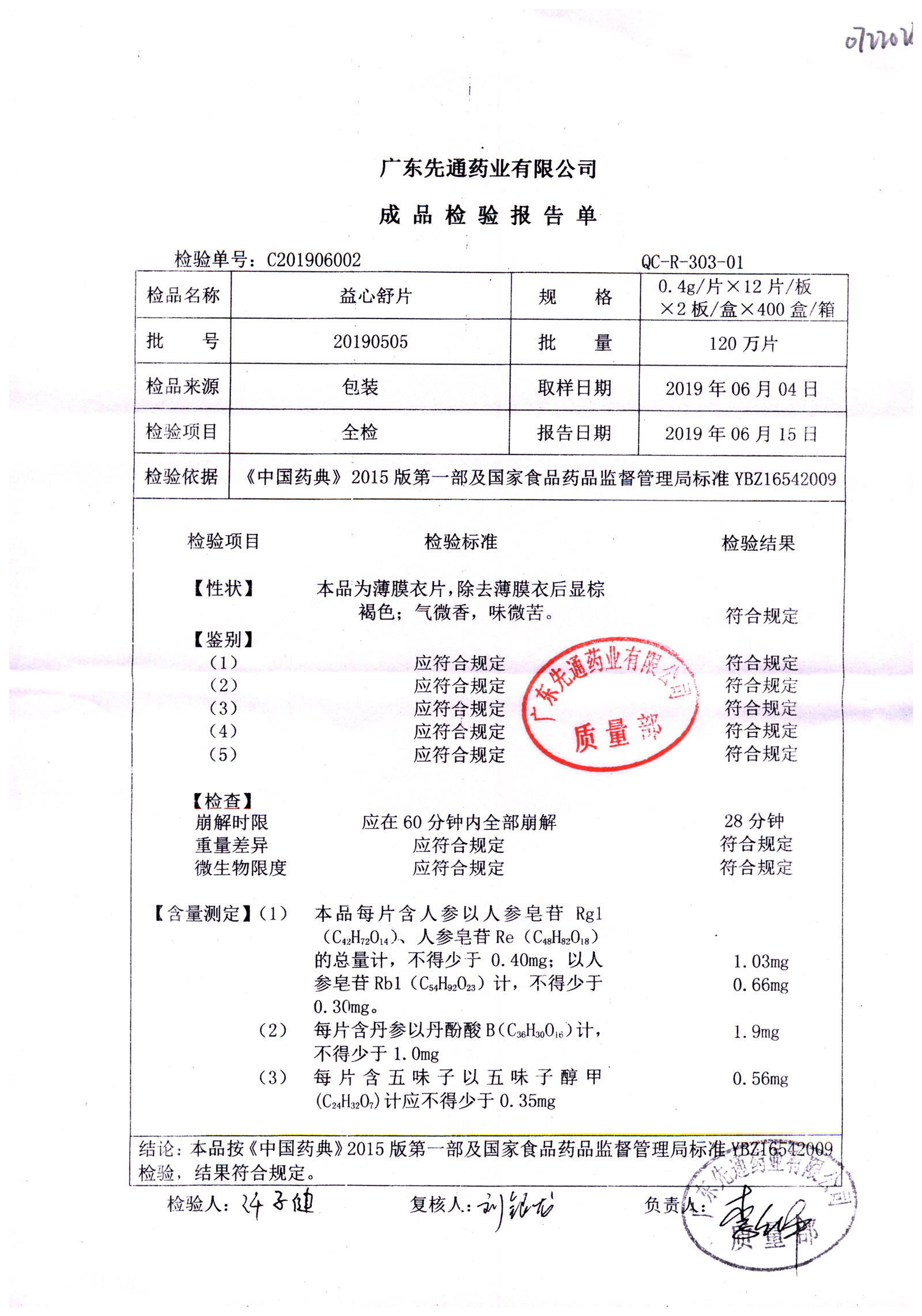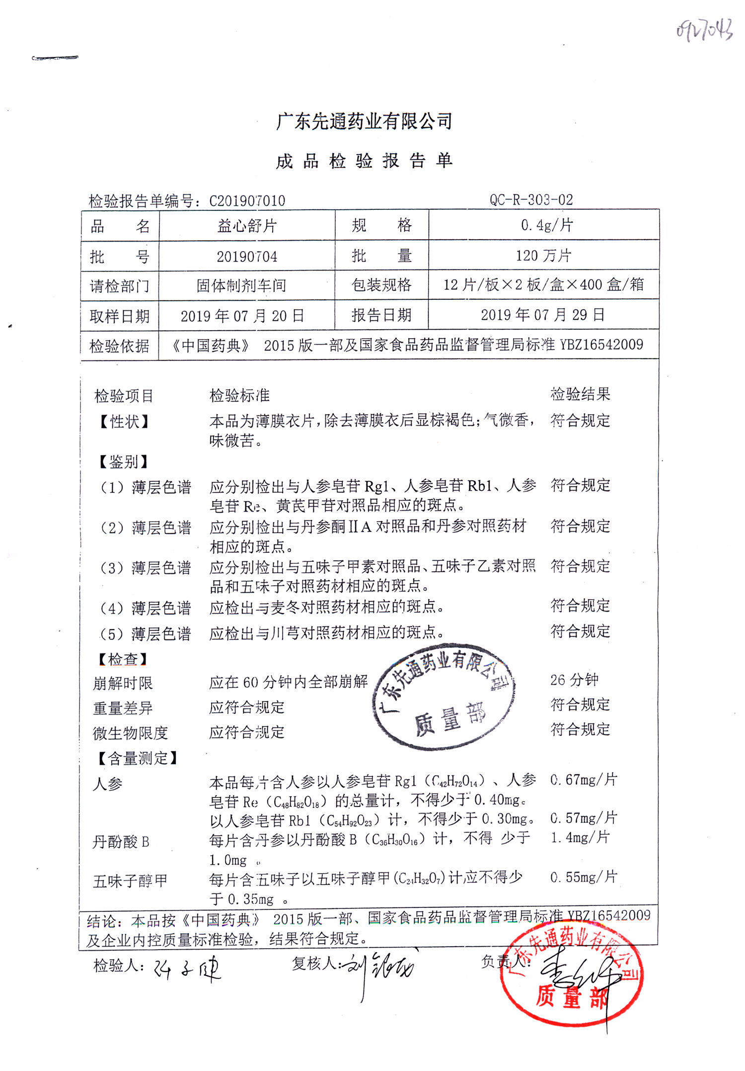 | 益心舒片 | 0.4g*24s | 20190704 | 查看詳情 |