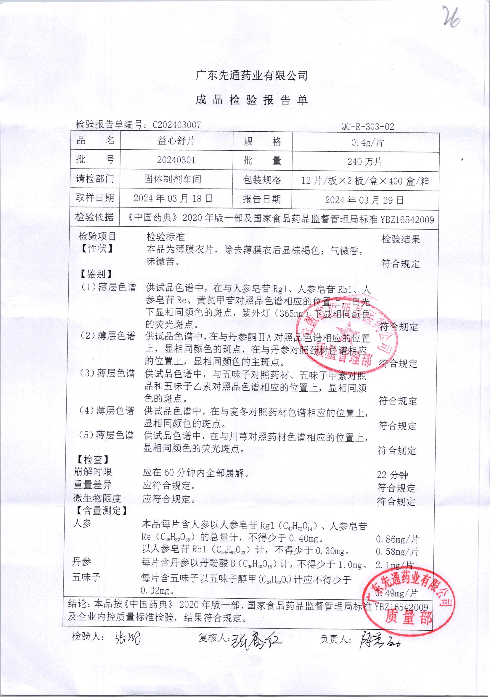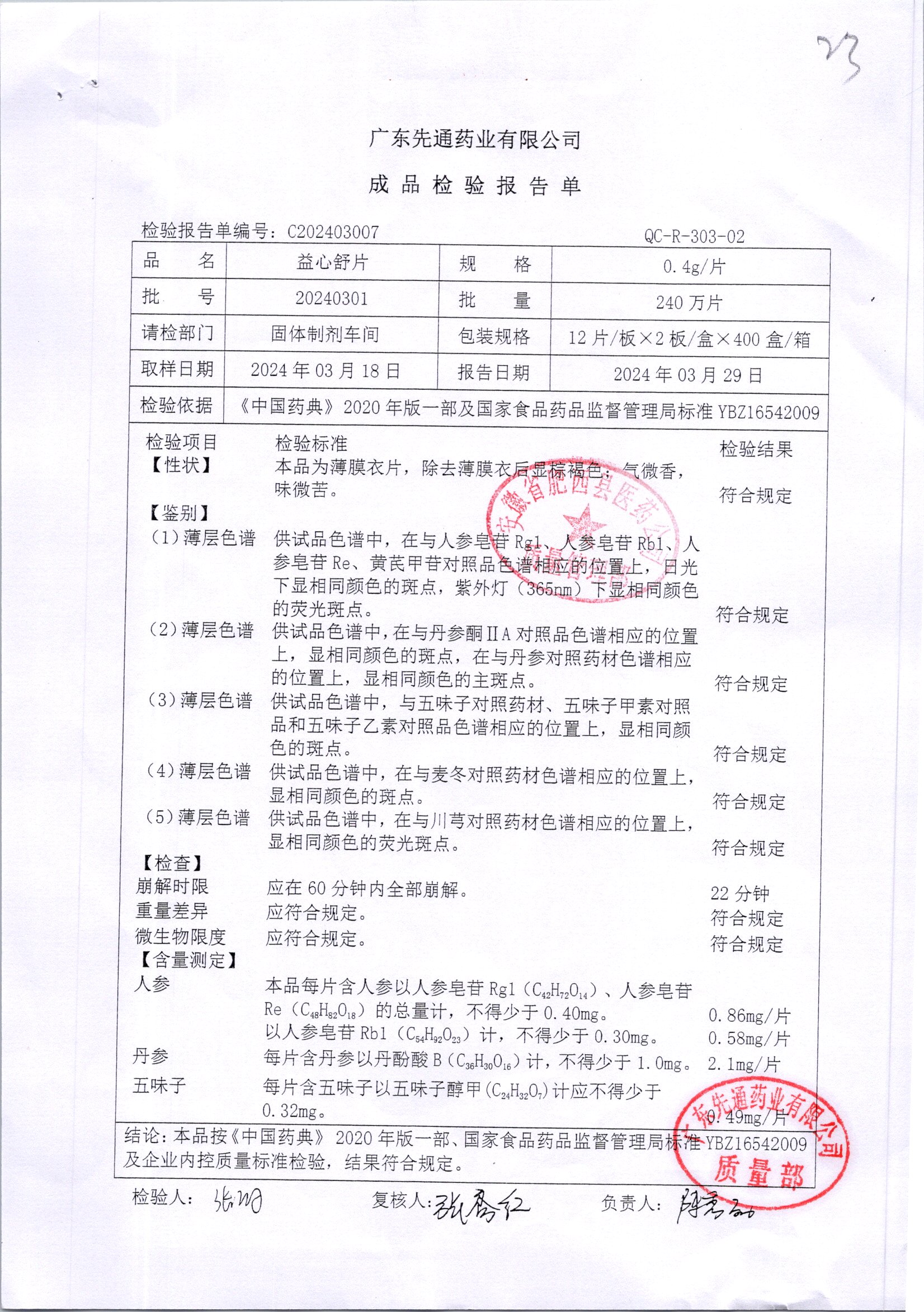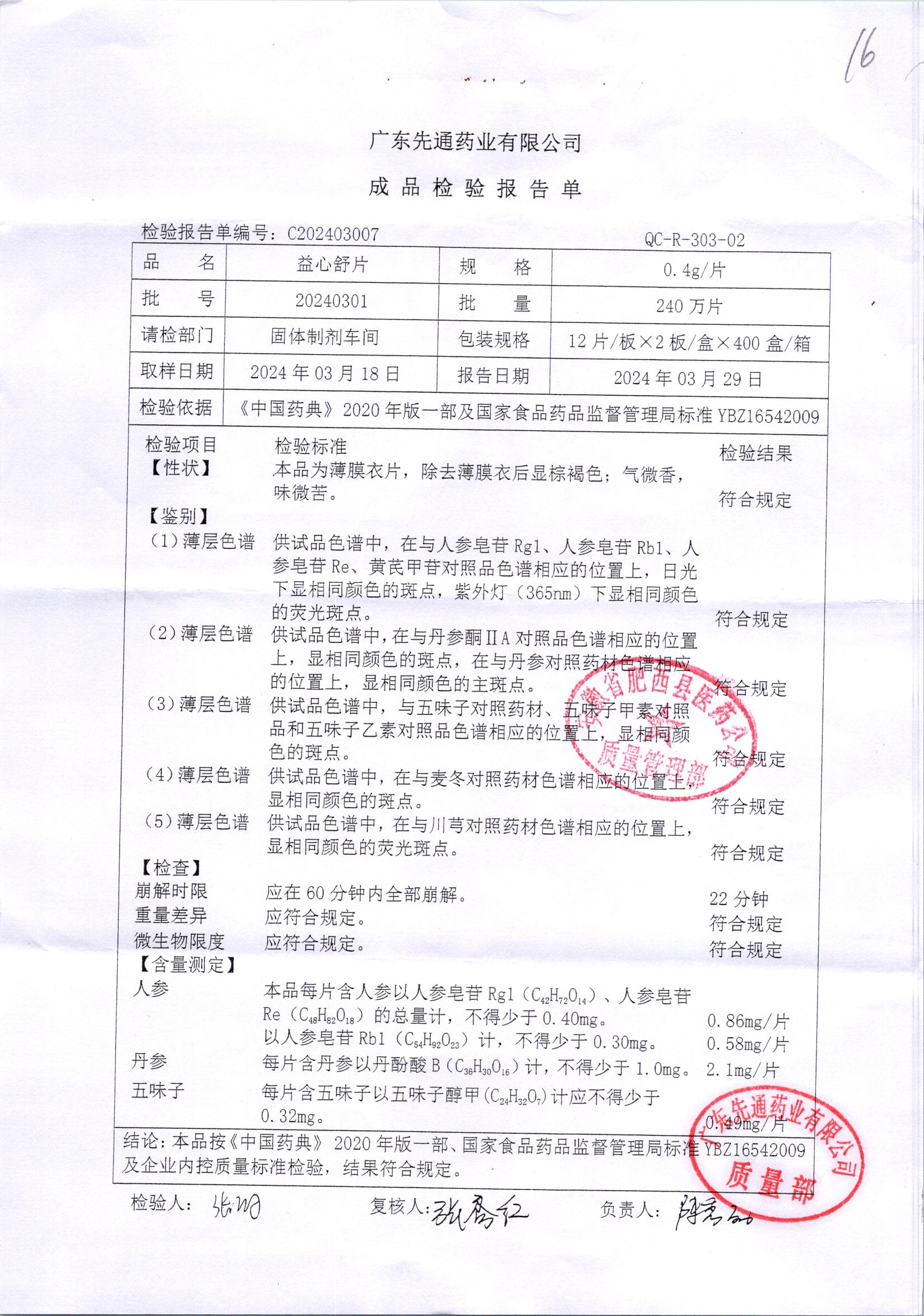 | 益心舒片 | 0.4g*24s | 20240301 | 查看詳情 |