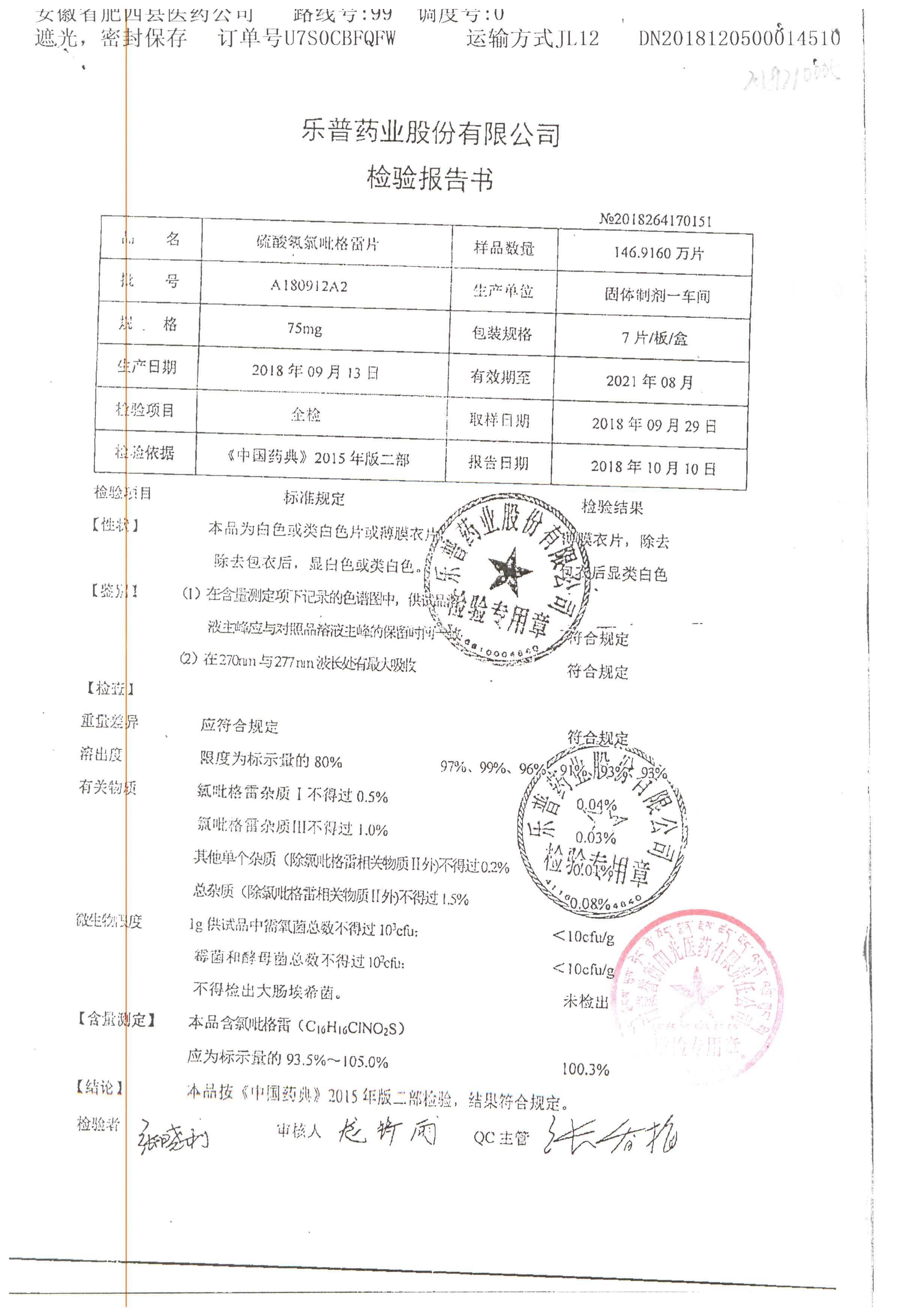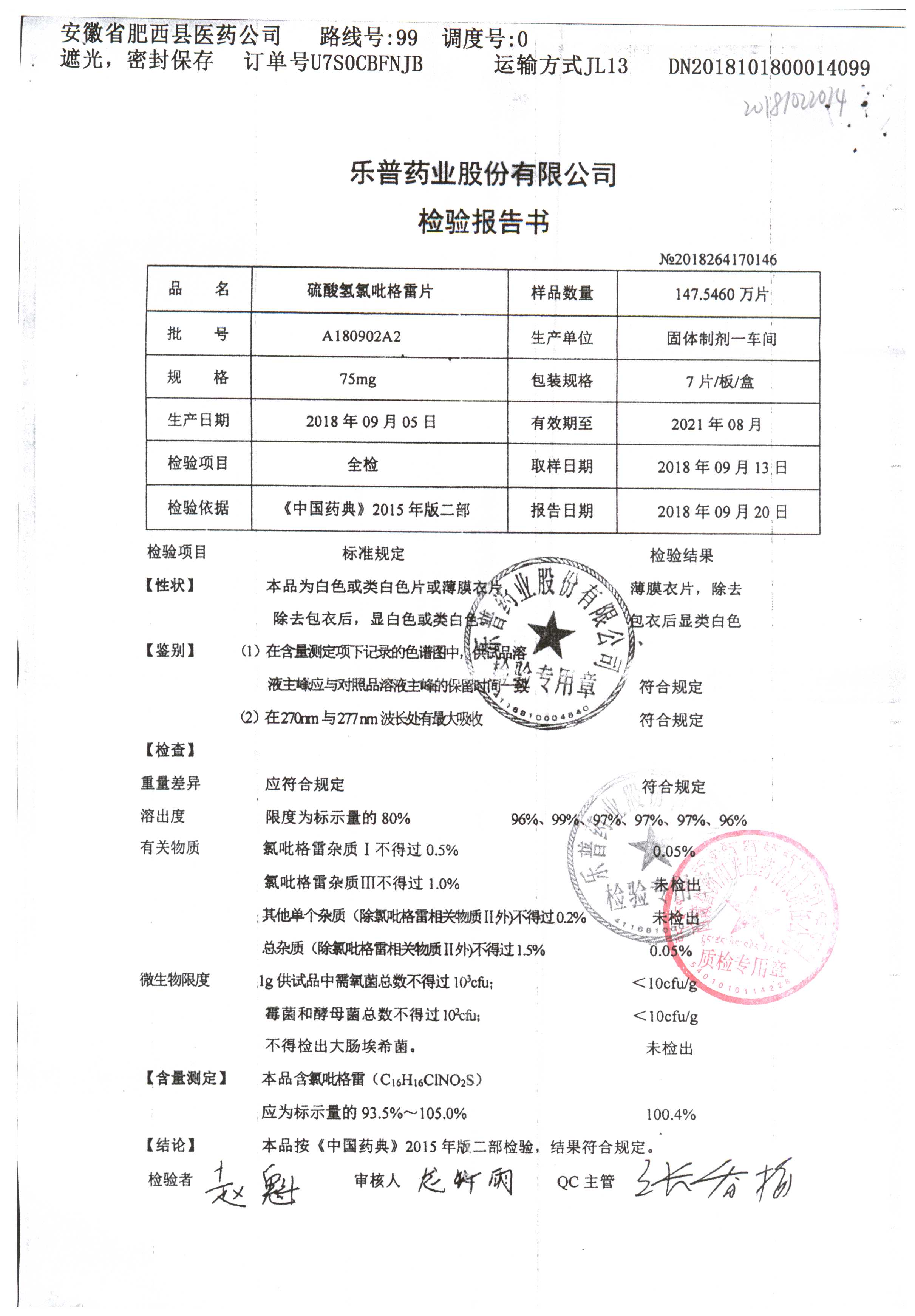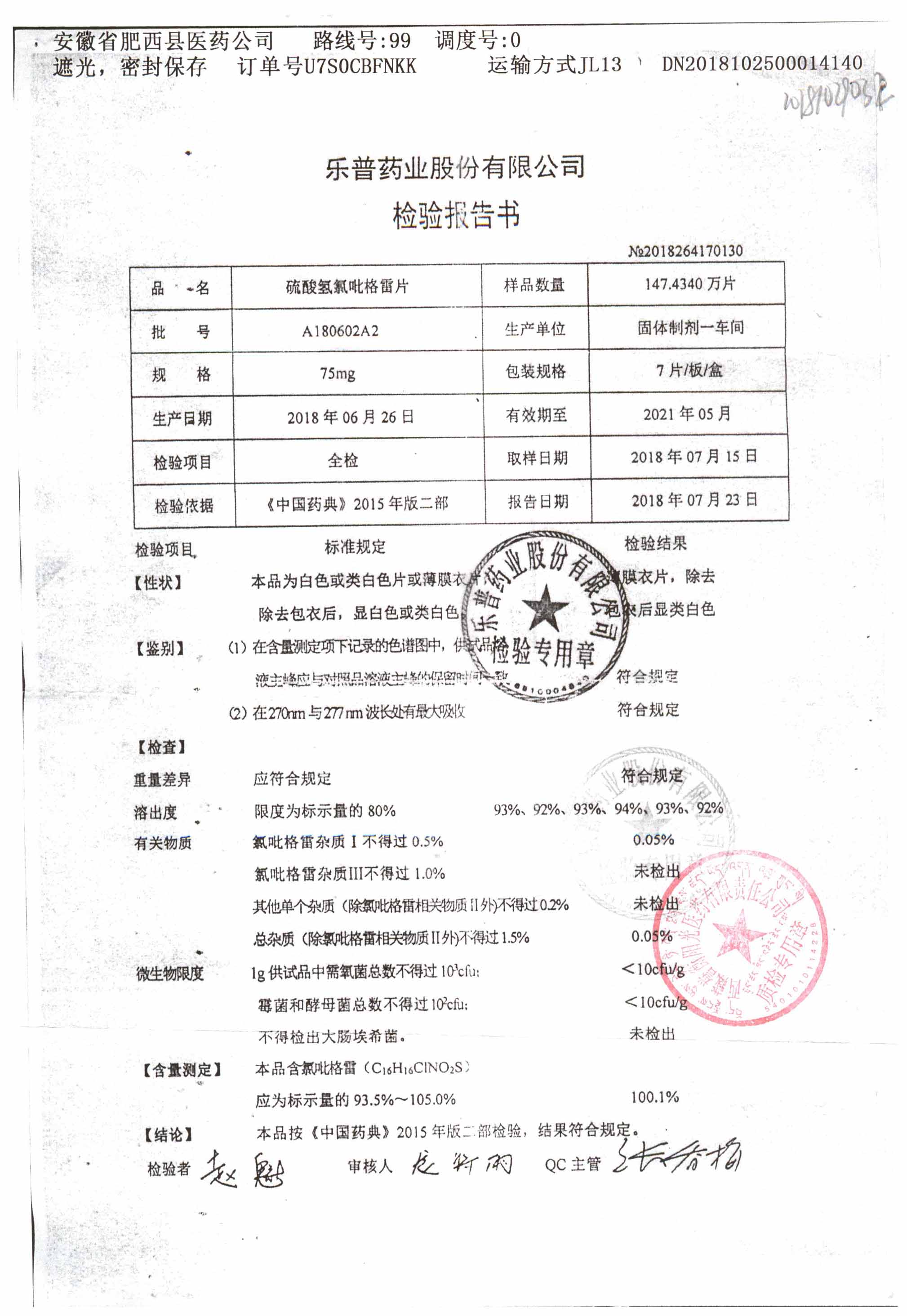 | 硫酸氫氯吡格雷片 | 75mg*7片 | A180902A2 | 查看詳情 |